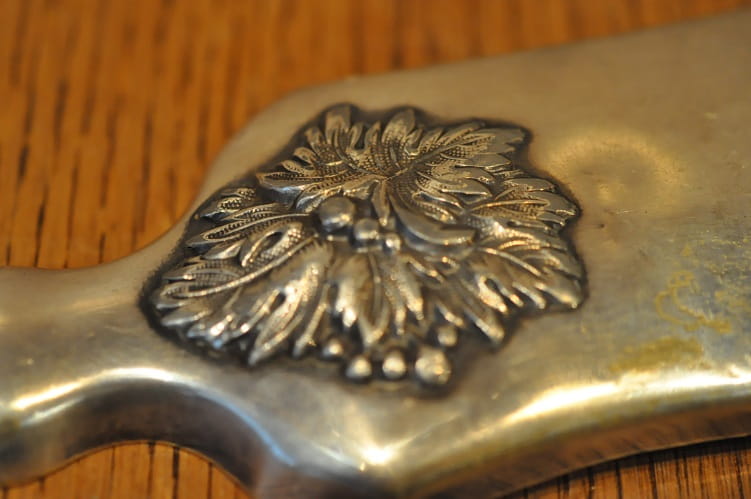 Przedmiot w pierwotnym srebrzeniu z niewielkimi przetarciami powłoki głównie na wyobleniach.