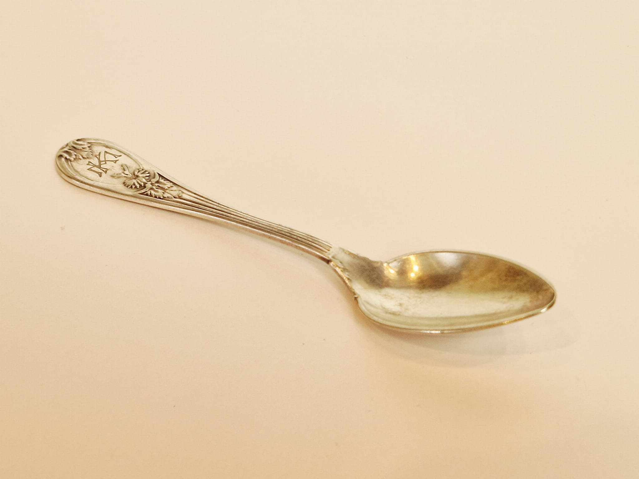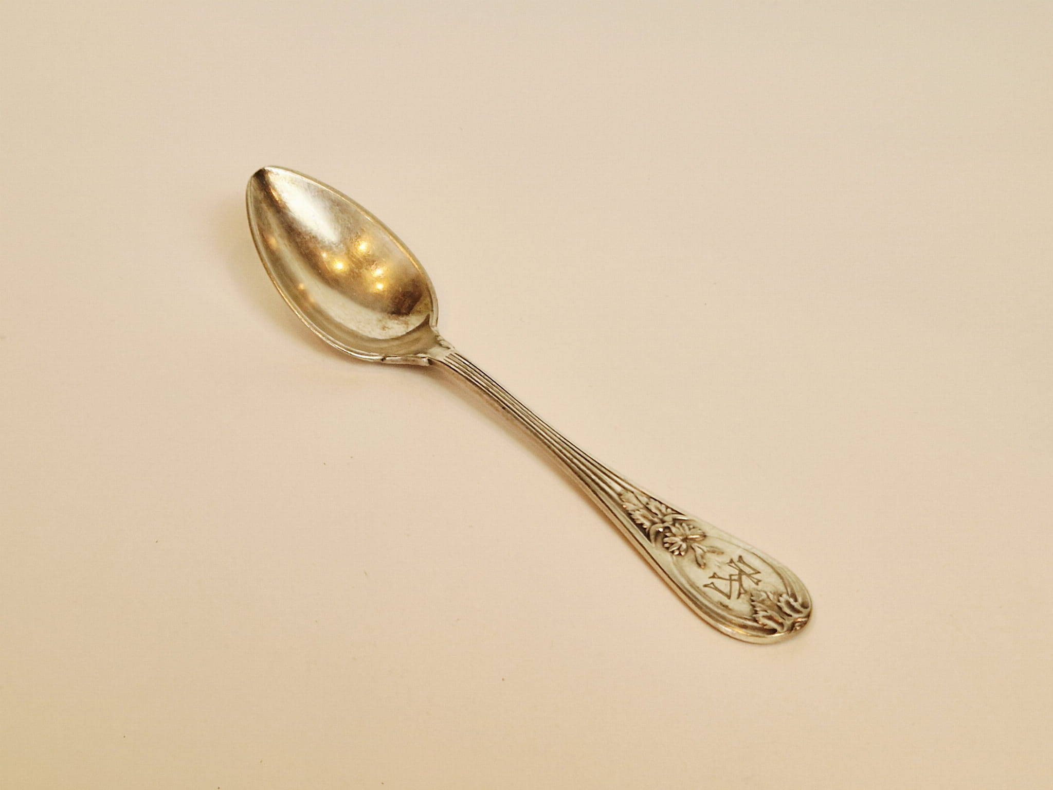 ZABYTKOWA (1896-1900) MASYWNA (41 g) POSREBRZANA ŁYŻECZKA DO HERBATY (14,8 cm) ... z monogramem