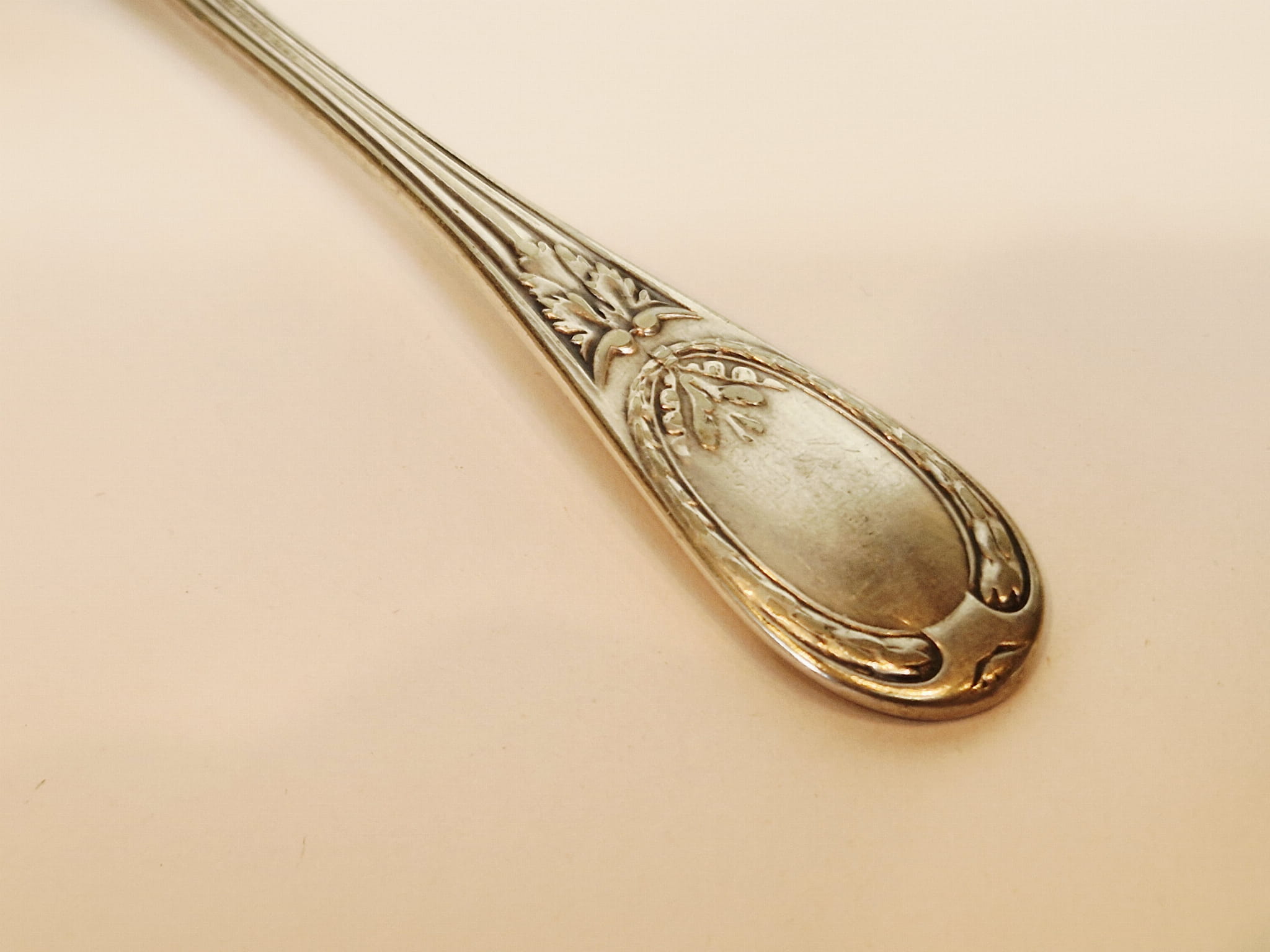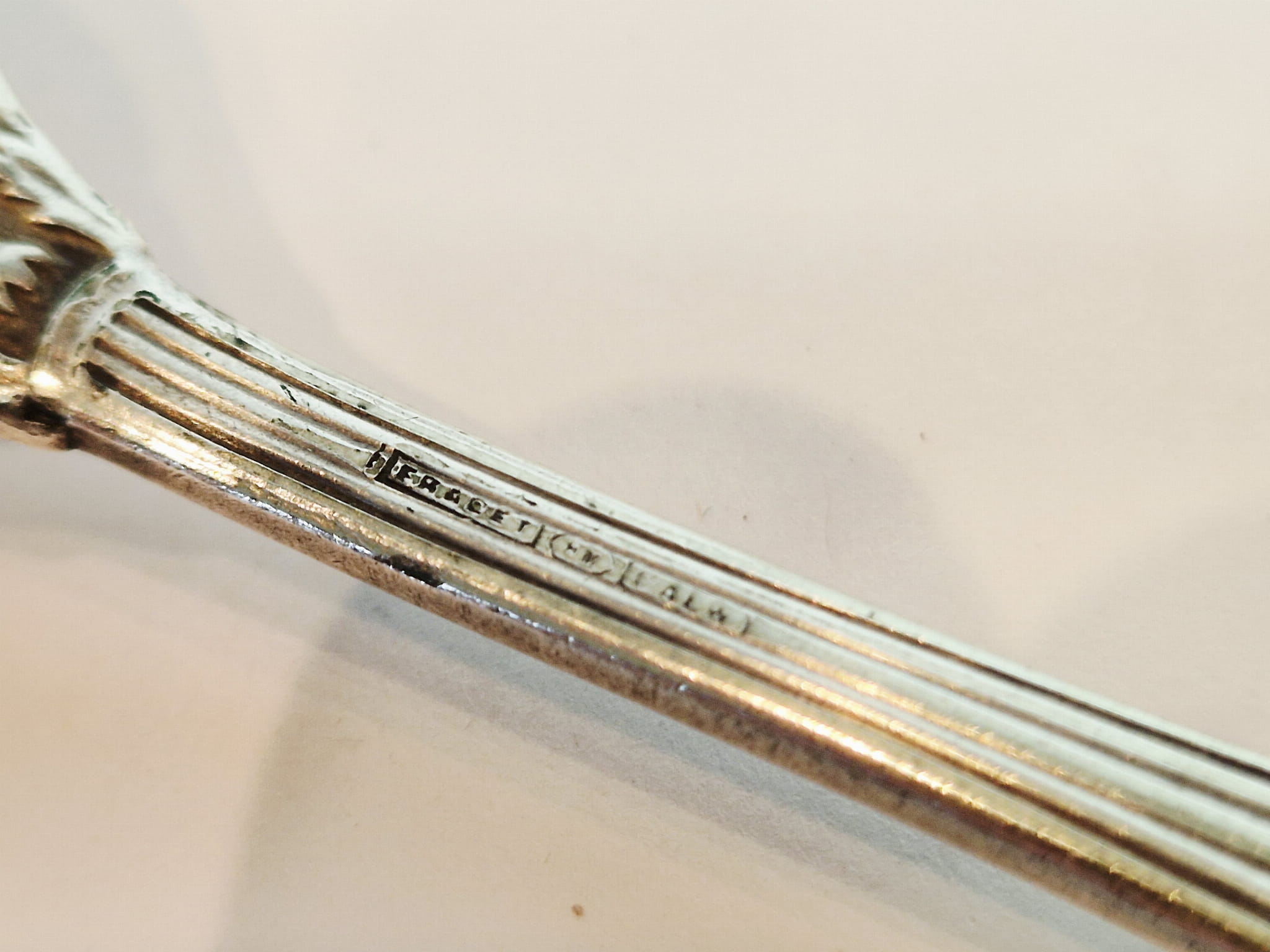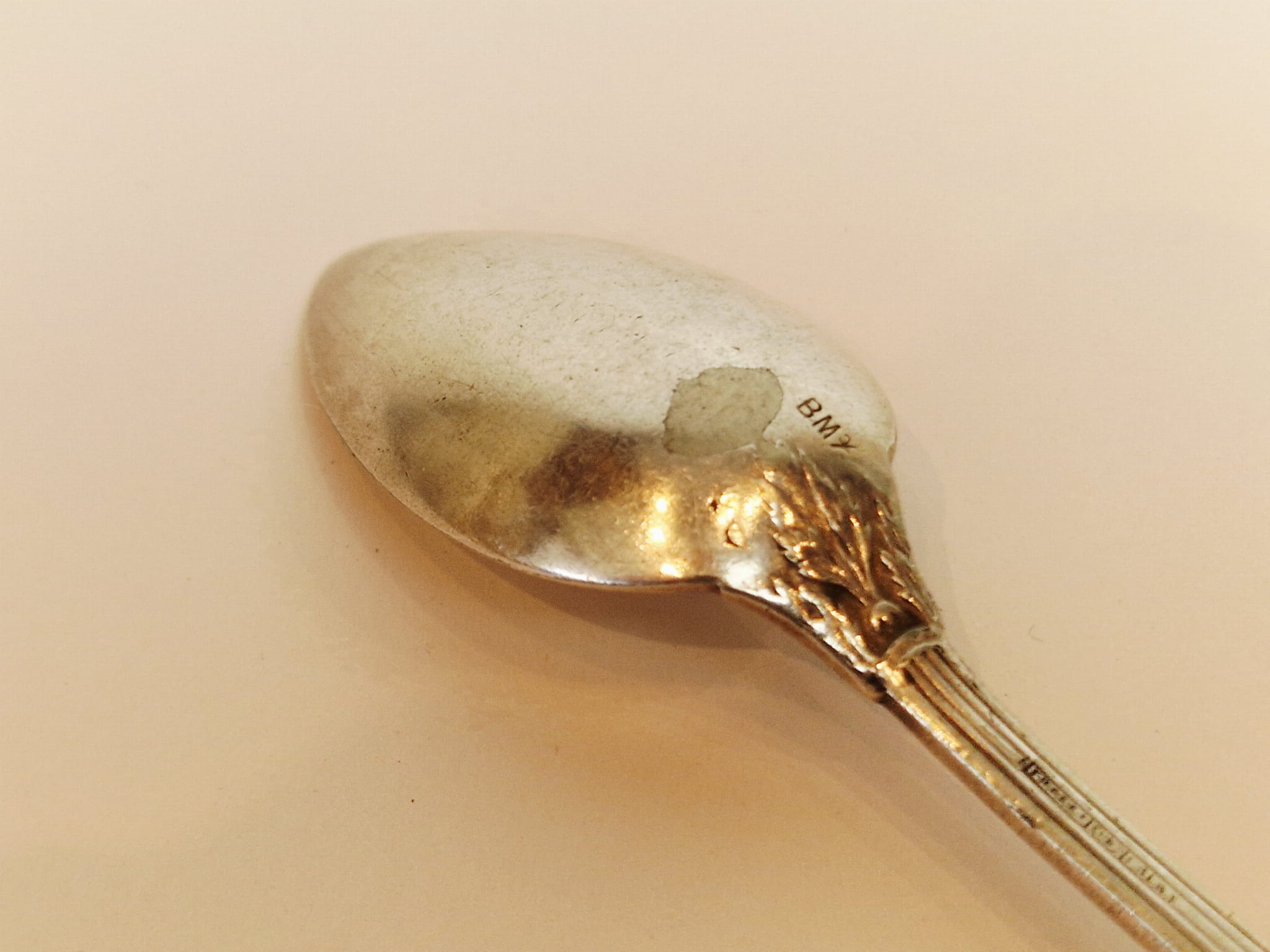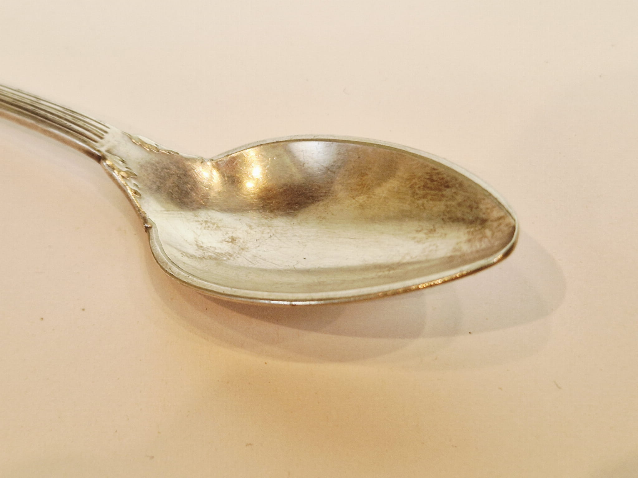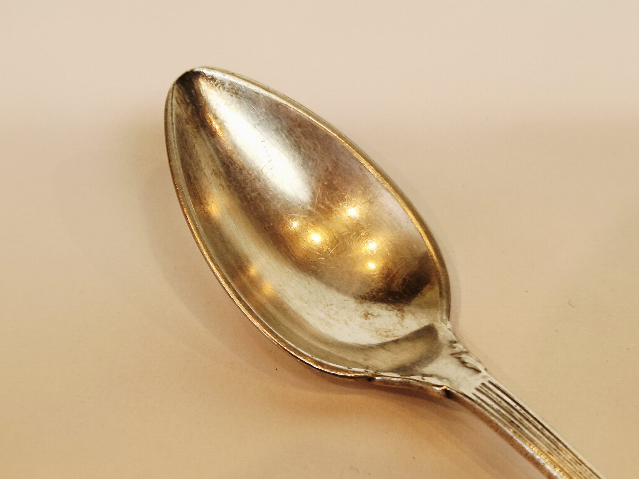 Pierwotne srebrzenie z wytarciem powłoki na spodzie czerpaka.
