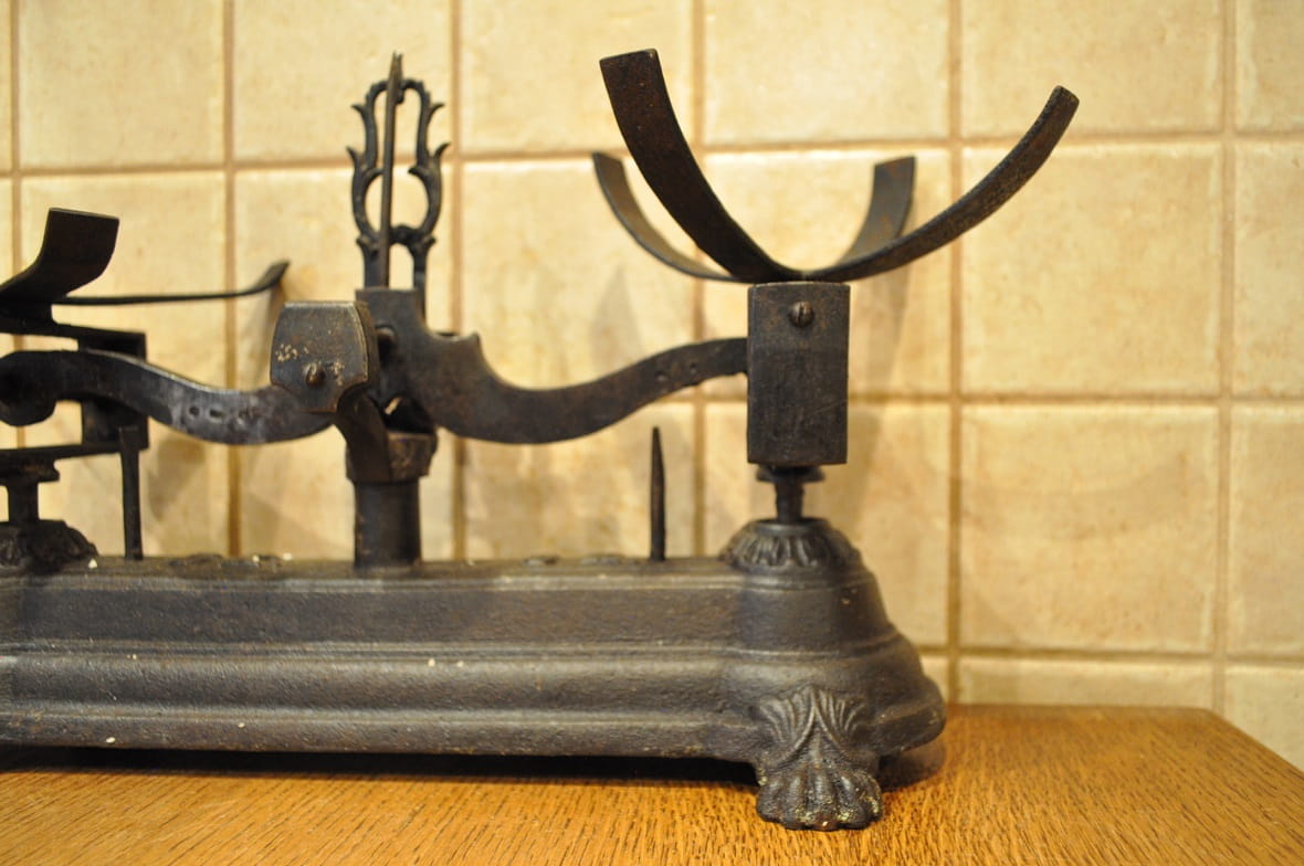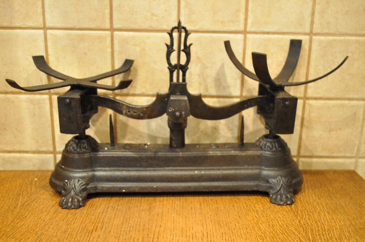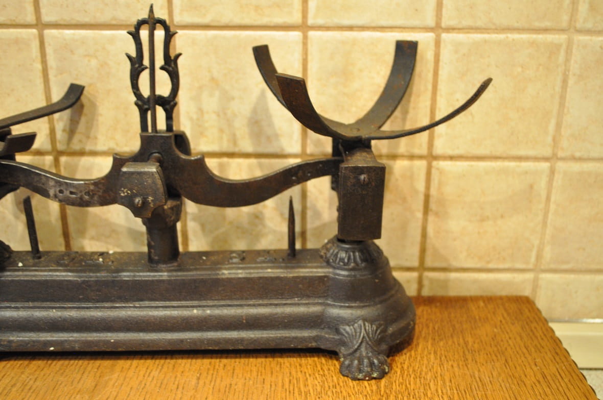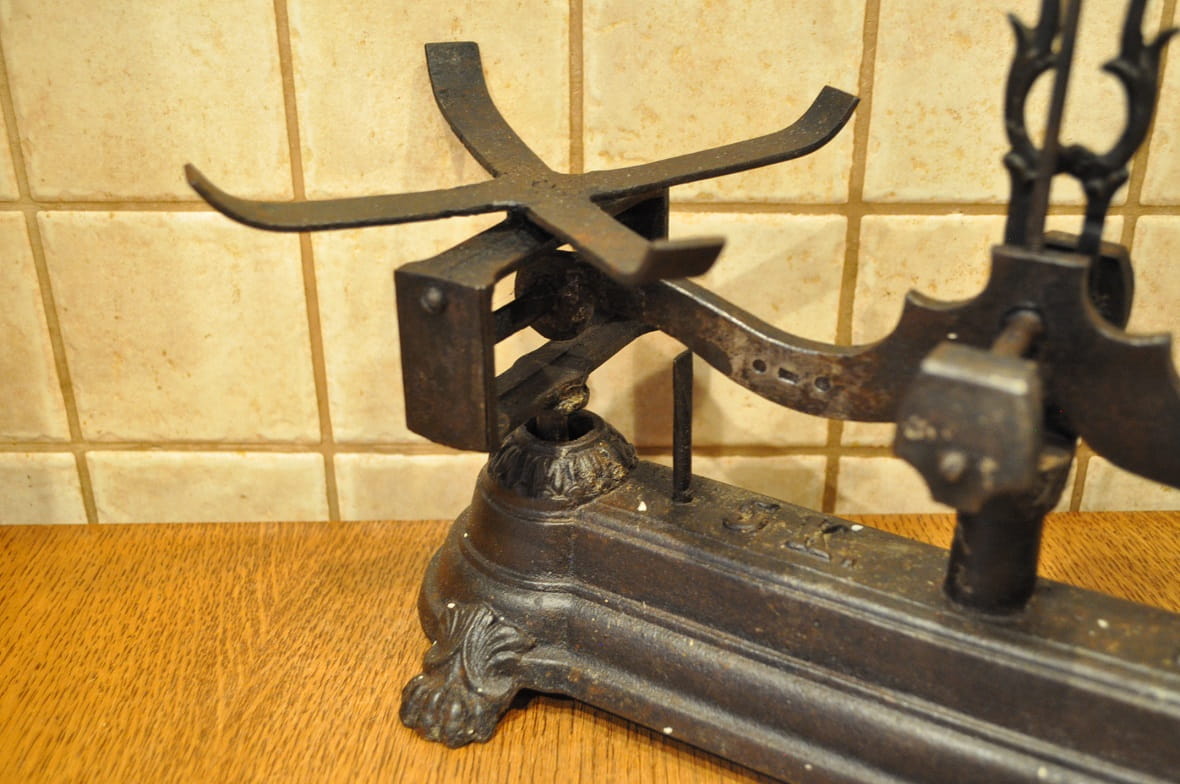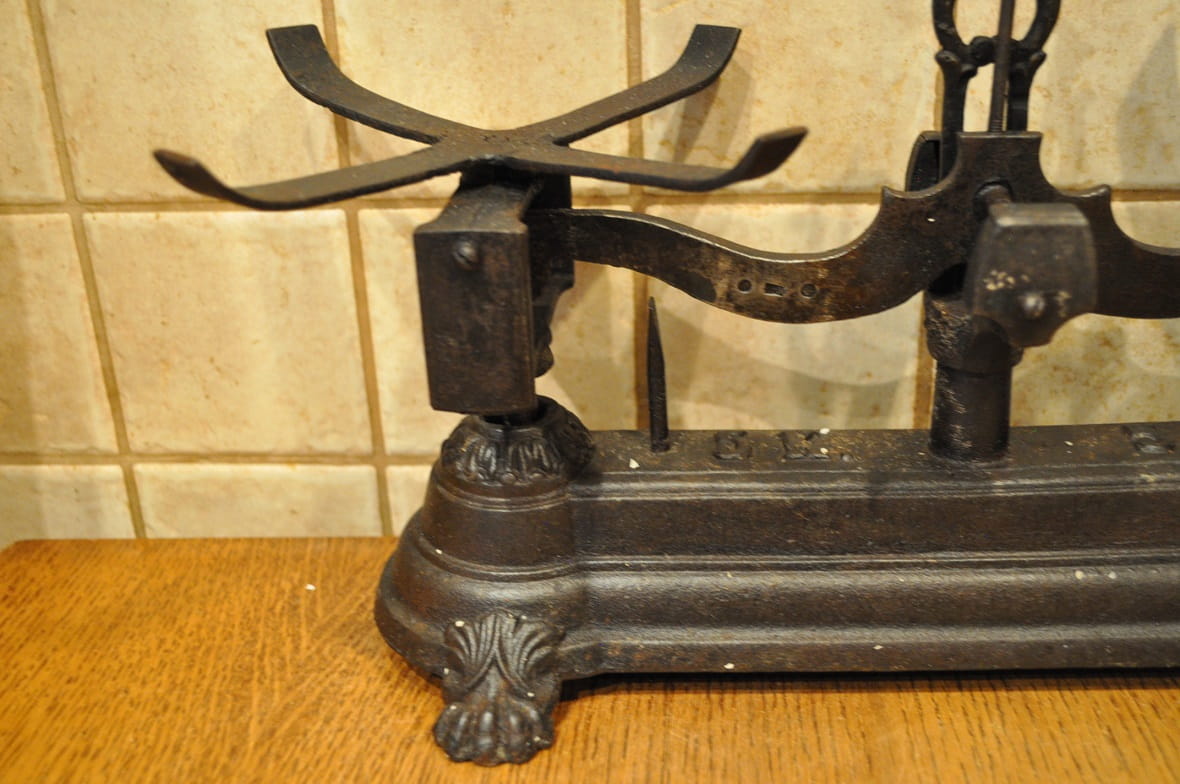 Stelaż wagi żeliwny, z ozdobnymi gniazdami belek pionowych, wsparty na 4-ch stylizowanych "łapach"...