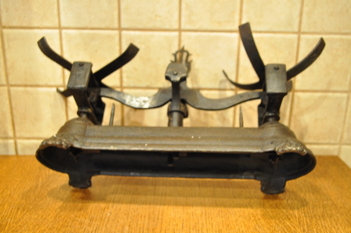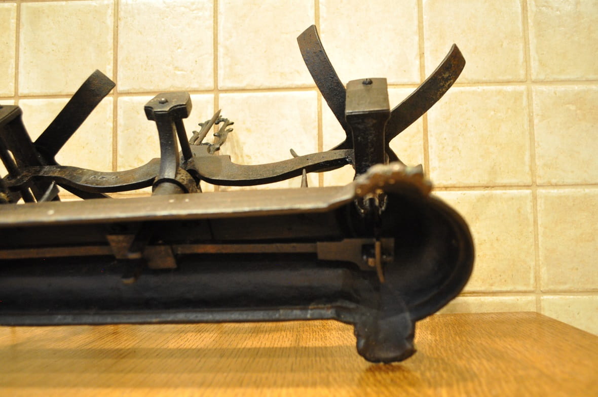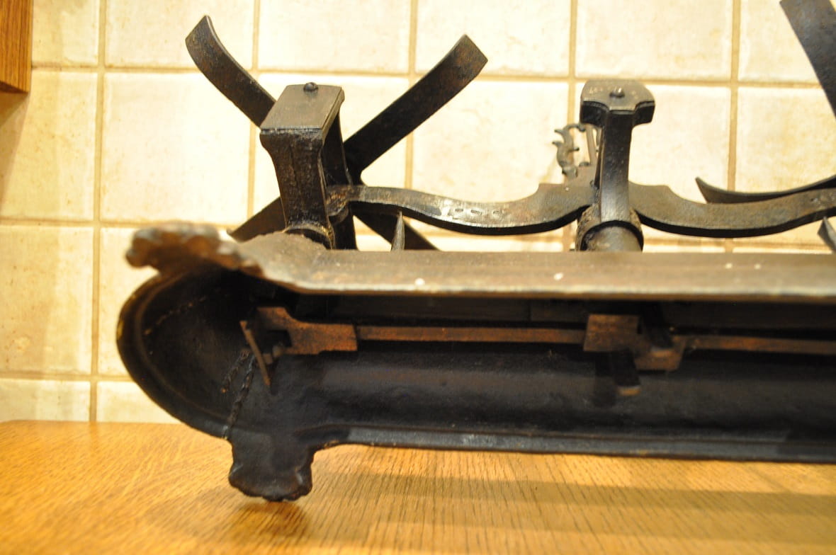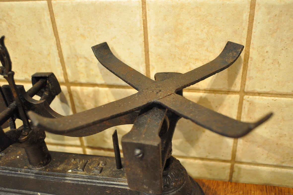 Stelaż wagi żeliwny, z ozdobnymi gniazdami belek pionowych, wsparty na 4-ch stylizowanych "łapach"...