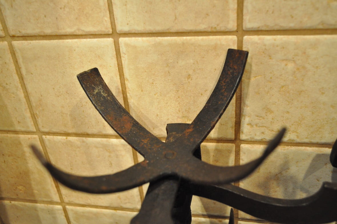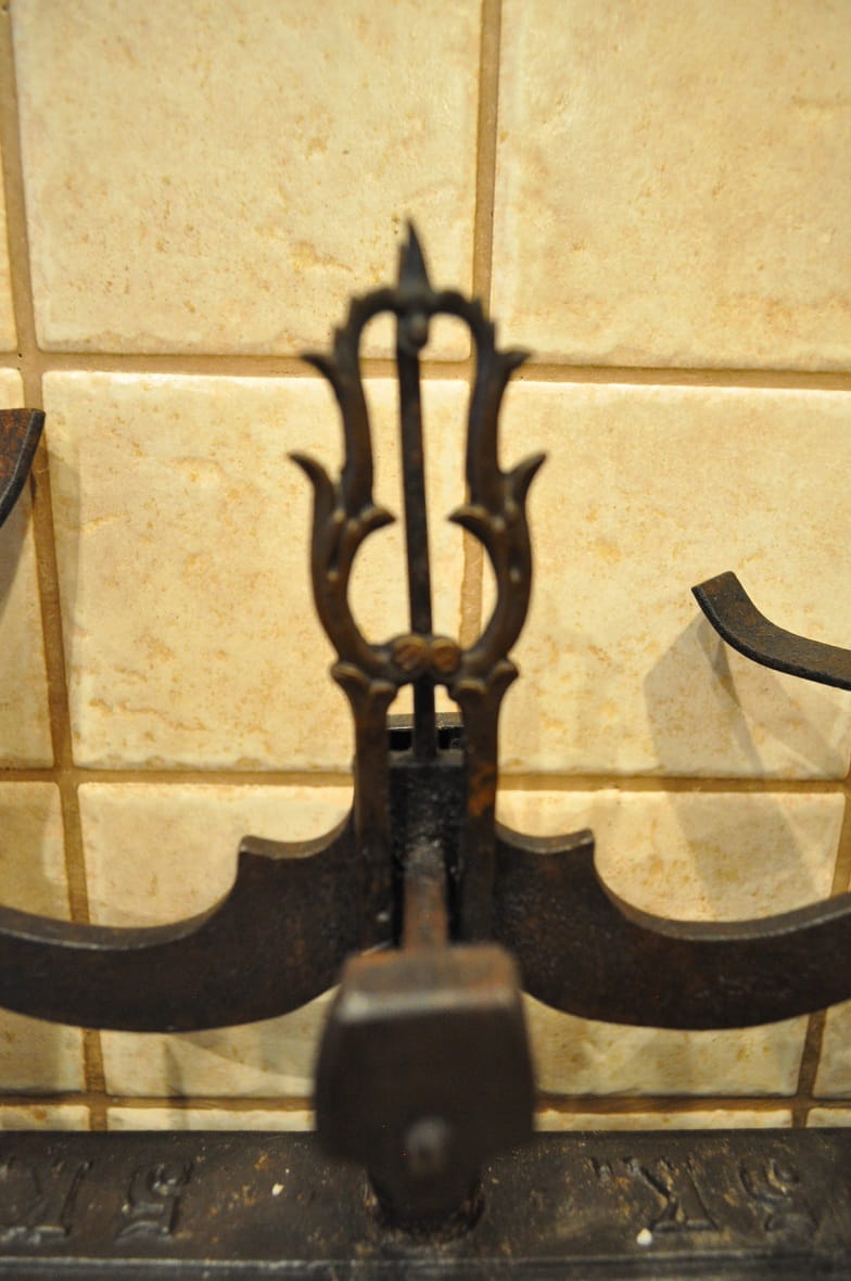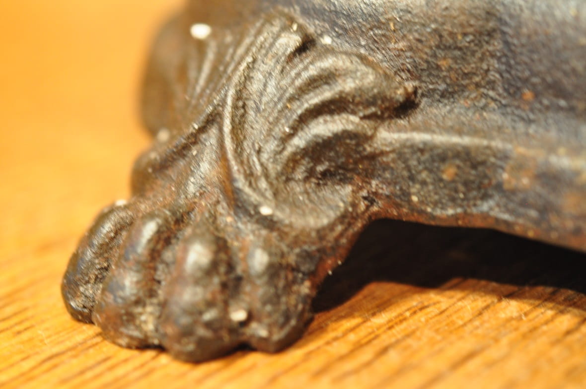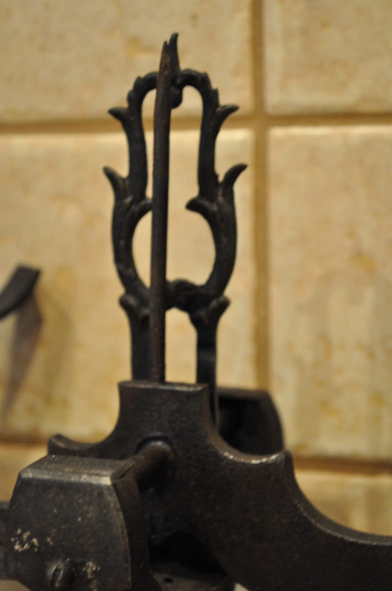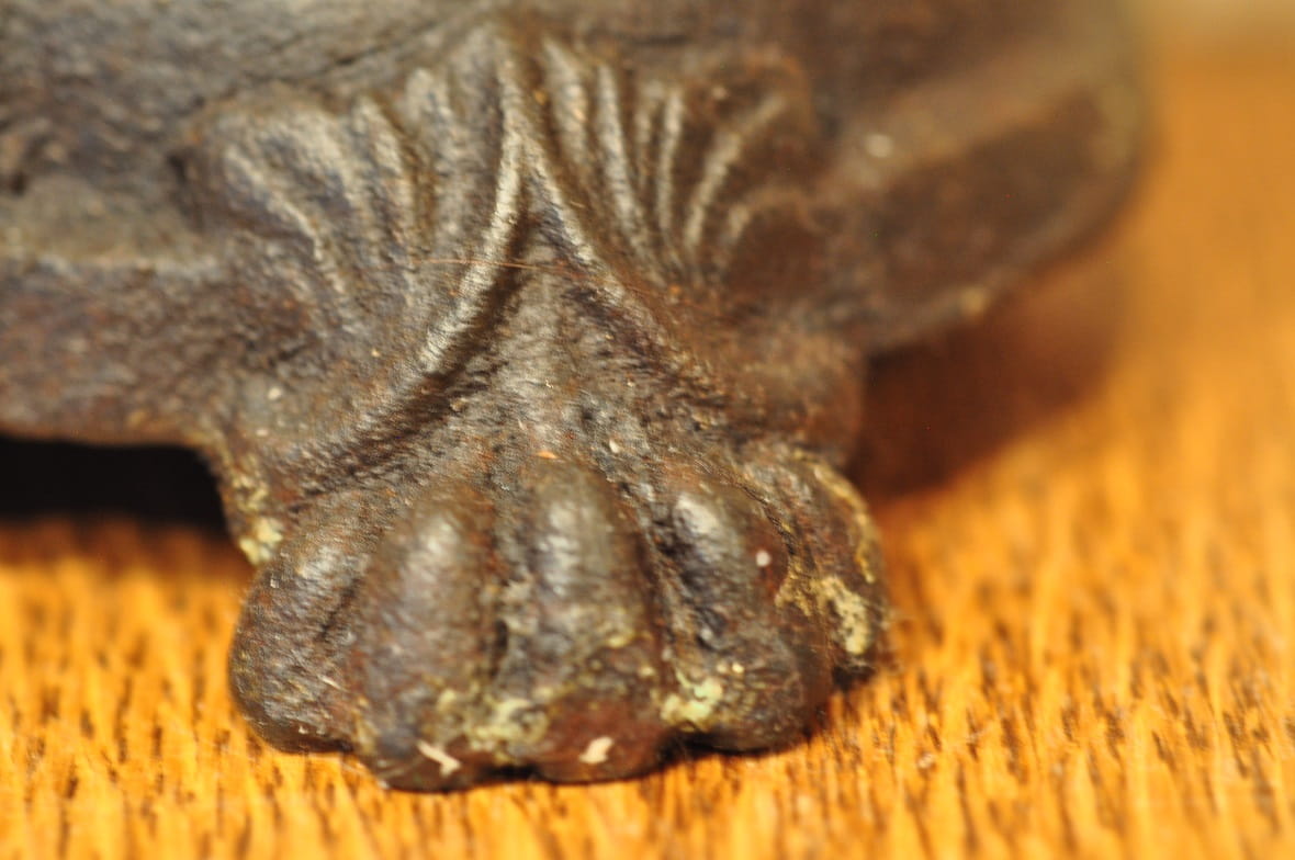 Stelaż wagi żeliwny, z ozdobnymi gniazdami belek pionowych, wsparty na 4-ch stylizowanych "łapach"...
