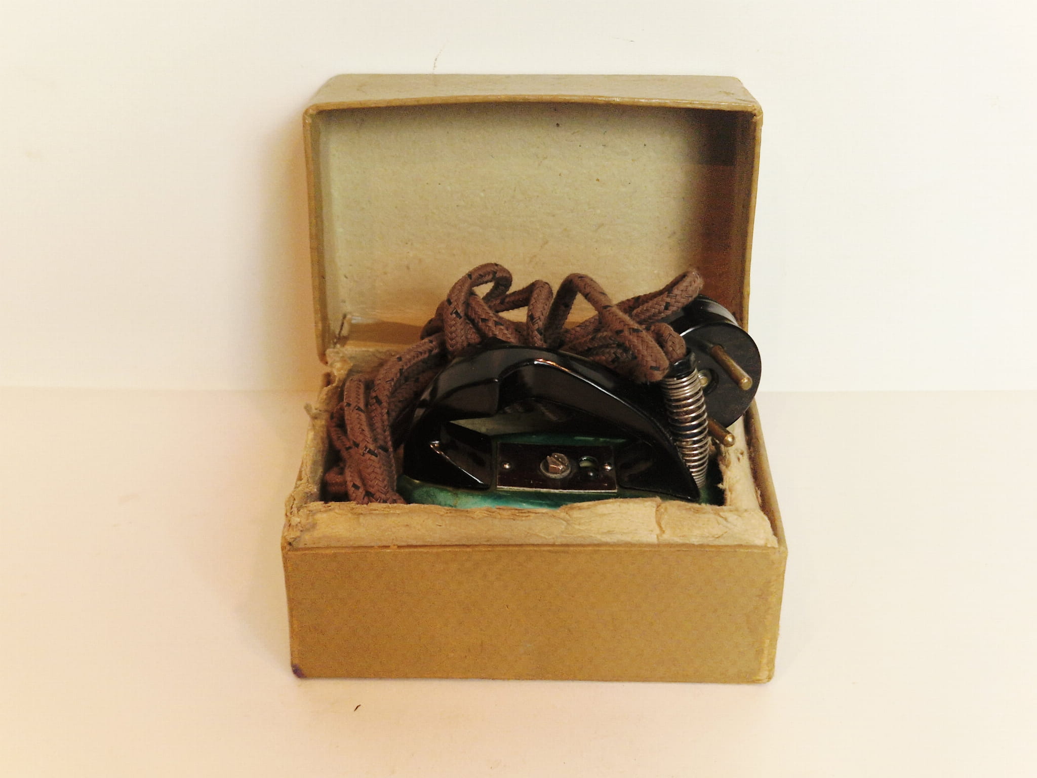 ZABYTKOWE (1965) MAŁE (10,9 cm / 675 g) ŻELAZKO ELEKTRYCZNE W ORYGINALNYM PUDEŁKU HANDLOWYM