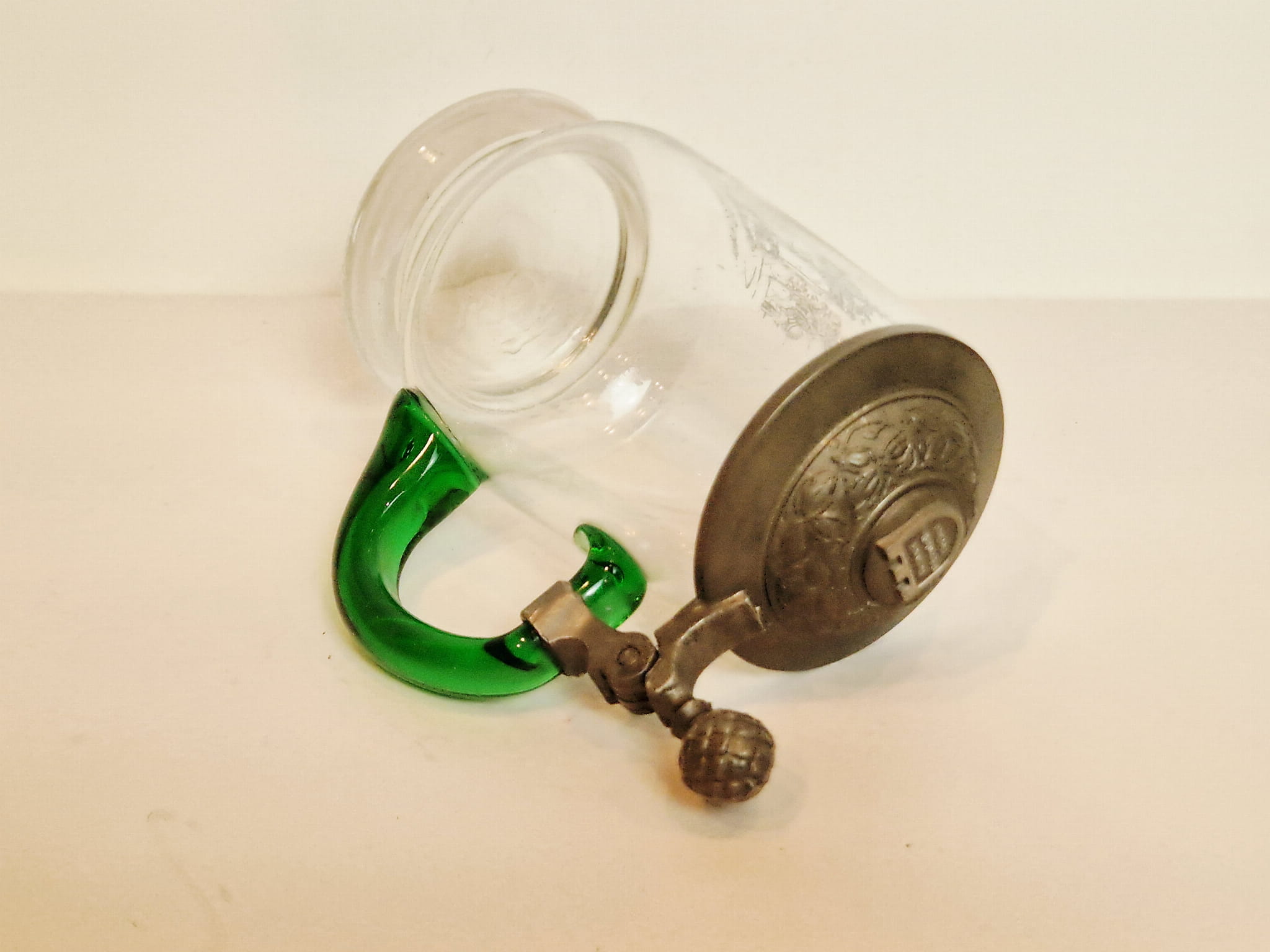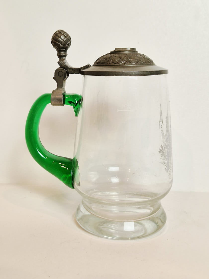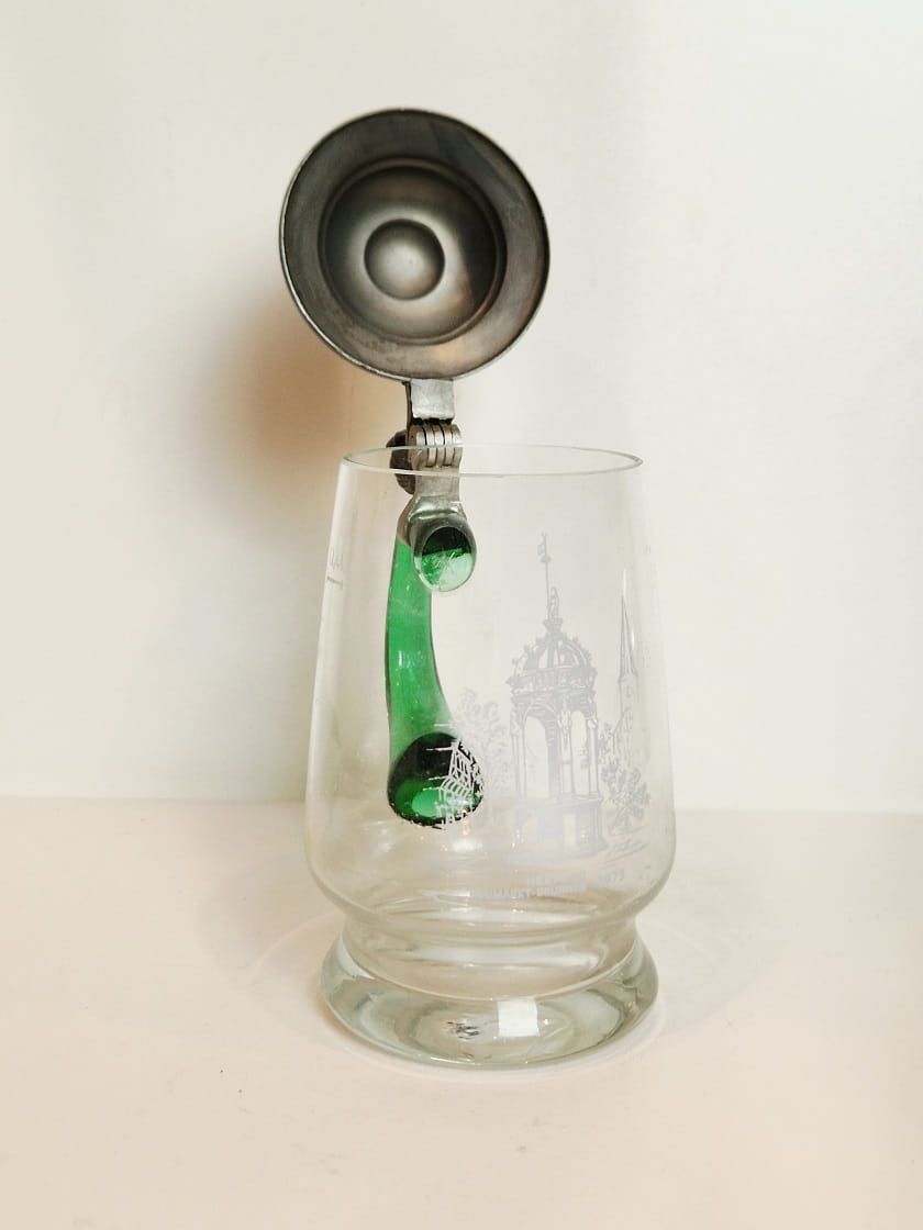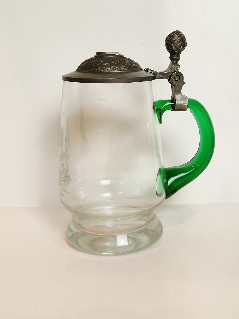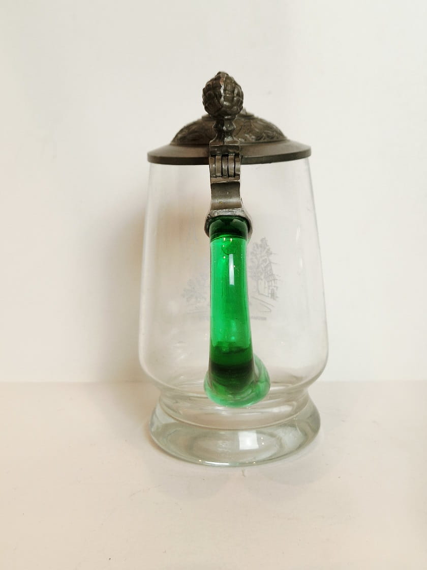 STARY (1973) KOLEKCJONERSKI KUFEL SZKLANY (uchwyt kufla barwiony w masie) Z CYNOWĄ POKRYWKĄ