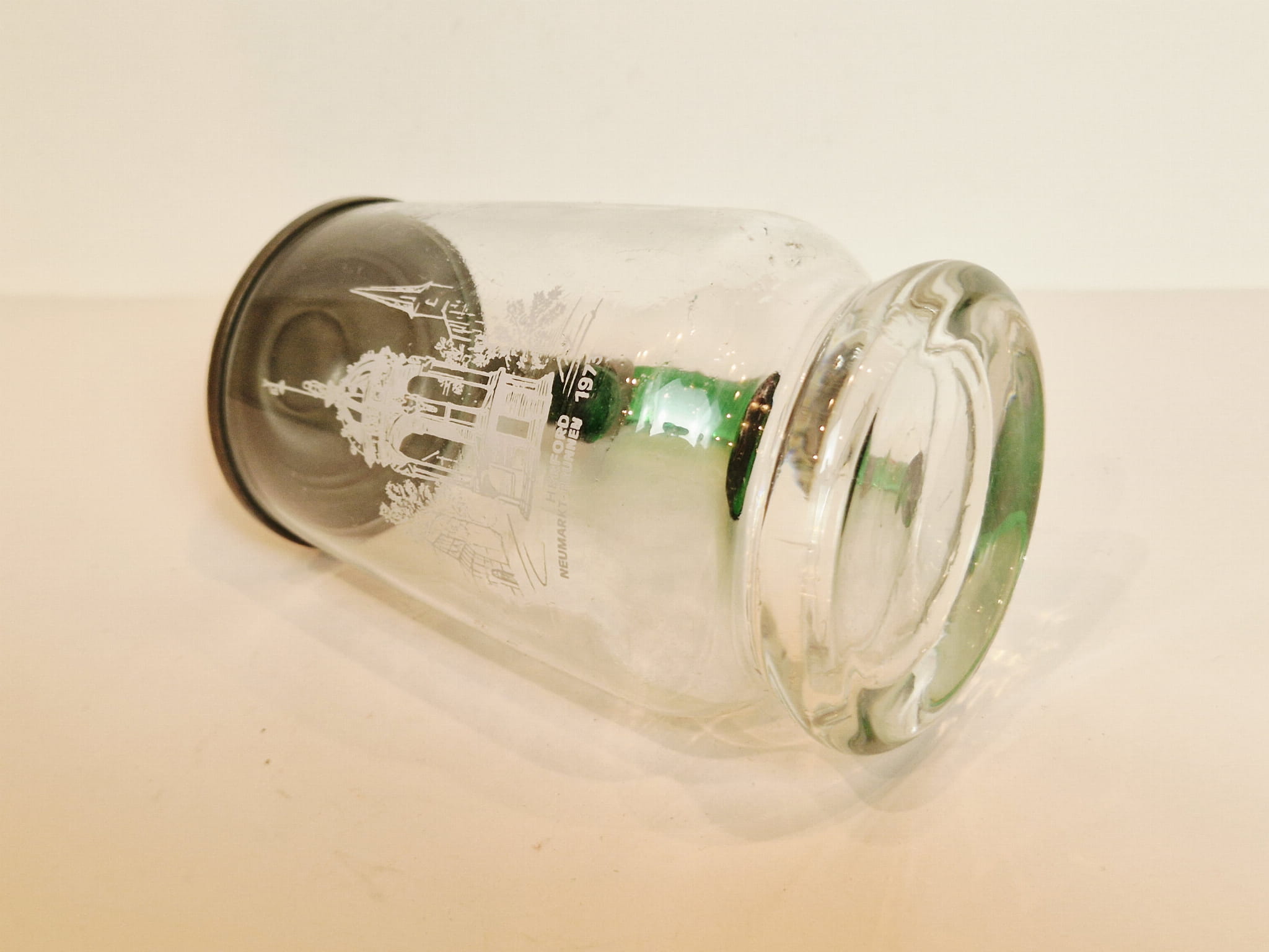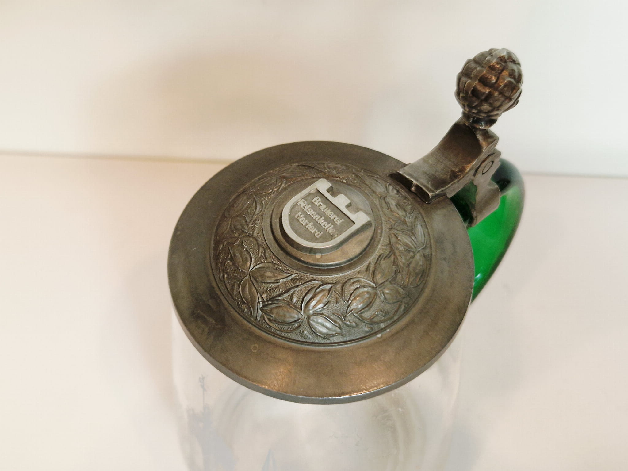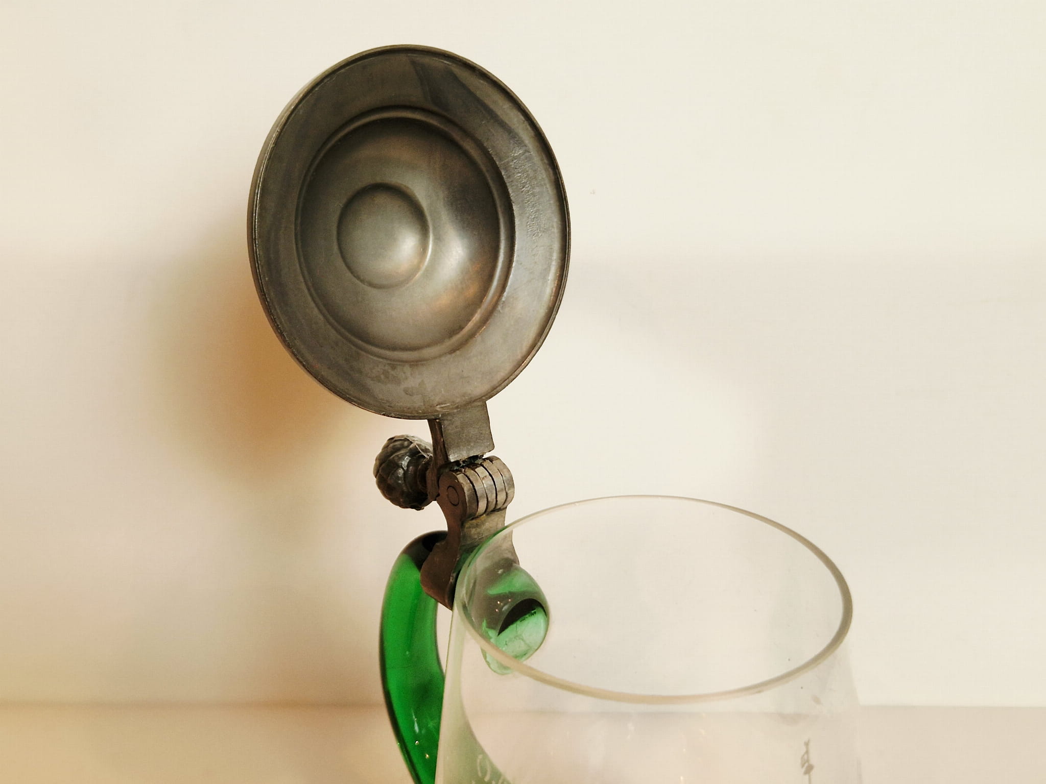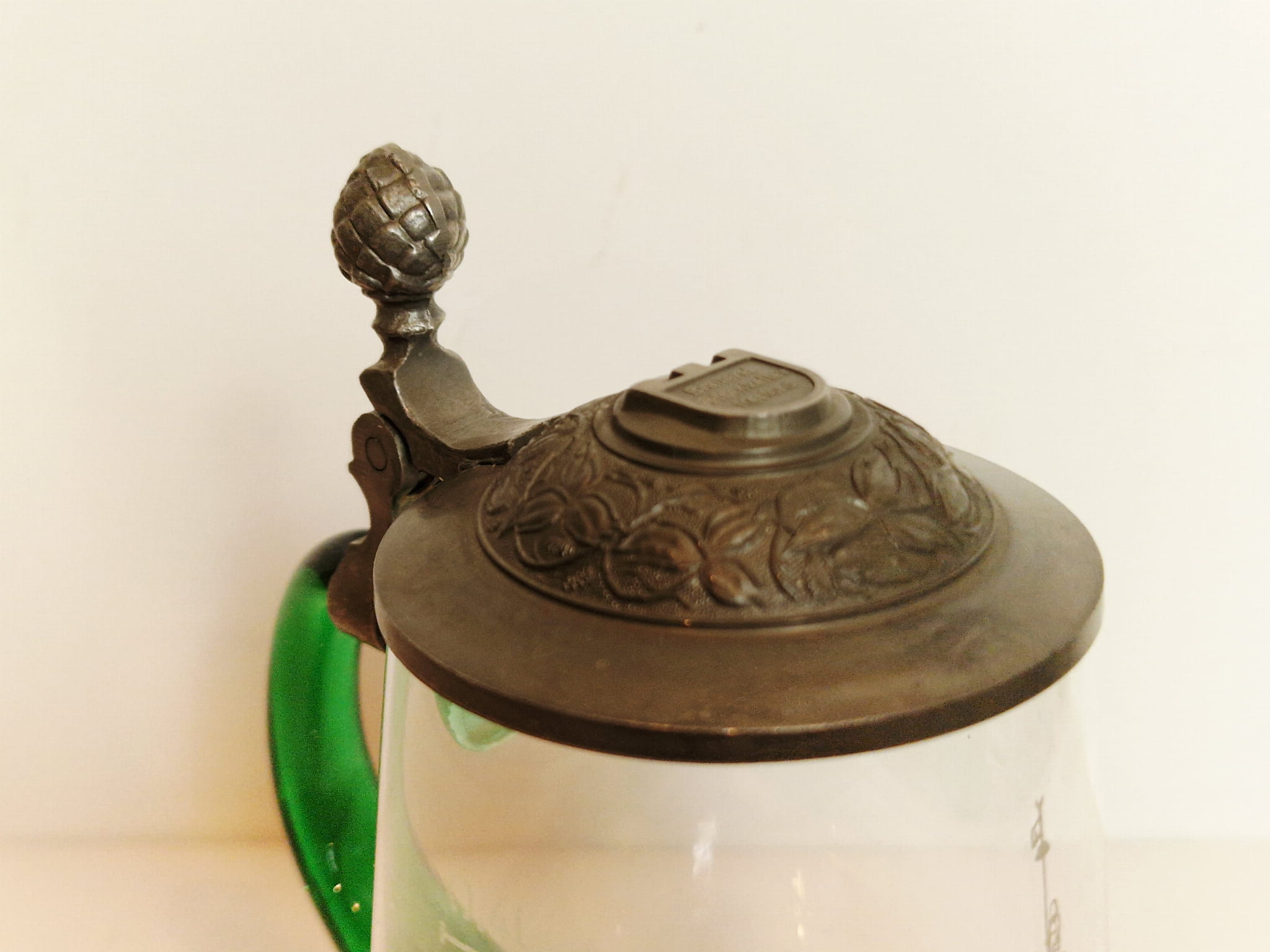 STARY (1973) KOLEKCJONERSKI KUFEL SZKLANY (uchwyt kufla barwiony w masie) Z CYNOWĄ POKRYWKĄ