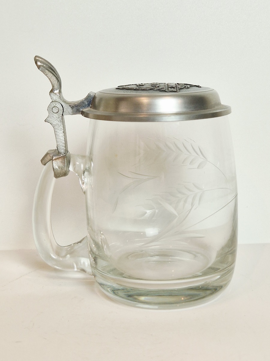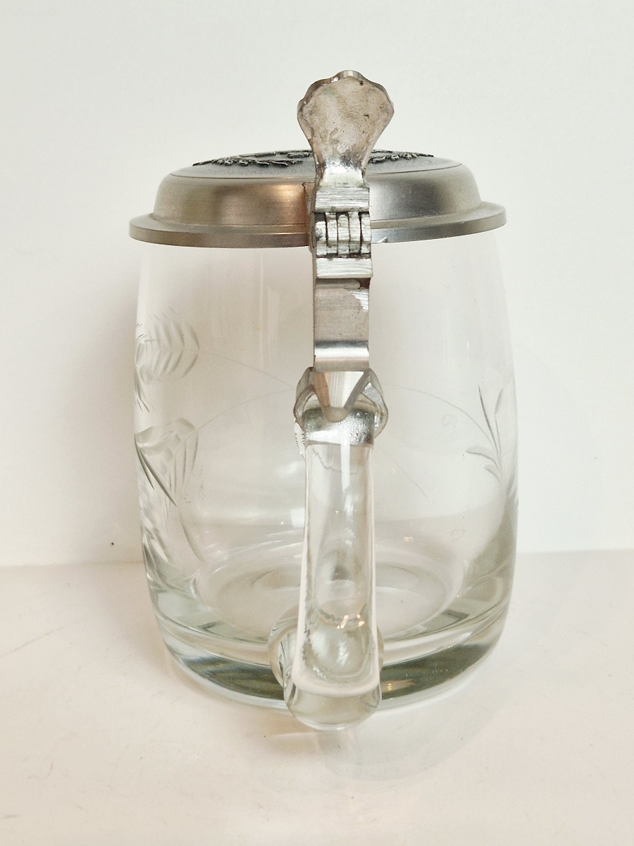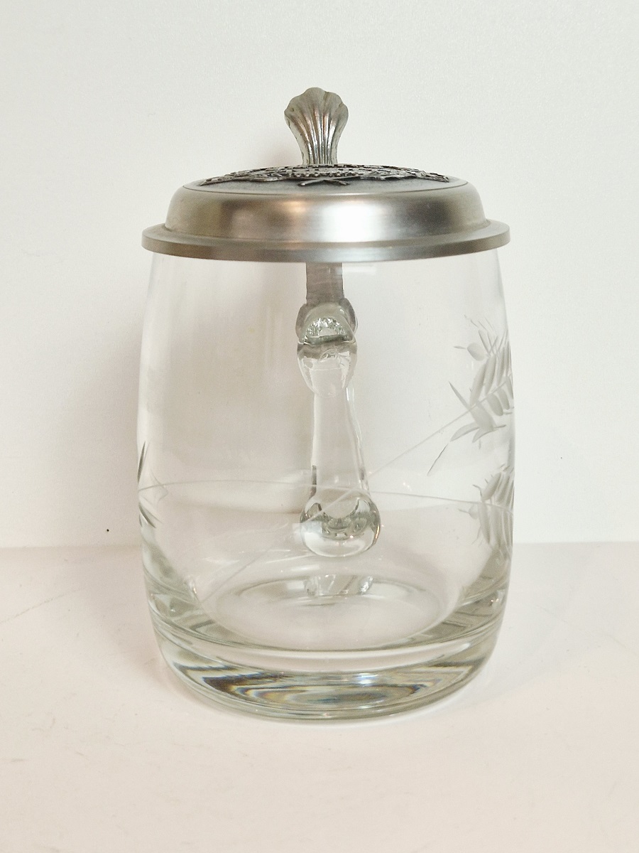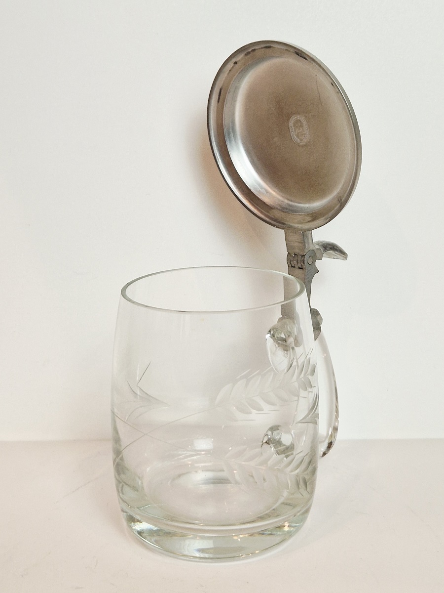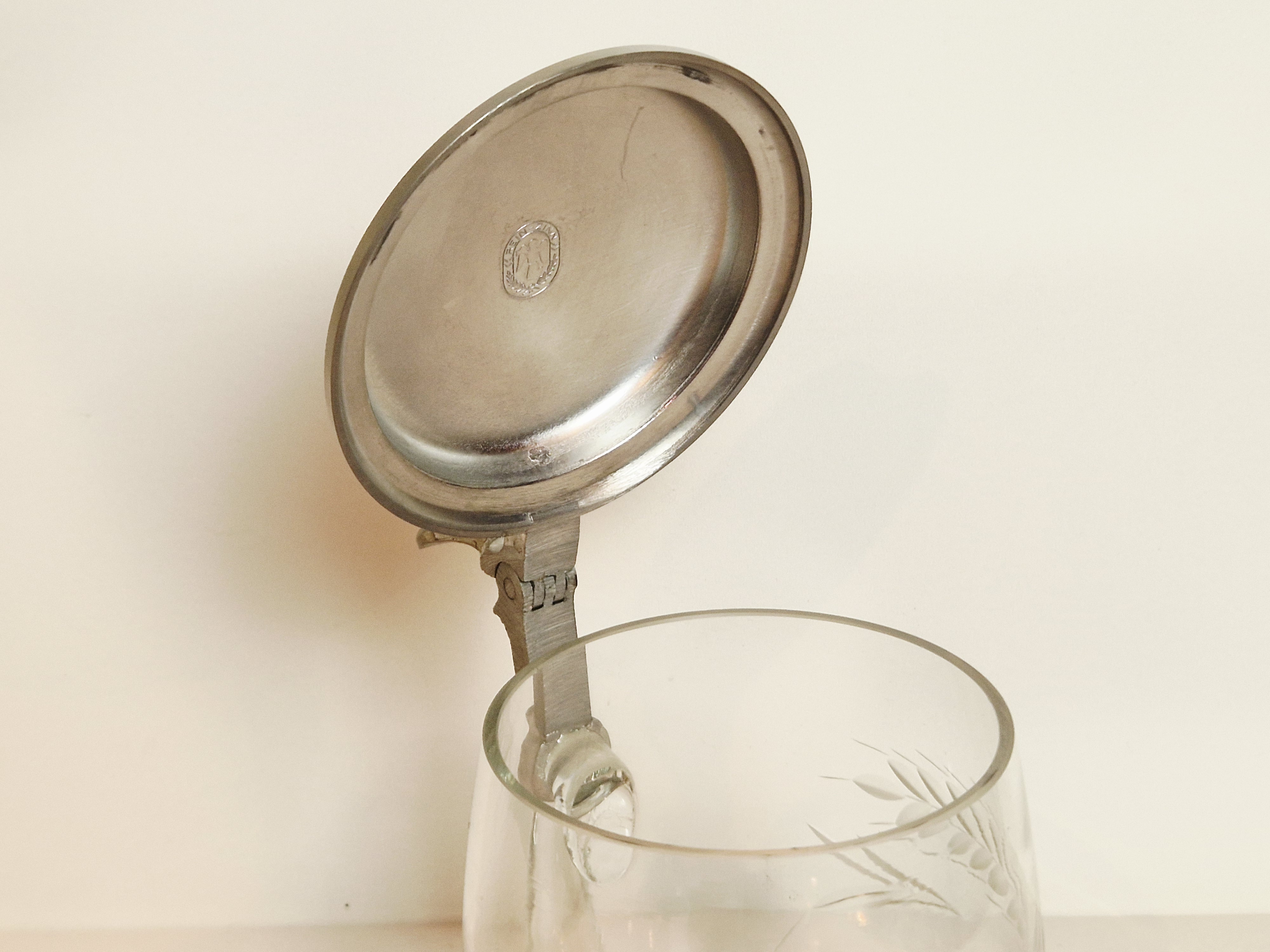 STARY (l. 60 / 70-te XX w) KOLEKCJONERSKI KUFEL SZKLANY Z CYNOWĄ POKRYWKĄ