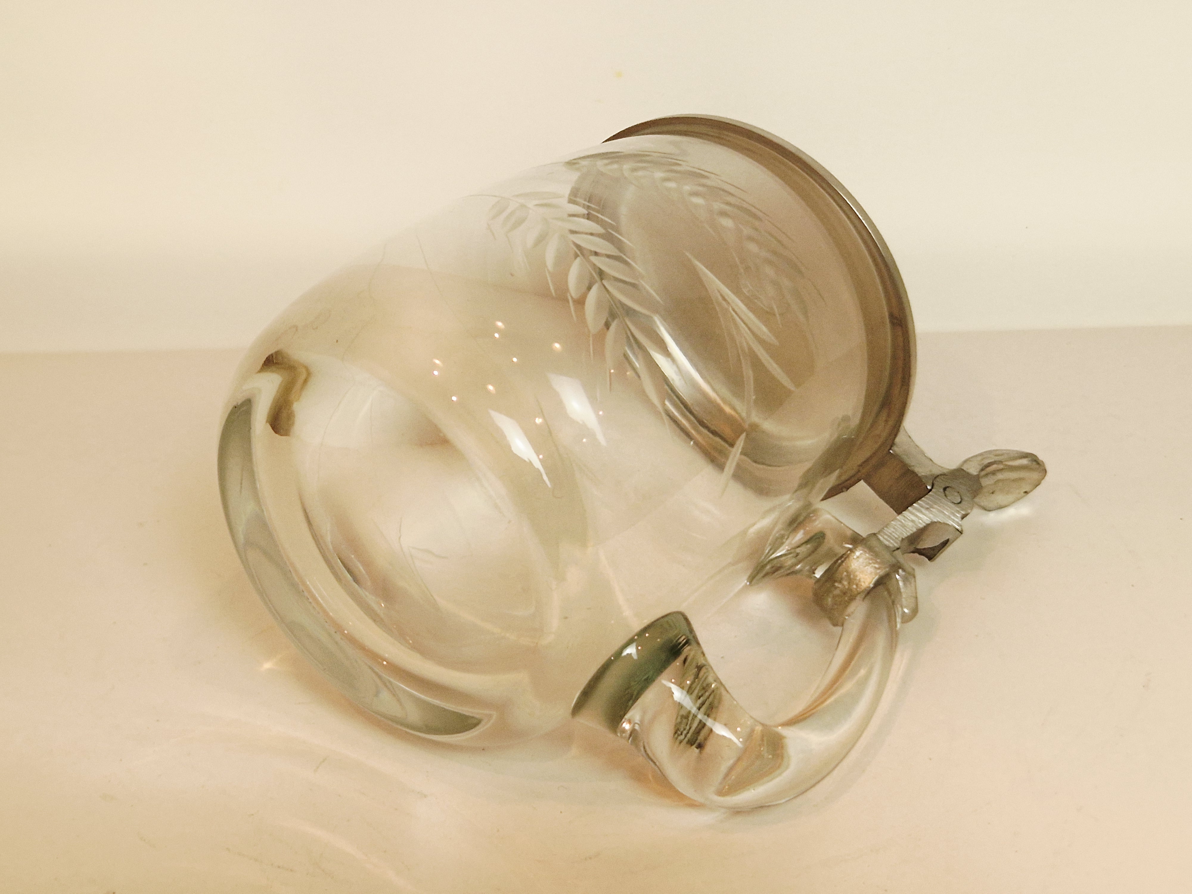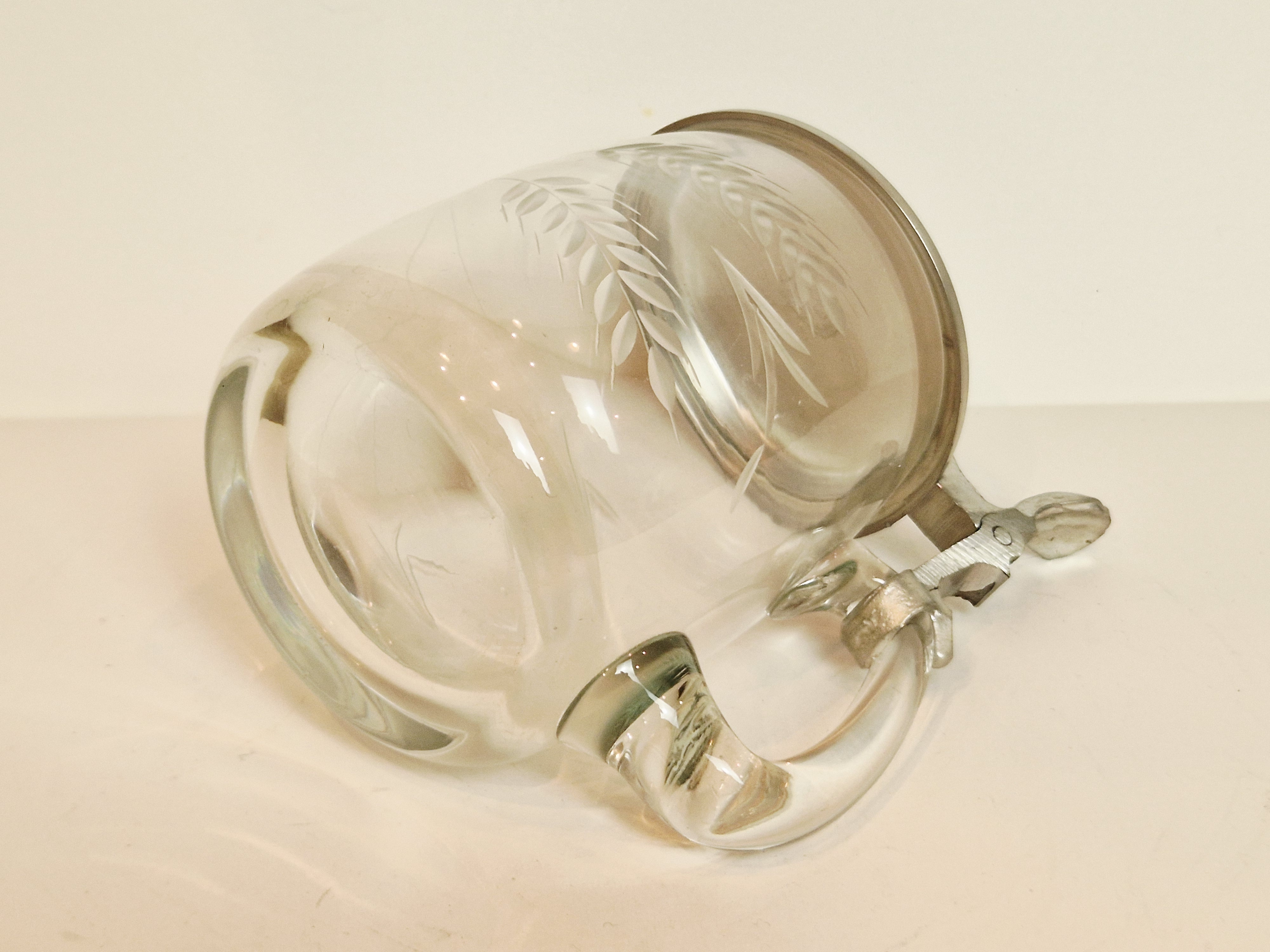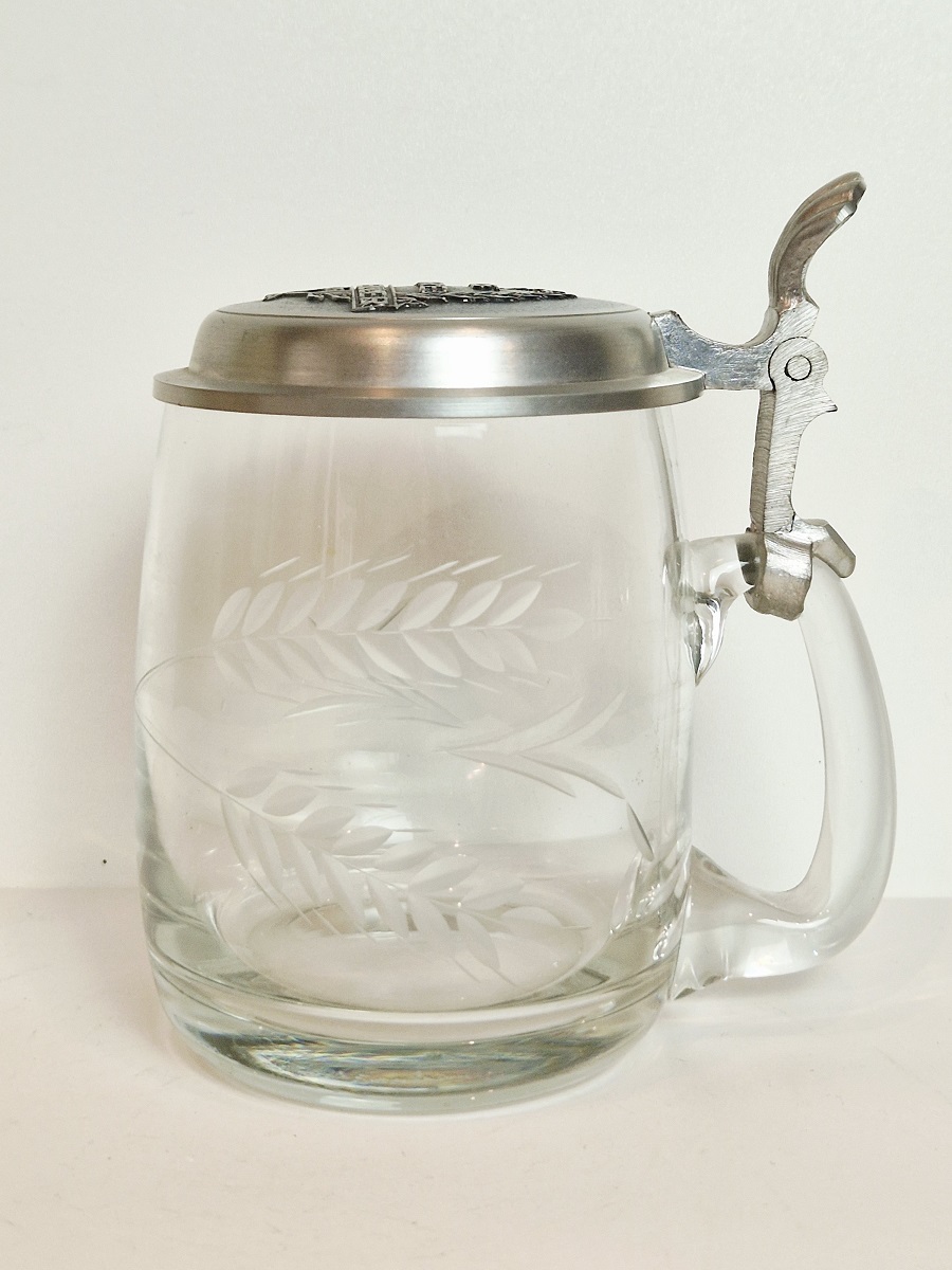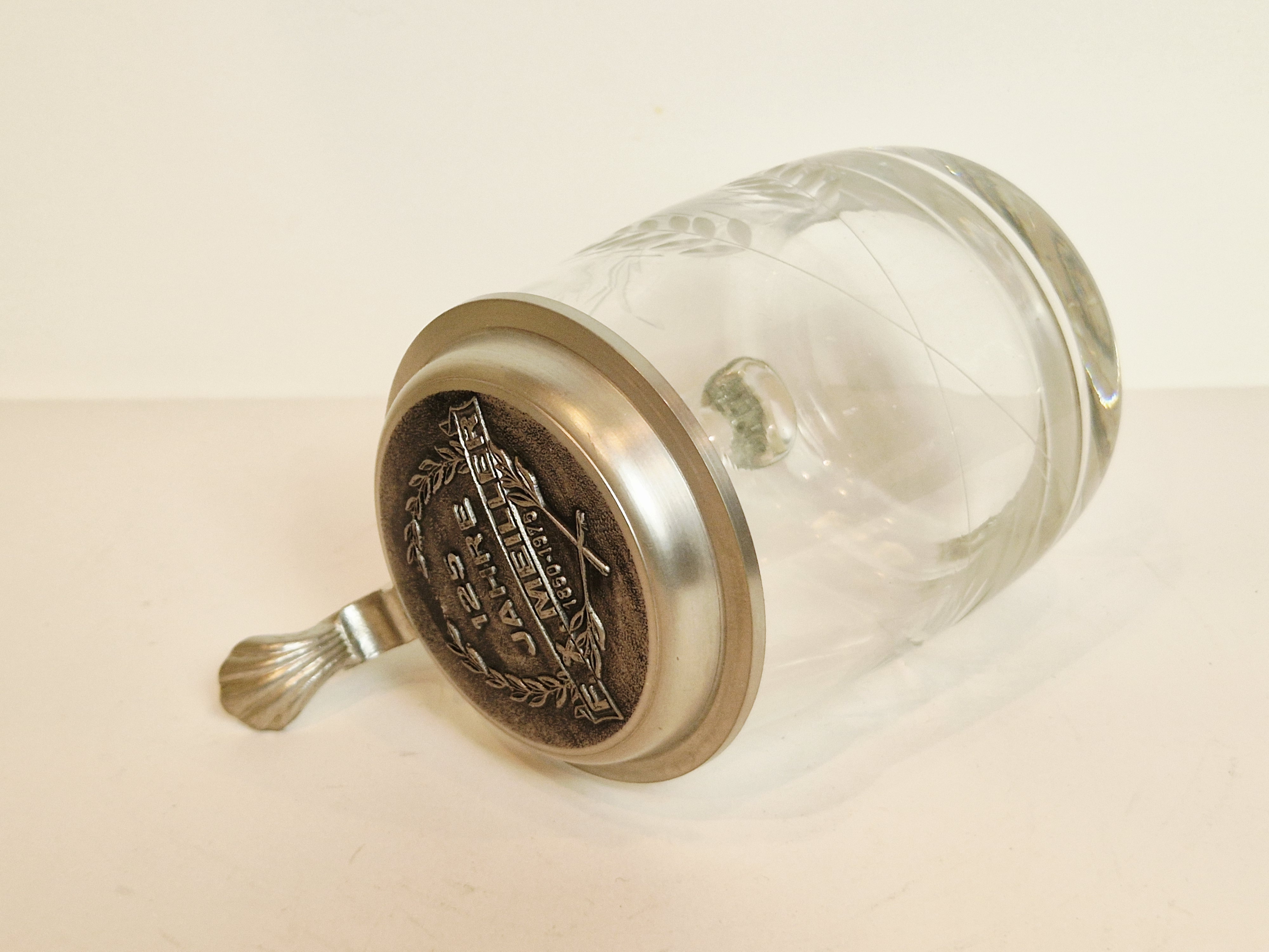 STARY (l. 60 / 70-te XX w) KOLEKCJONERSKI KUFEL SZKLANY Z CYNOWĄ POKRYWKĄ