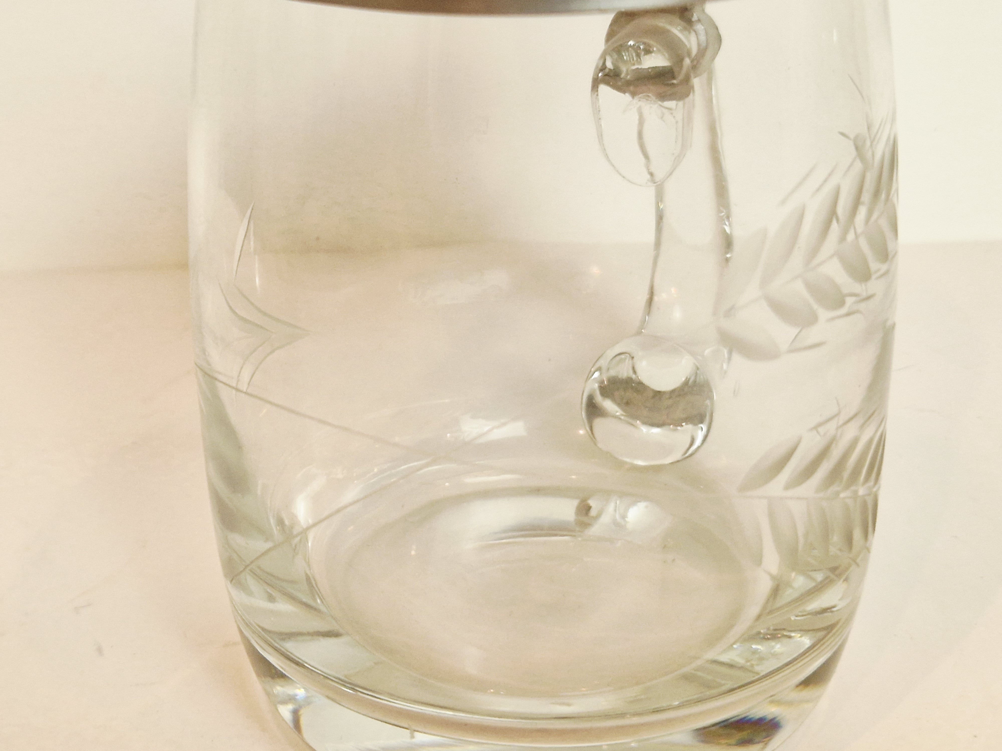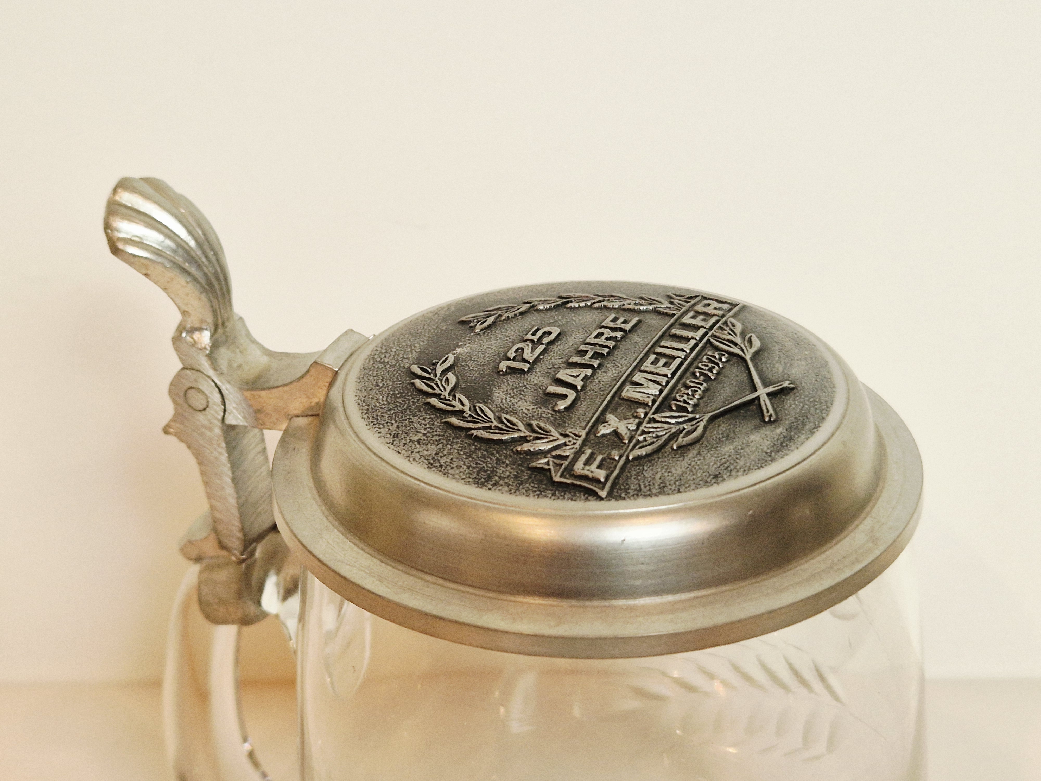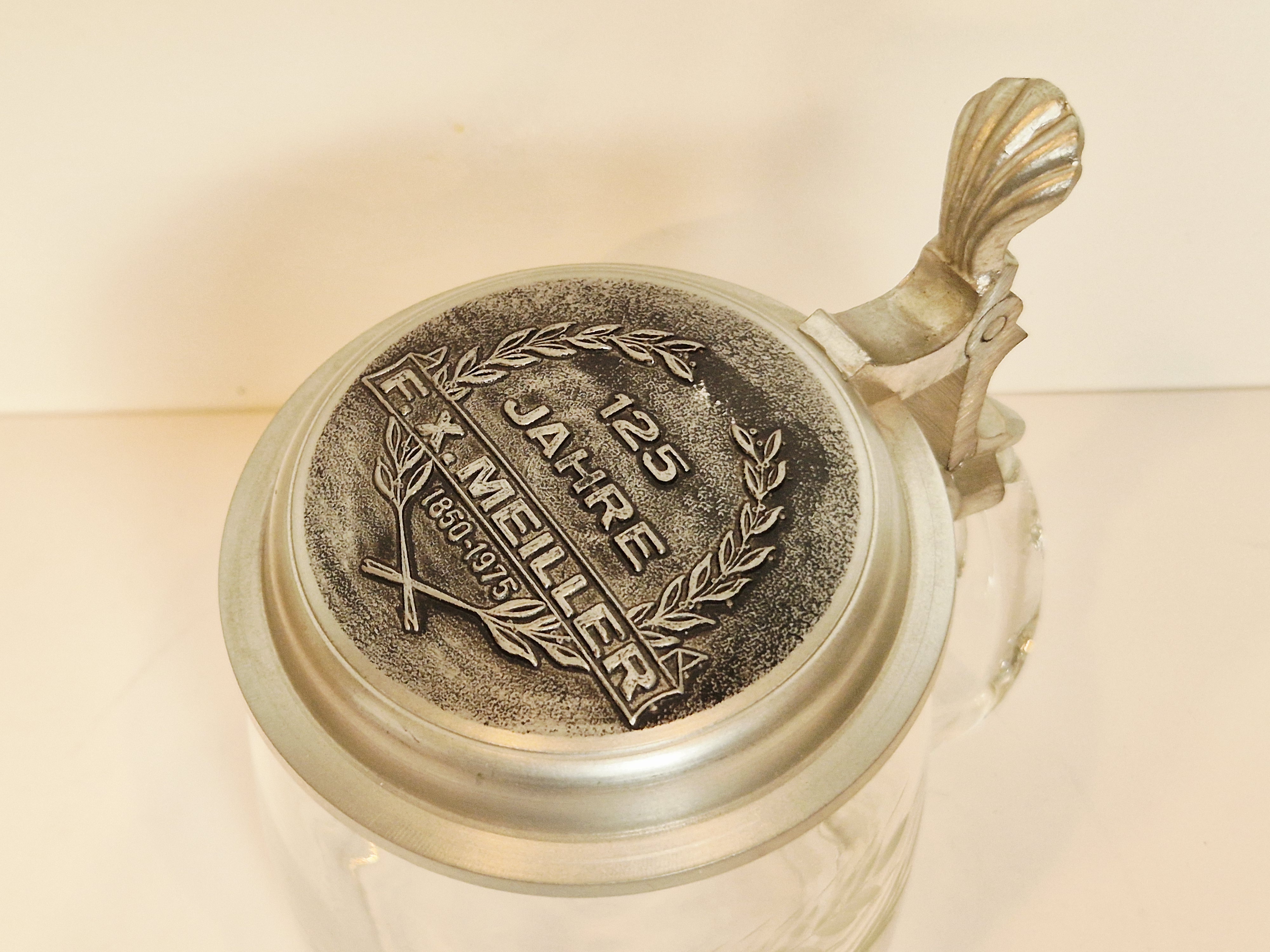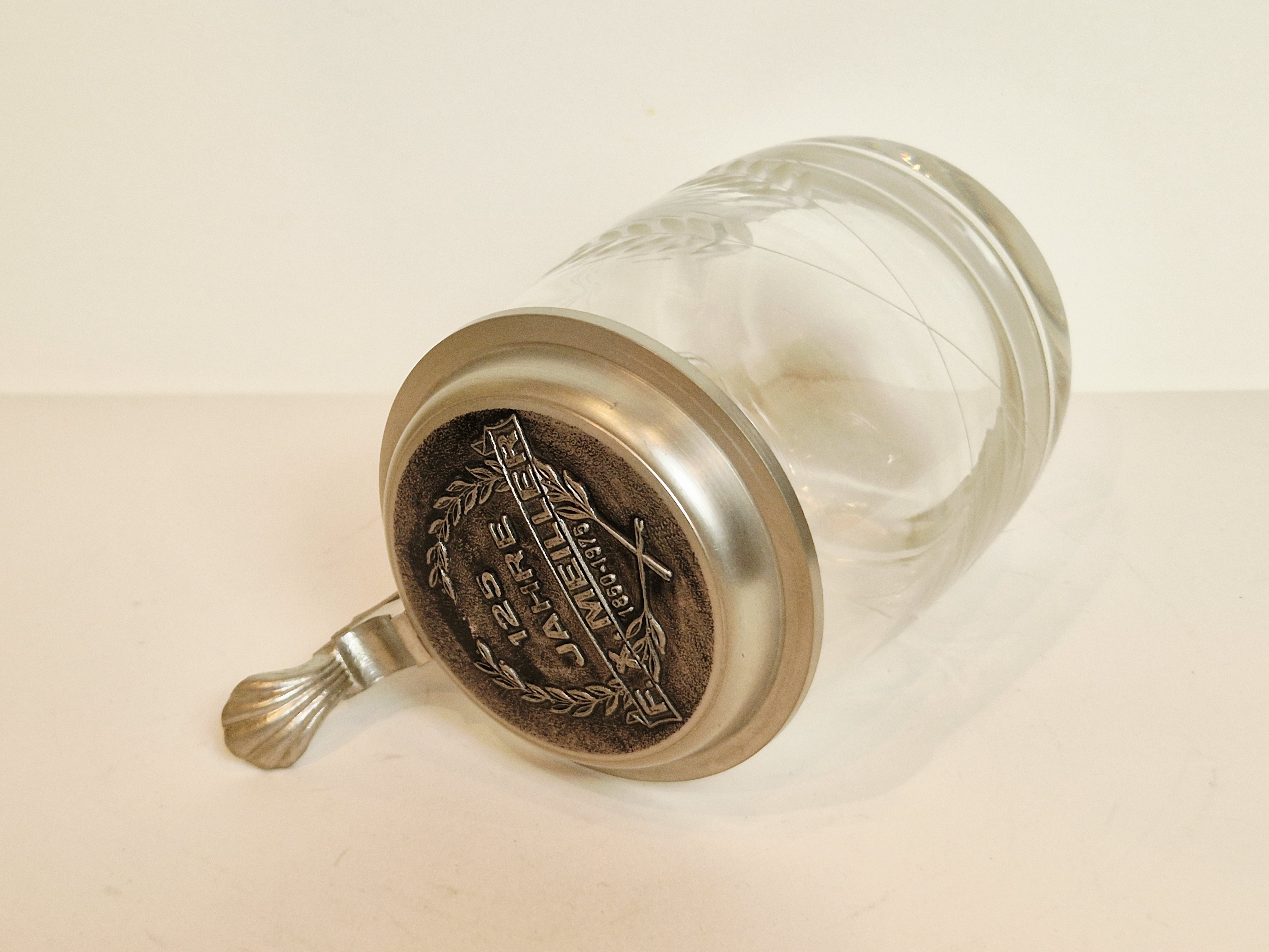 STARY (l. 60 / 70-te XX w) KOLEKCJONERSKI KUFEL SZKLANY Z CYNOWĄ POKRYWKĄ