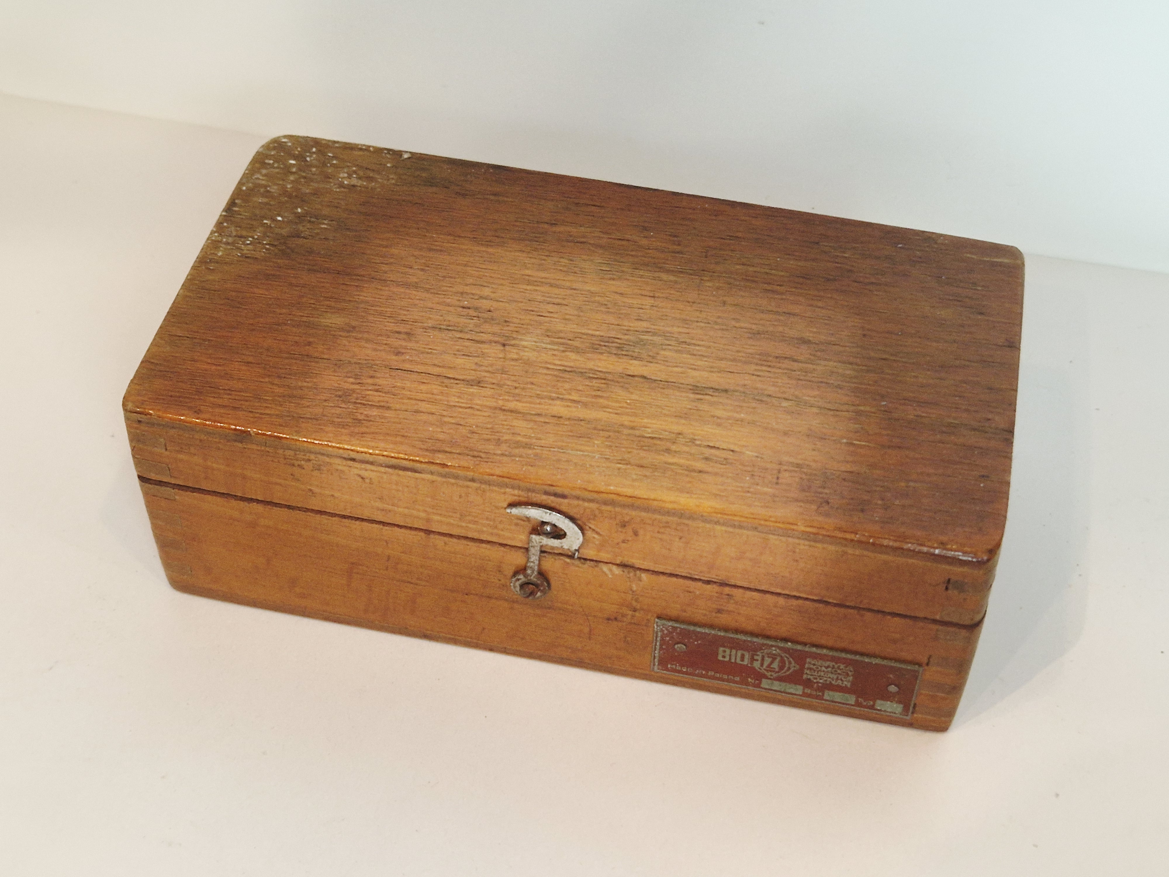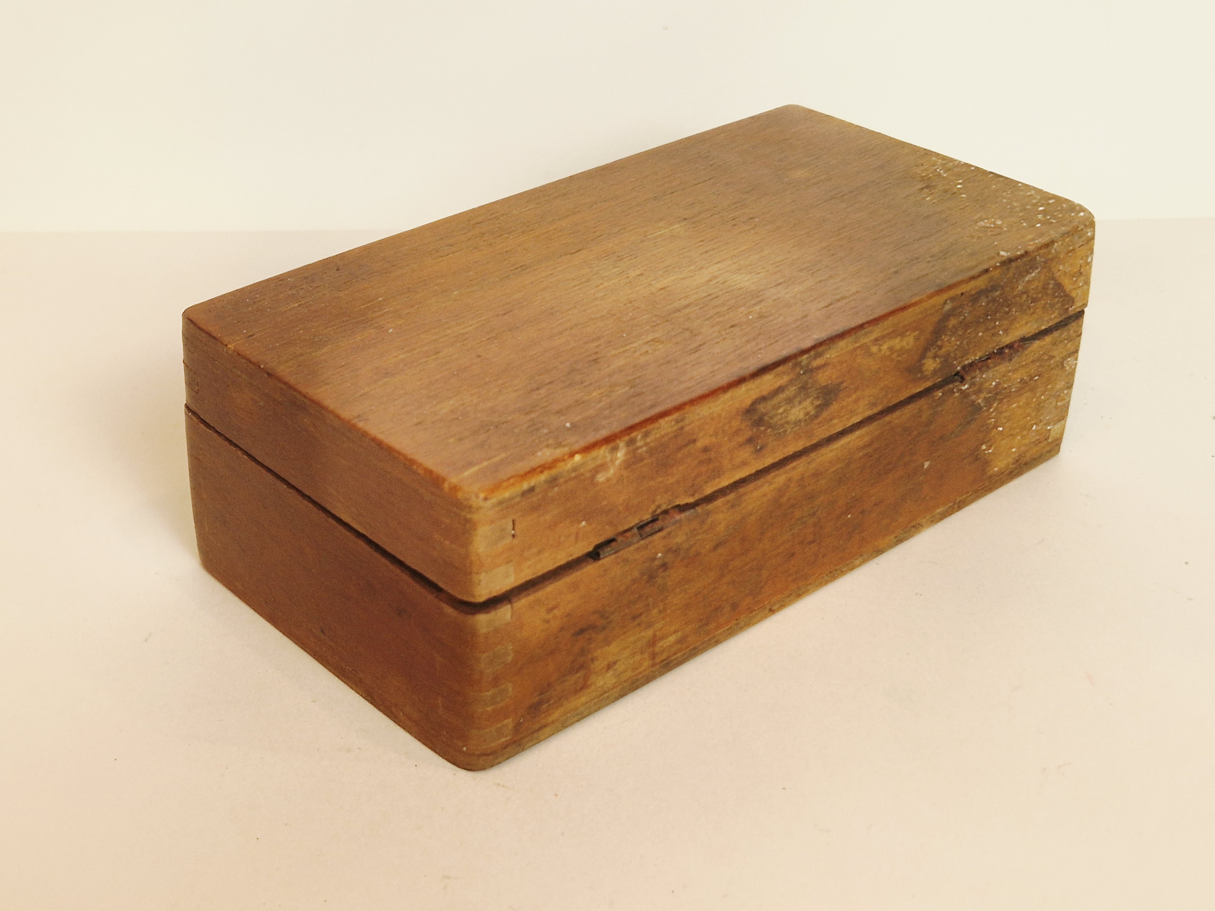 Drewniane pudełko z przytarciami - bez istotnych uszkodzeń.