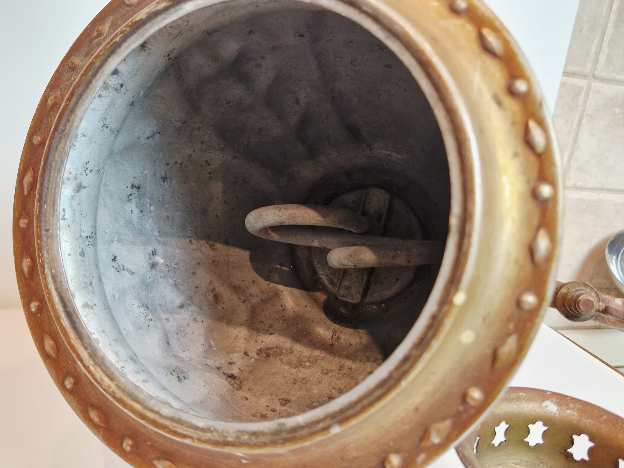 Wnętrze samowara pokryte delikatnym kamiennym nalotem.