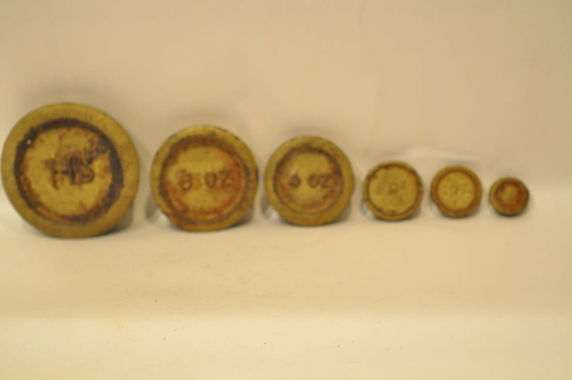 (I poł. XX w) 1/2 OZ - 1 lb (6 szt.) ZABYTKOWE ODWAŻNIKI ANGIELSKIE