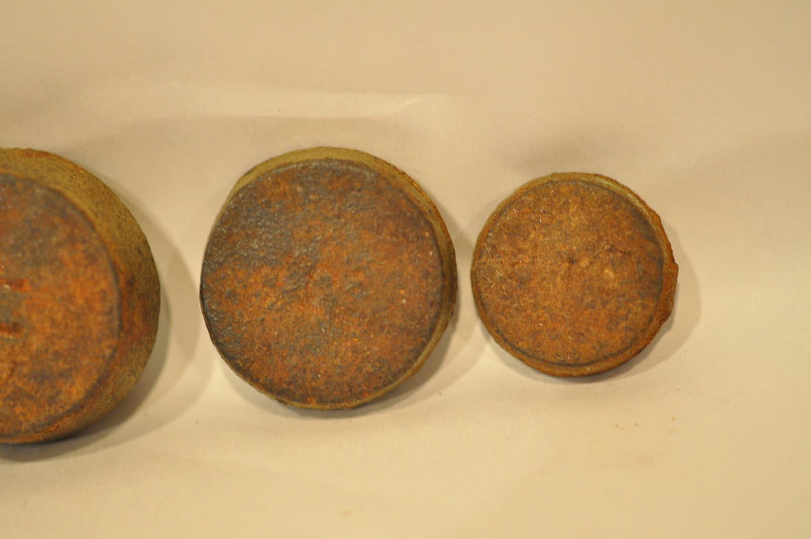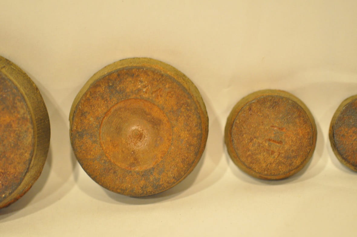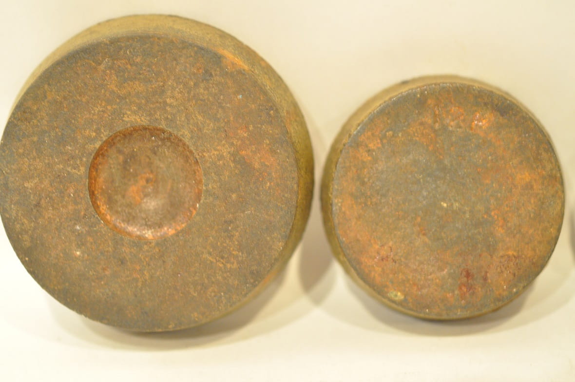 Awersy (wierzchy) odważników oznaczone nominałami...