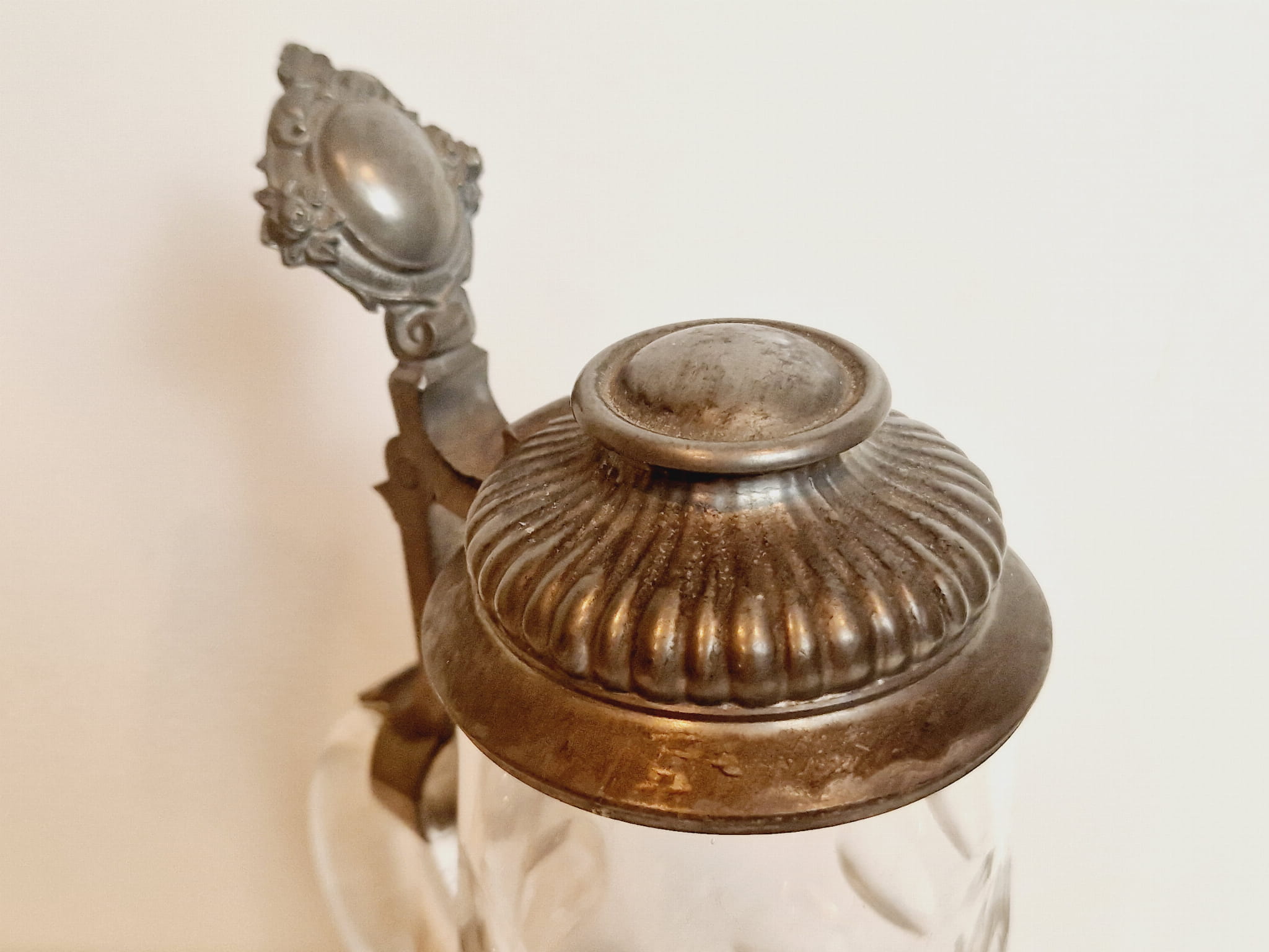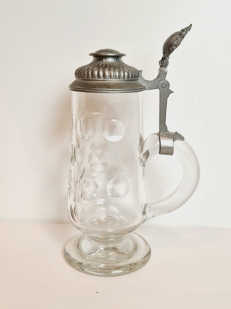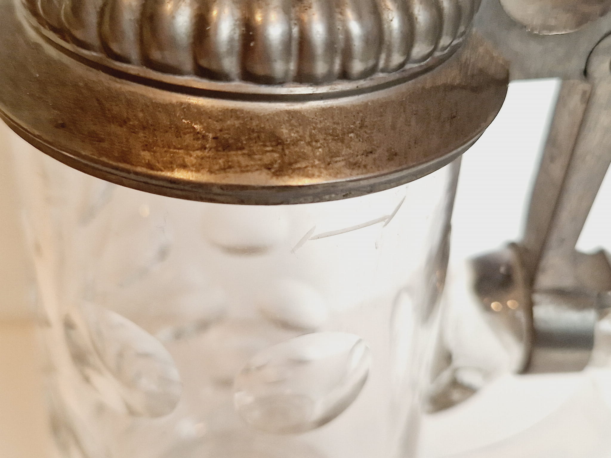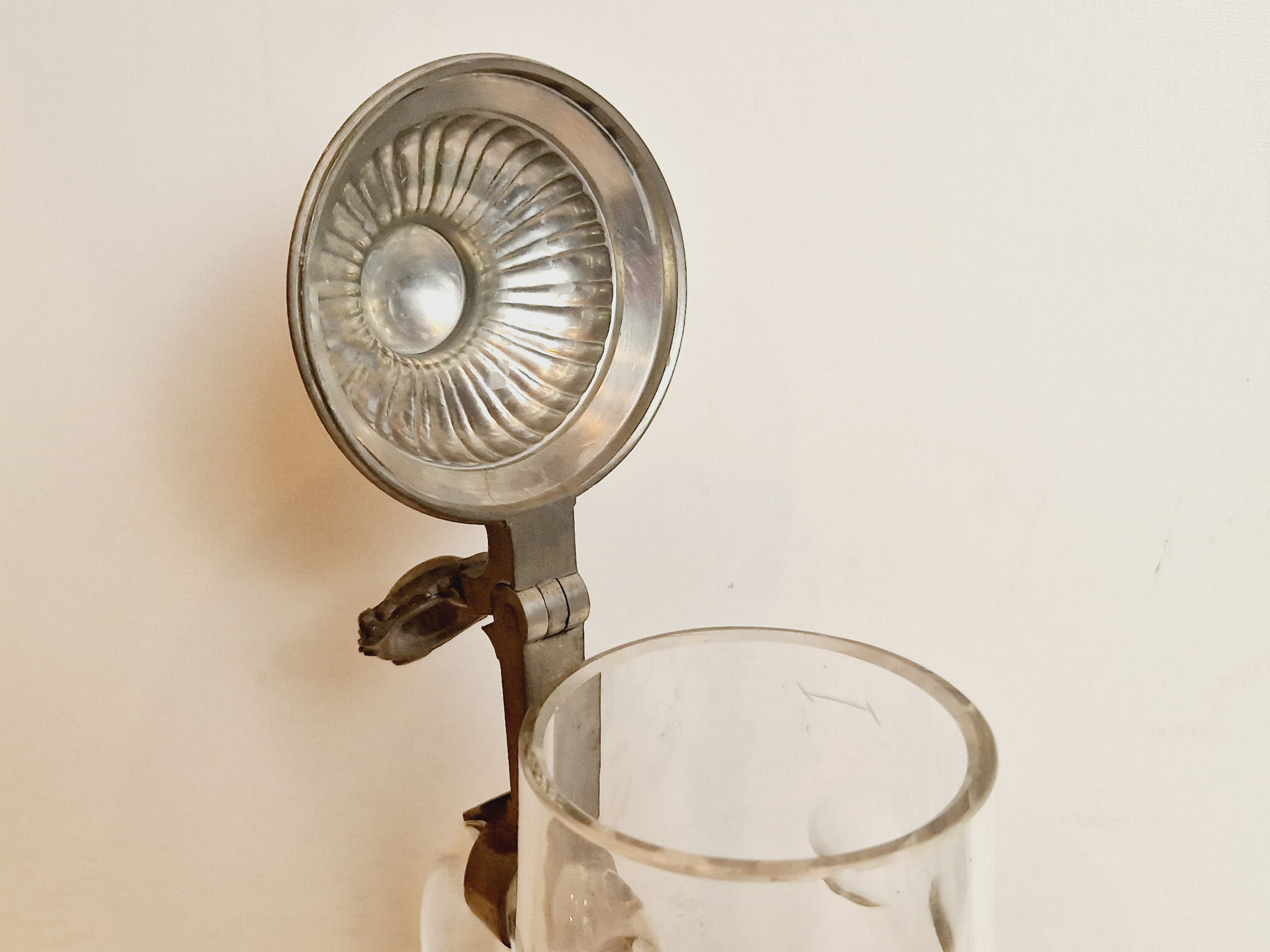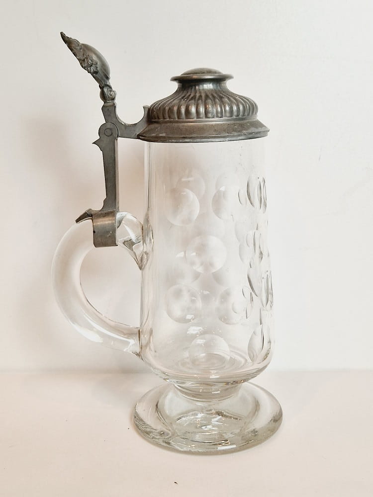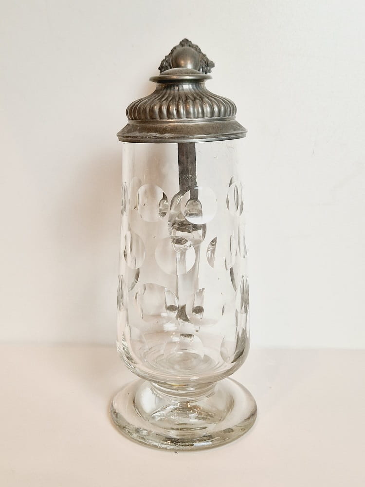 ZABYTKOWY (I poł. XX w) MASYWNY (24,2 cm / 1,01 kg) KOLEKCJONERSKI KUFEL SZKLANY (szkło fakturowane) Z CYNOWĄ POKRYWKĄ
