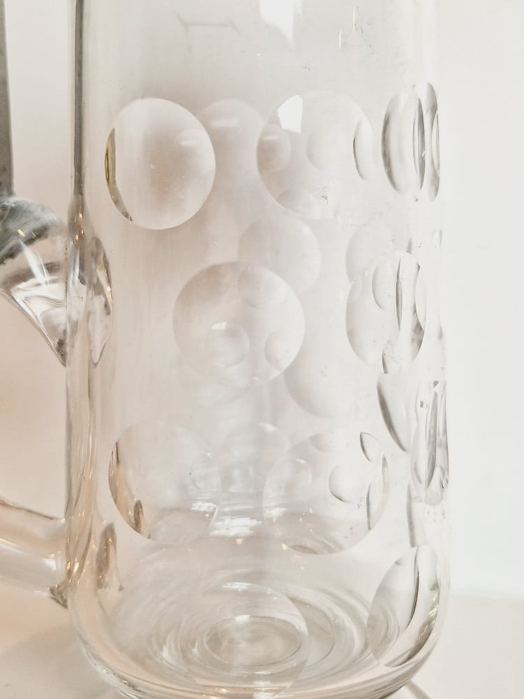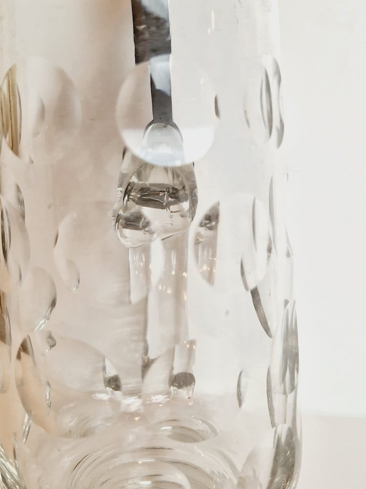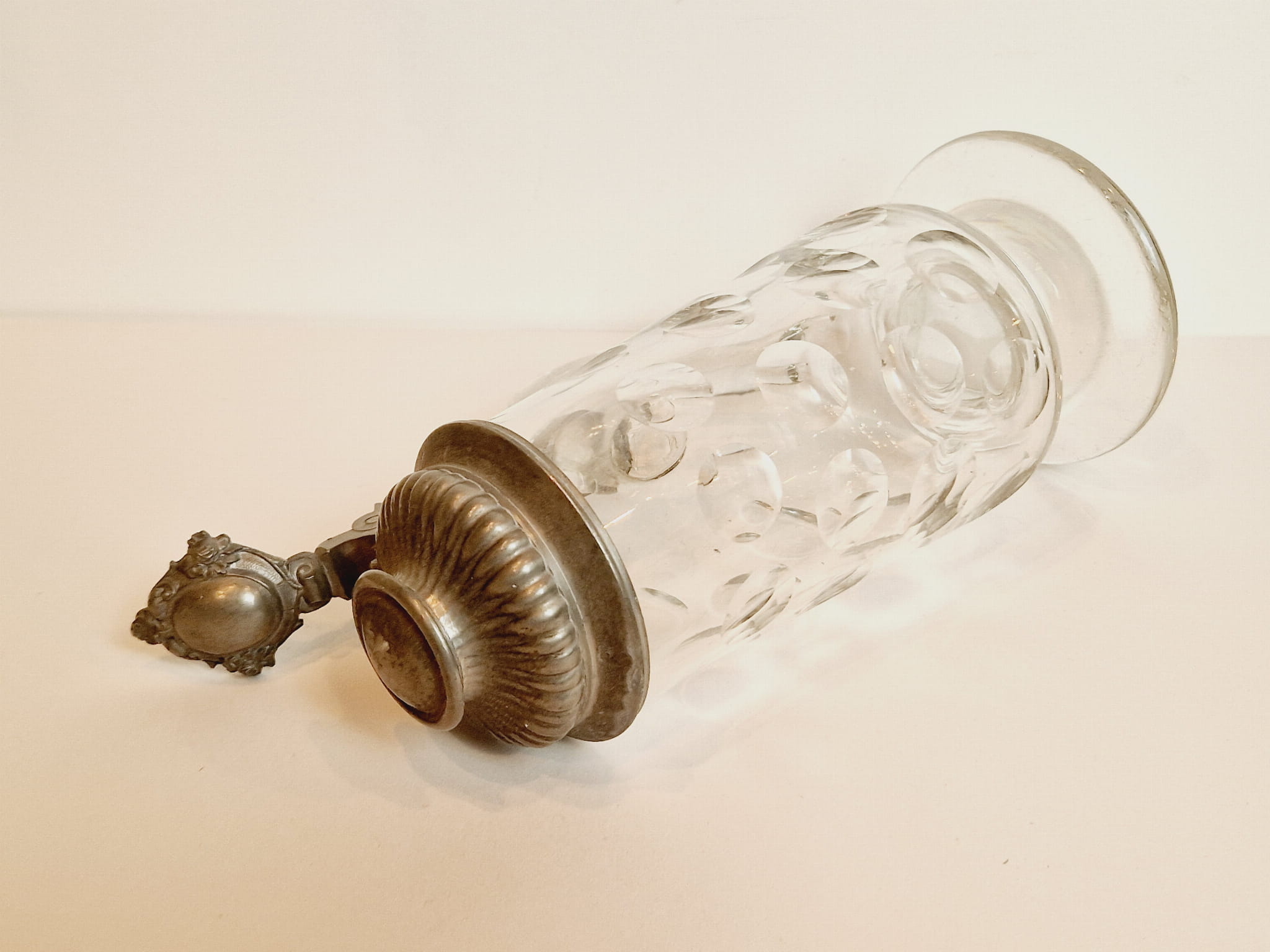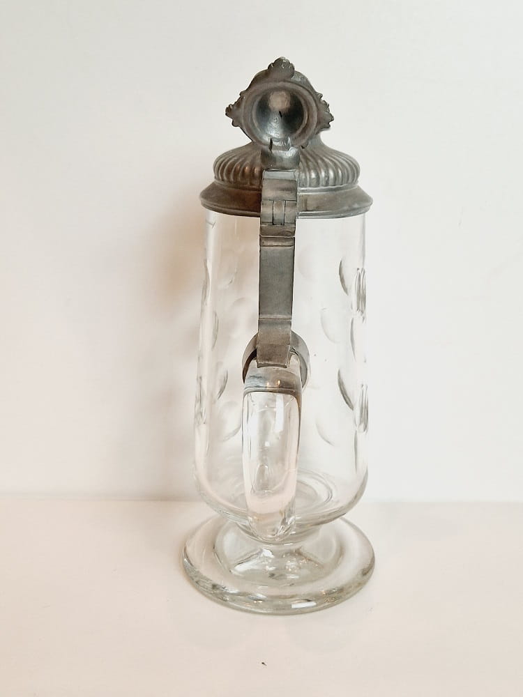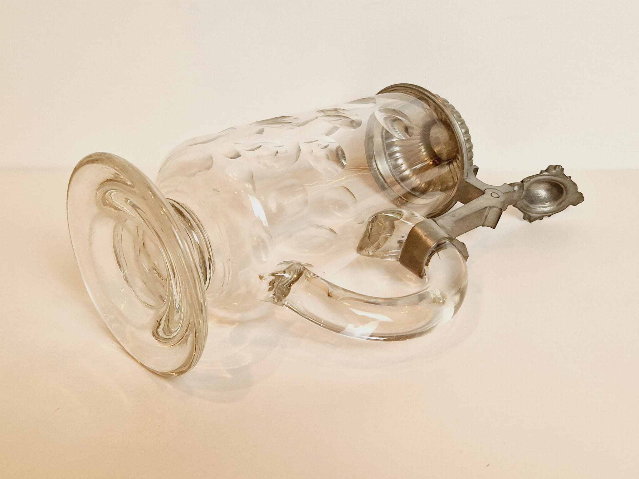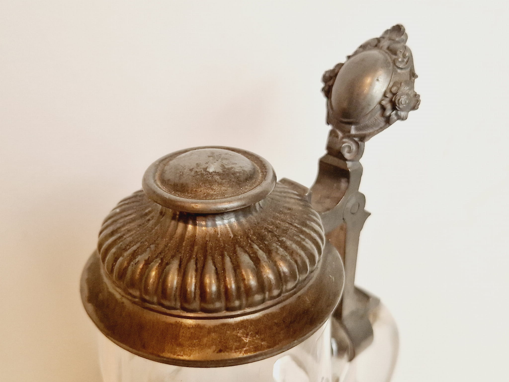 ZABYTKOWY (I poł. XX w) MASYWNY (24,2 cm / 1,01 kg) KOLEKCJONERSKI KUFEL SZKLANY (szkło fakturowane) Z CYNOWĄ POKRYWKĄ