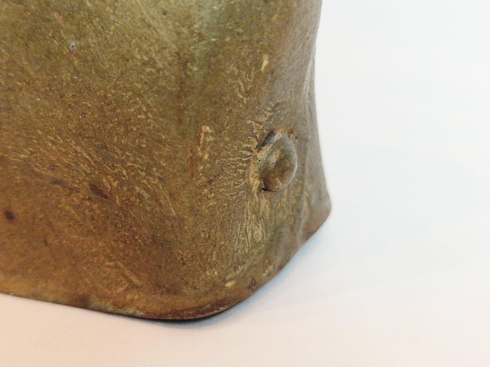 Płaszcz dzwonka pokryty złotą, rustykalną farbą, z niewielkimi śniedziowo-rdzawymi wykwitami...
