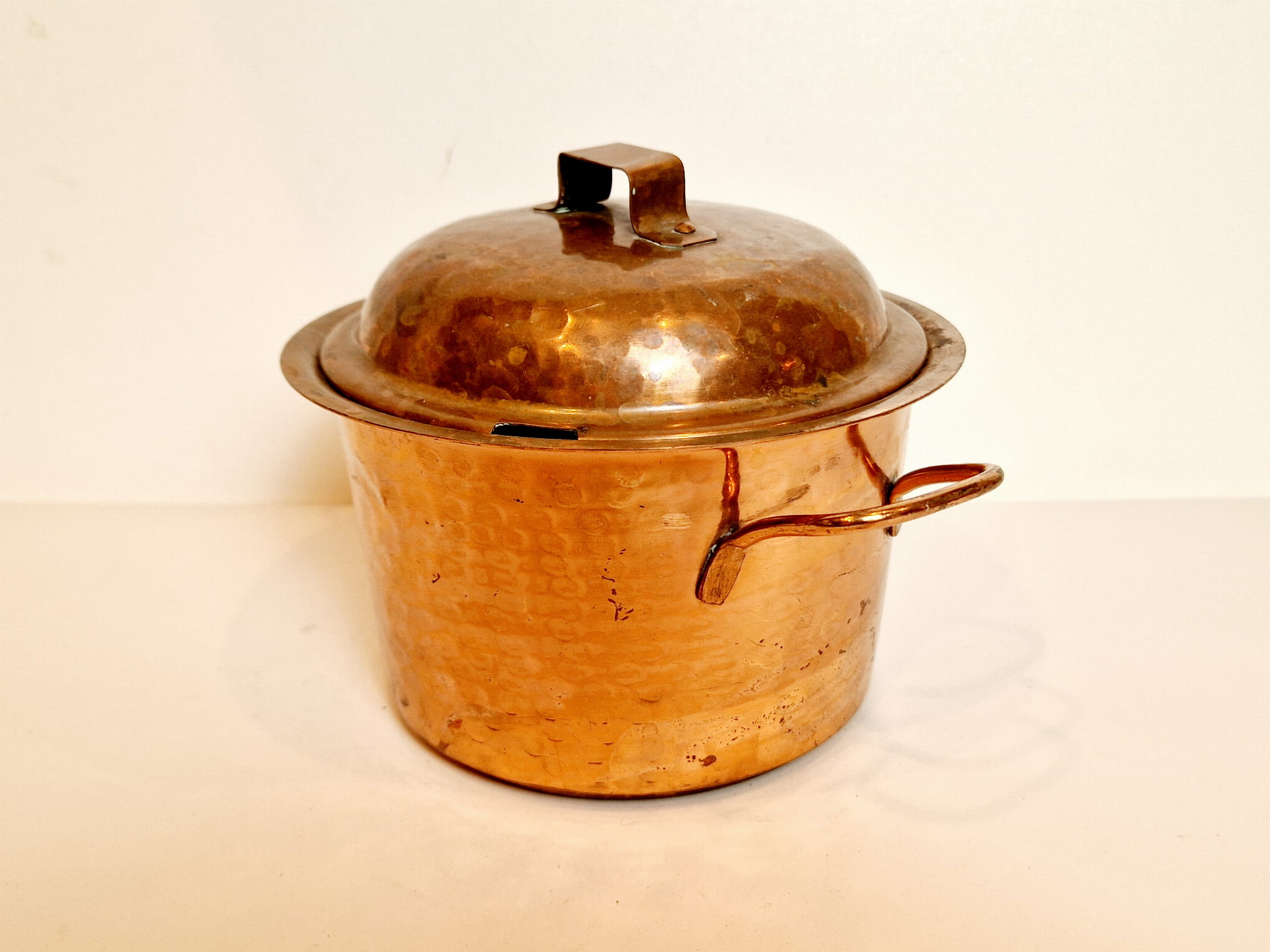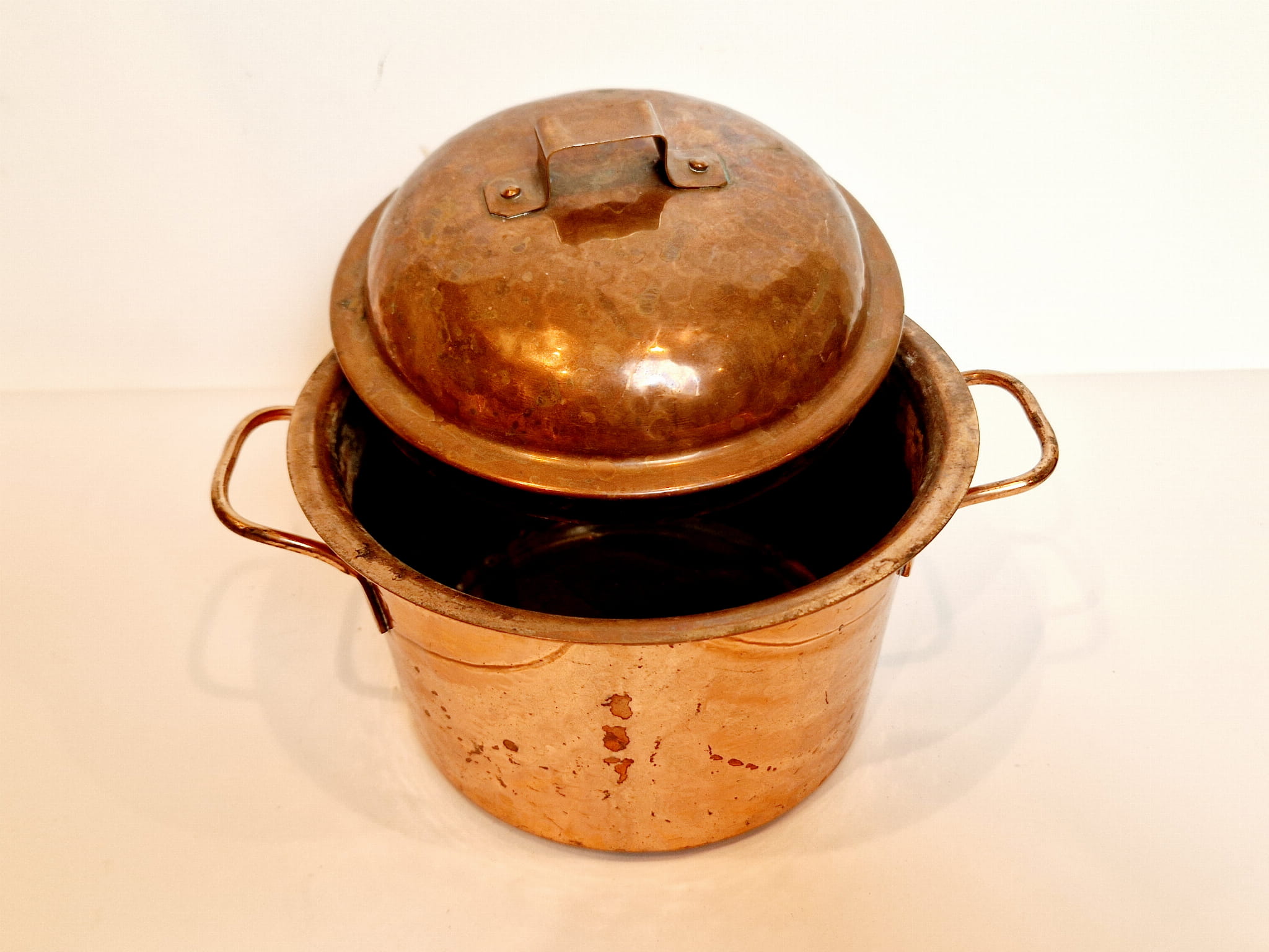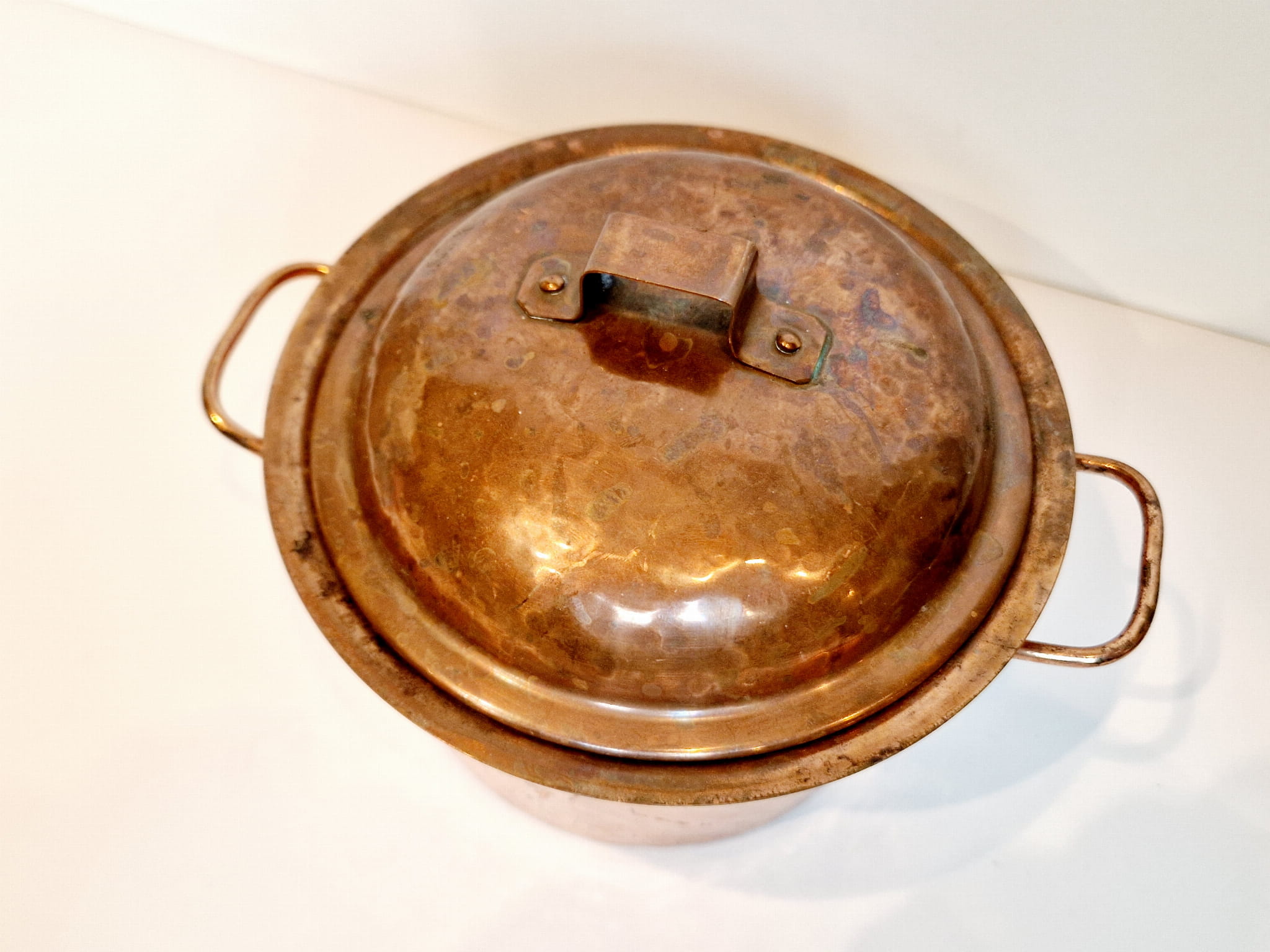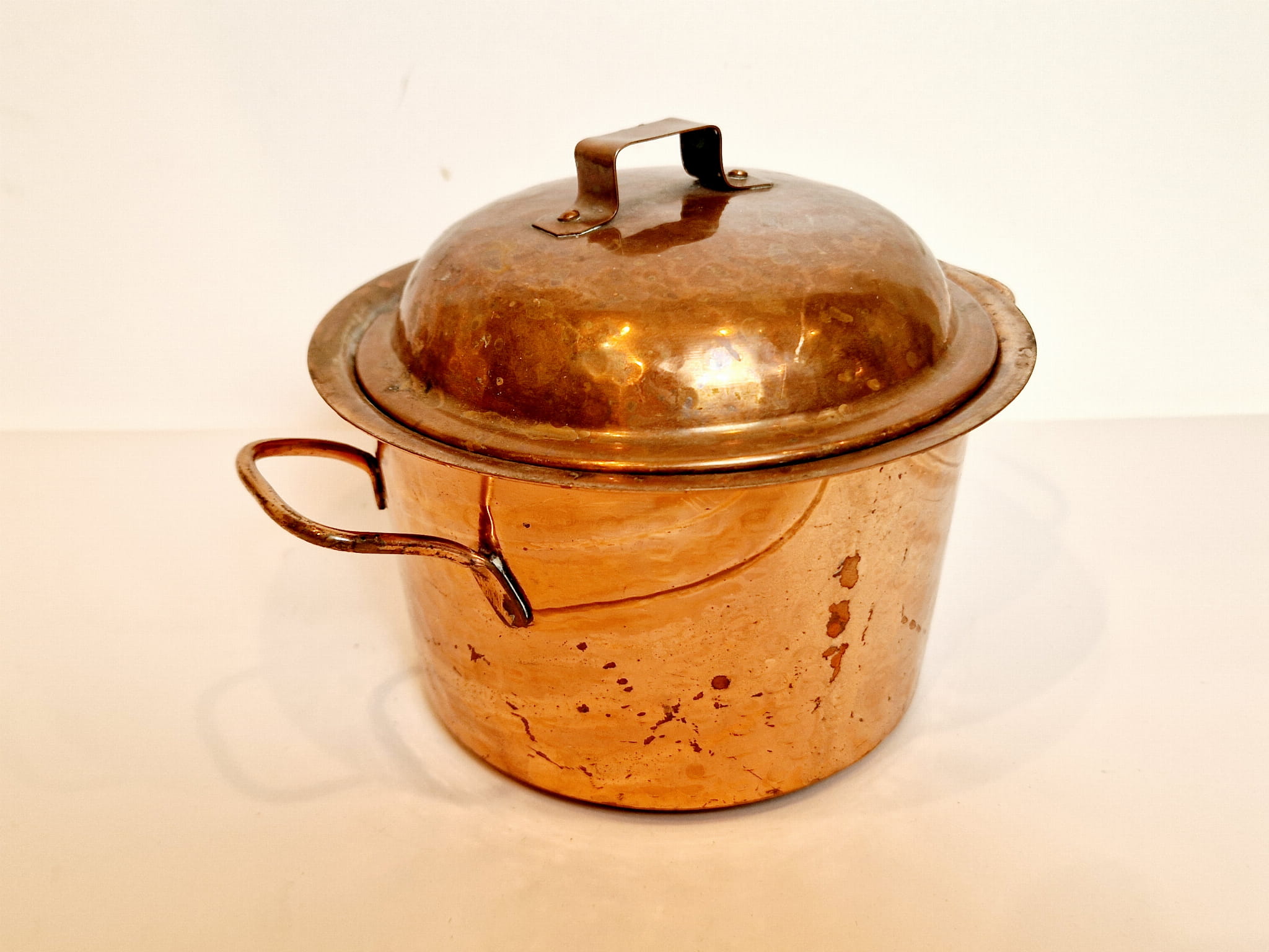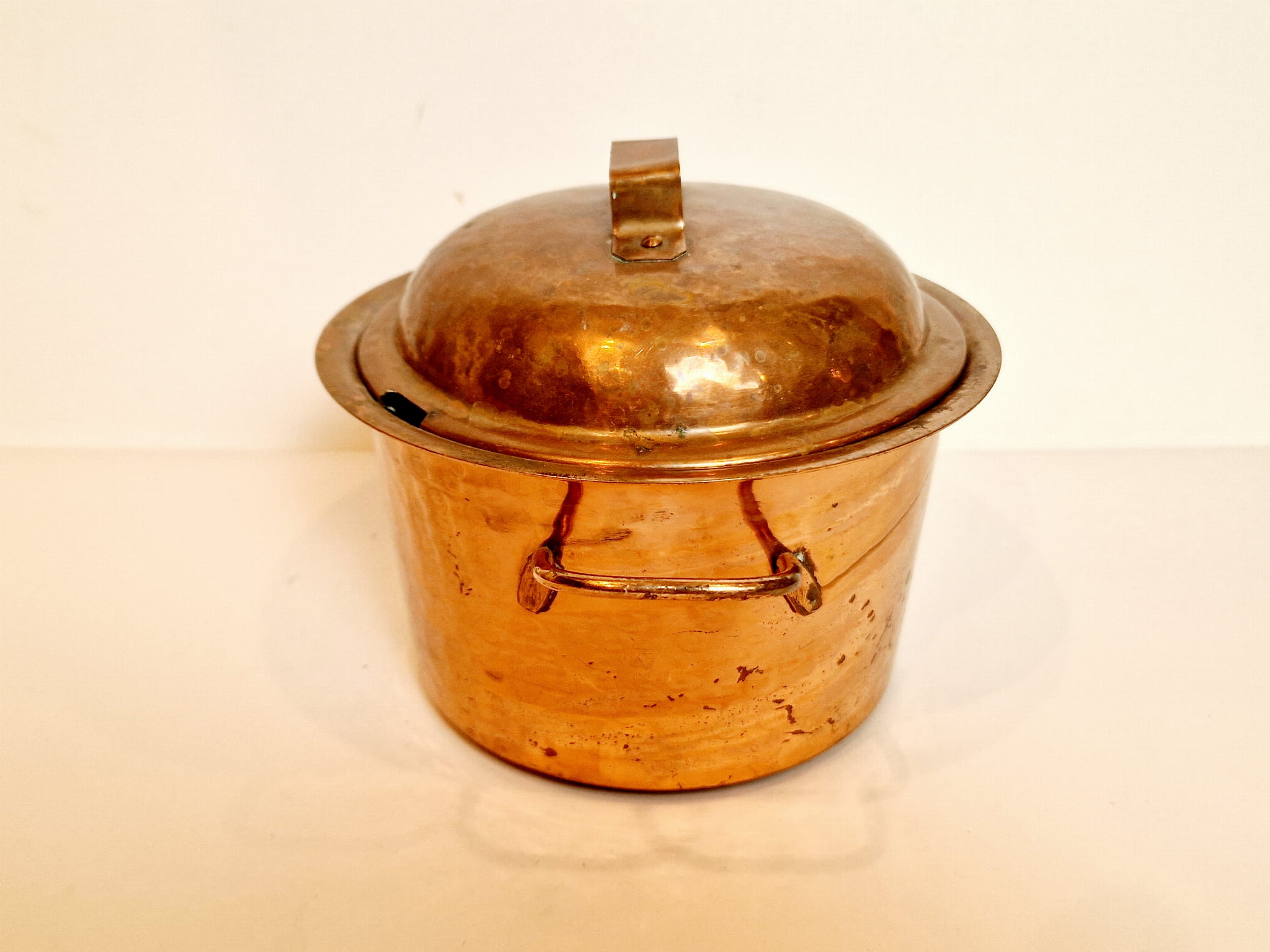 STARY (I poł. XX w) MAŁY (16,0 cm / 1,0 l) MIEDZIANY GARNEK Z POKRYWKĄ
