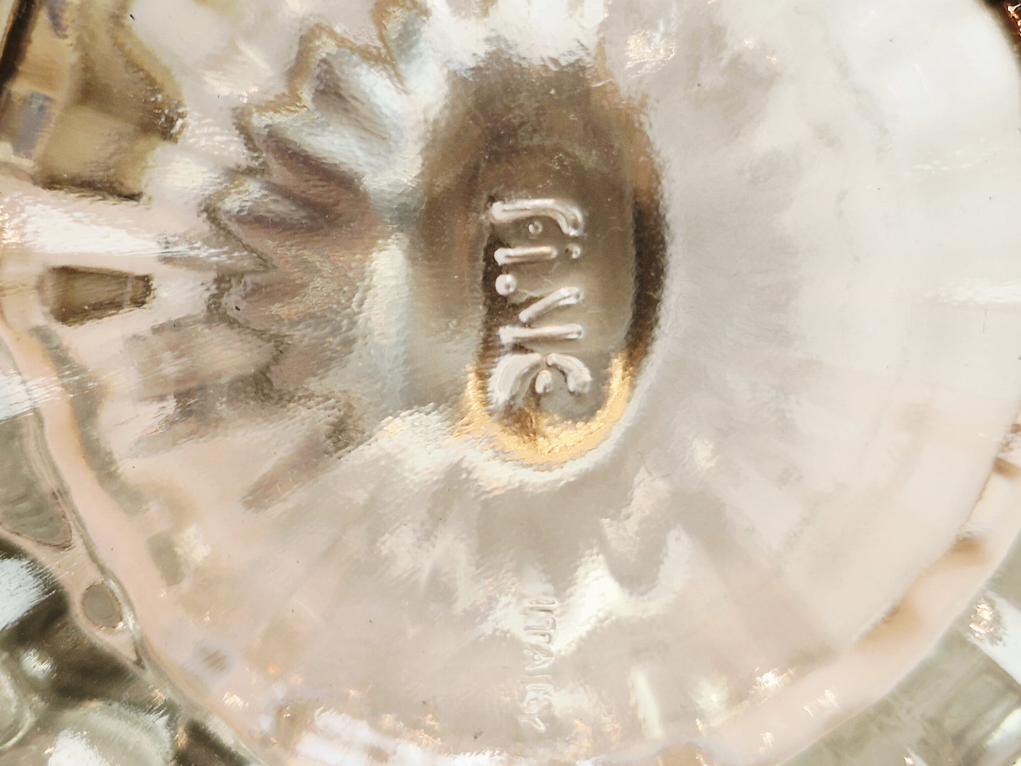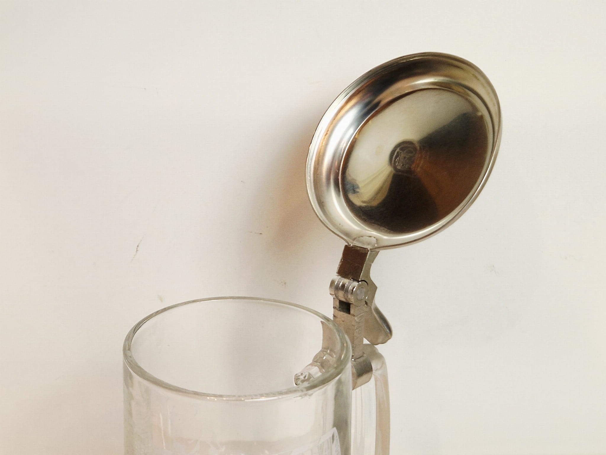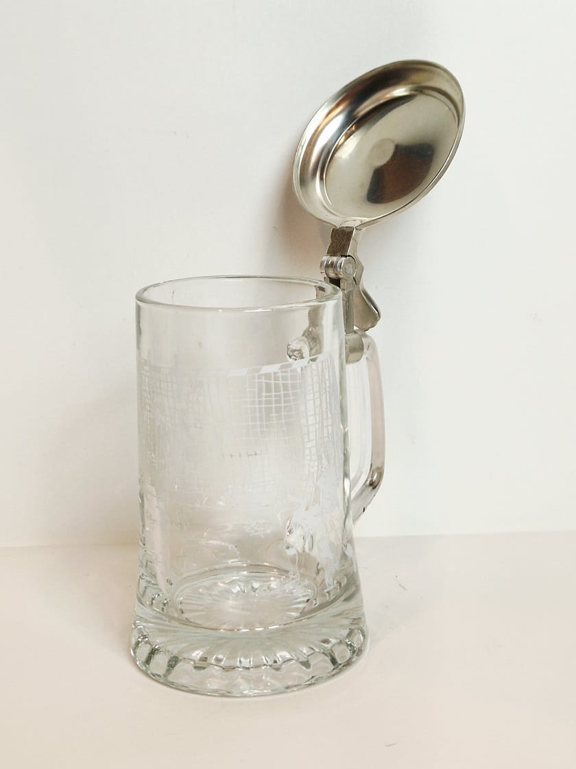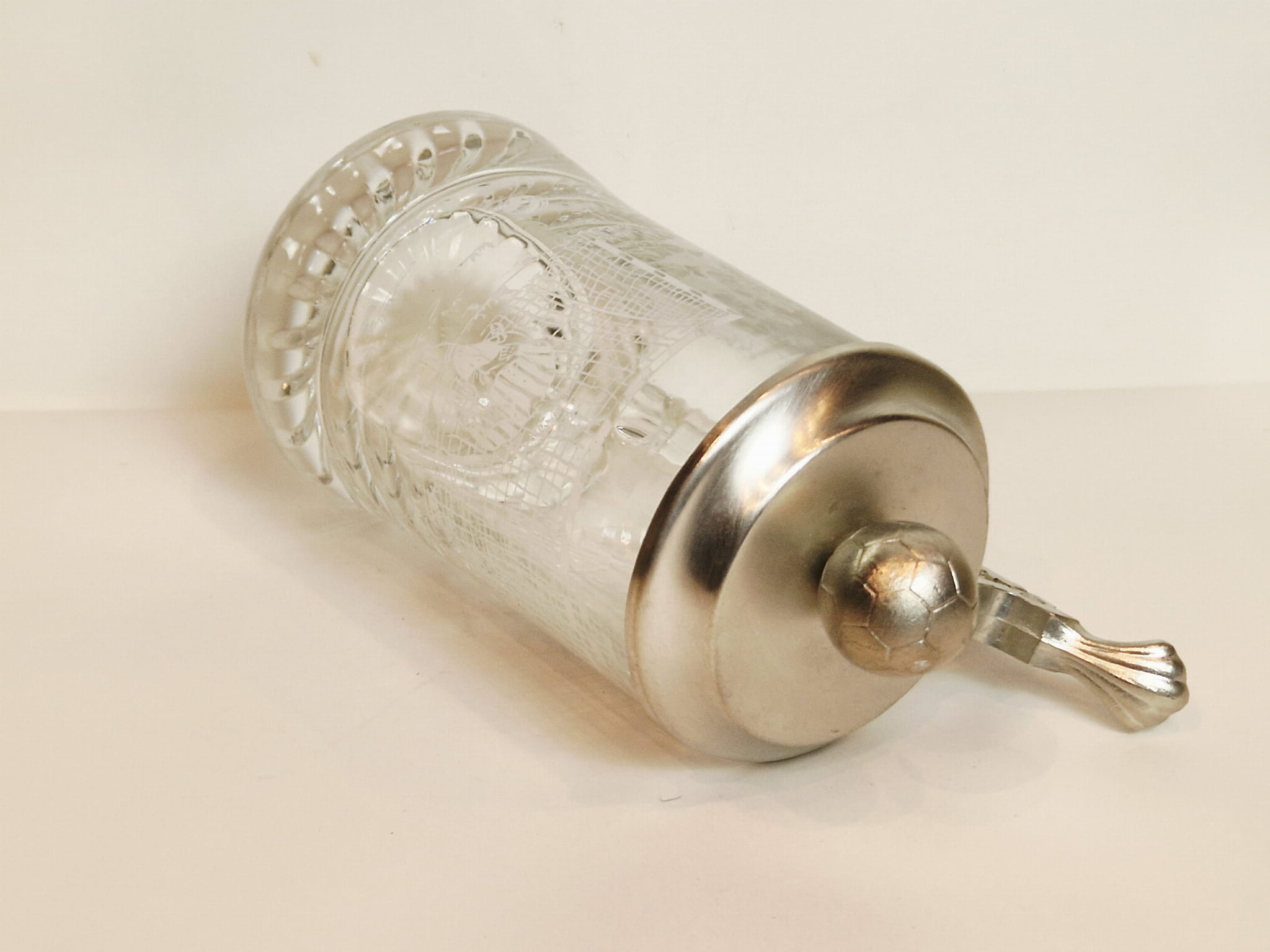 STARY (l. 60 / 70-te XX w) SYGNOWANY (five) KOLEKCJONERSKI KUFEL SZKLANY Z CYNOWĄ POKRYWKĄ
