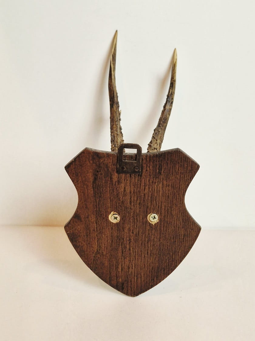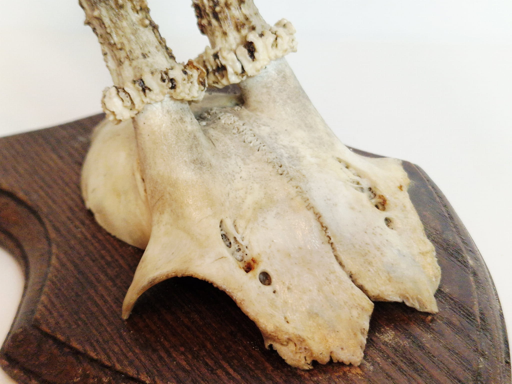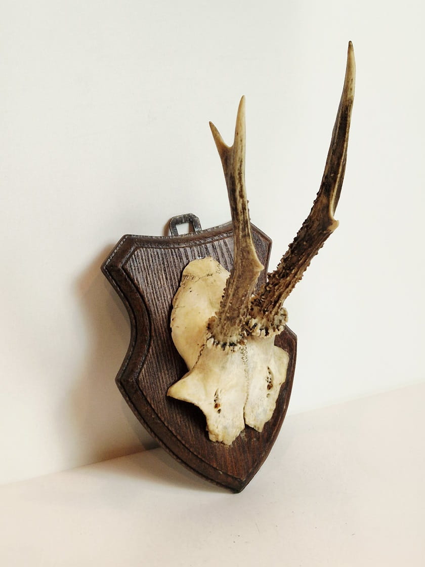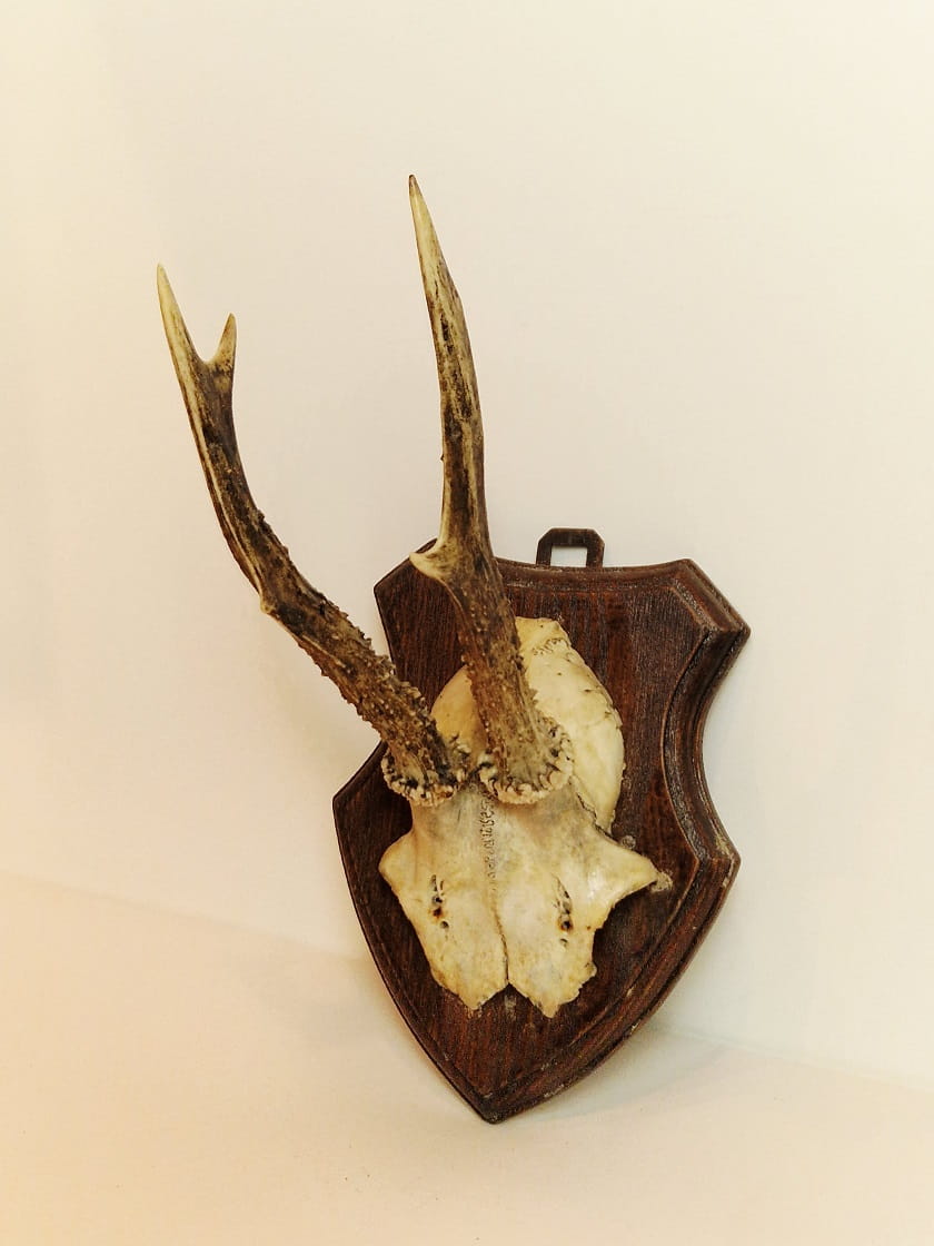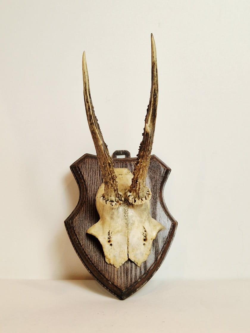 TROFEUM NA DESCE - POROŻE KOZŁA SARNY SZÓSTAKA Z FRAGMENTEM CZASZKI