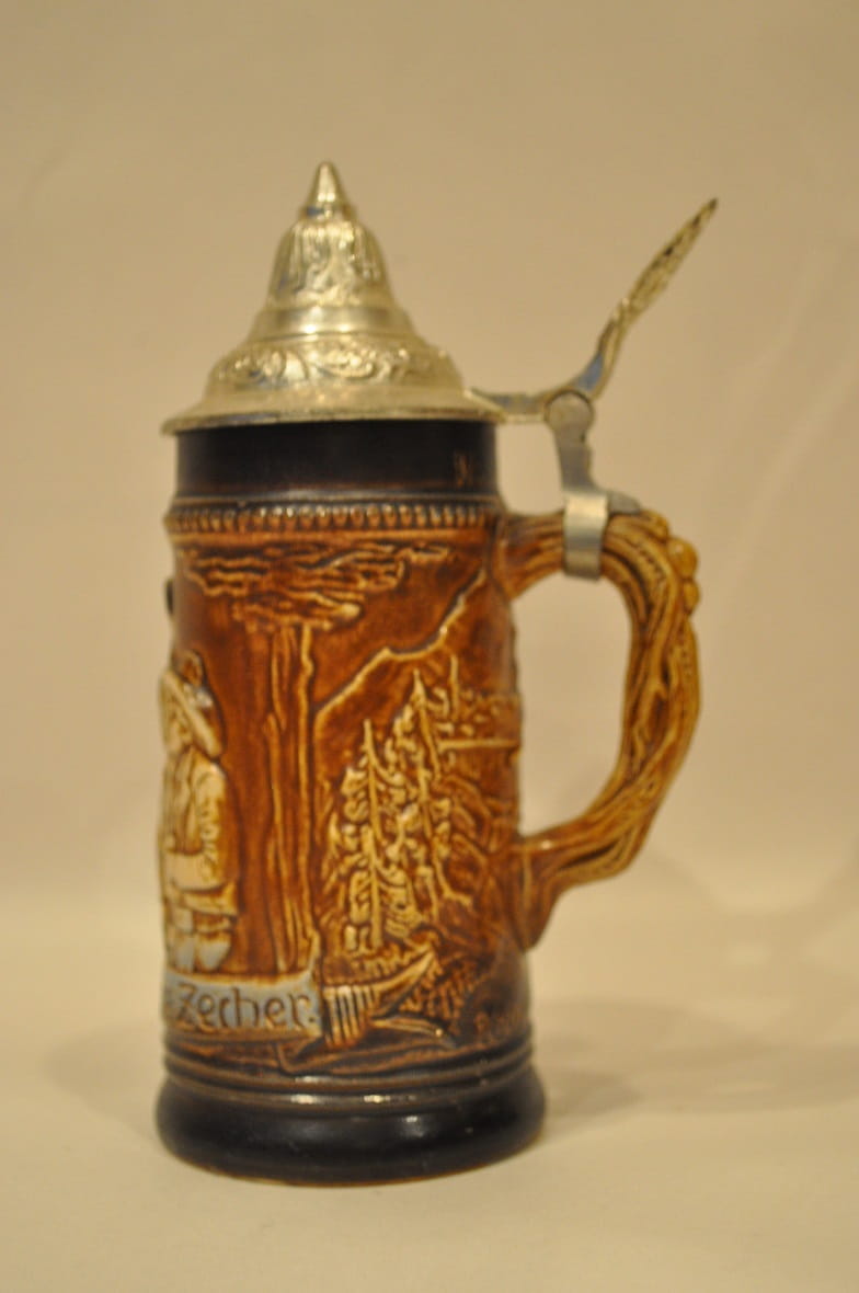 STARY (l. 60 / 70-te XX w) KOLEKCJONERSKI SYGNOWANY /#/ MAŁY (18,0 cm / 0,3 l) KUFEL CERAMICZNY Z CYNOWĄ POKRYWKĄ