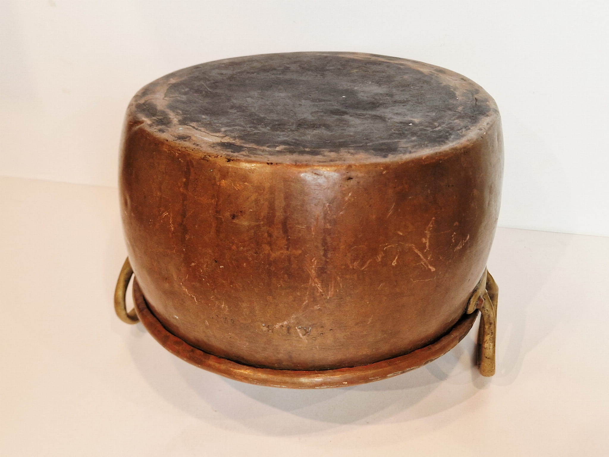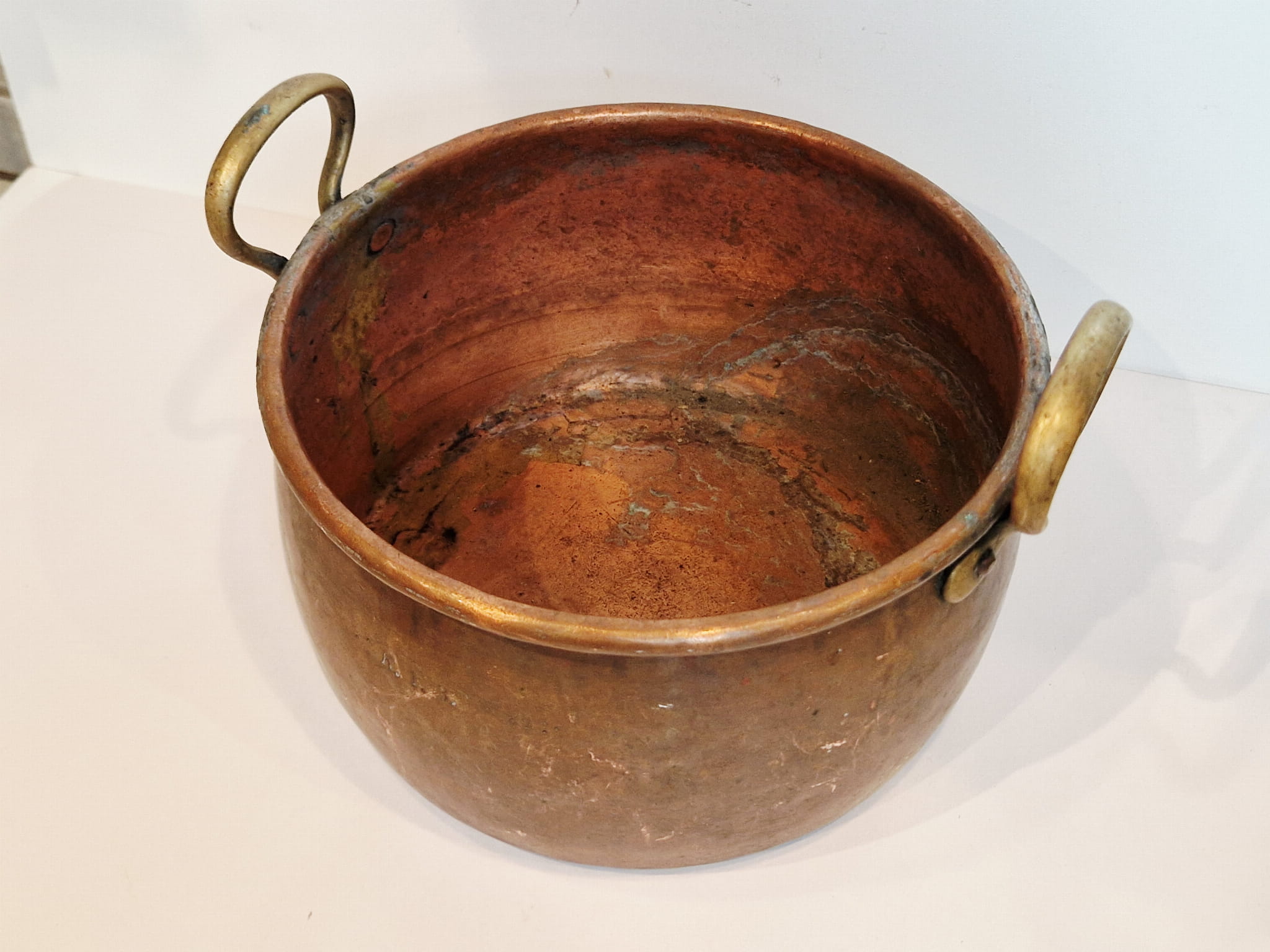 Garnek nie był czyszczony - miedź pokryta oryginalną, starą, ciemną patyną.