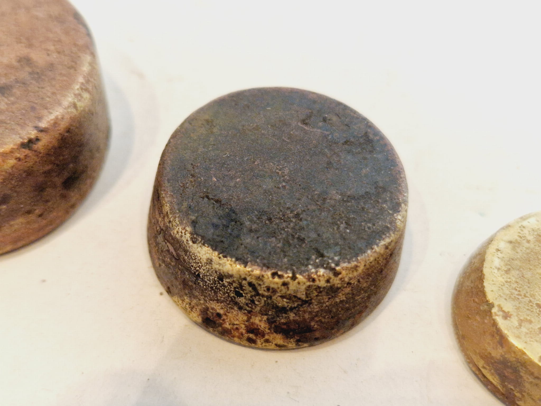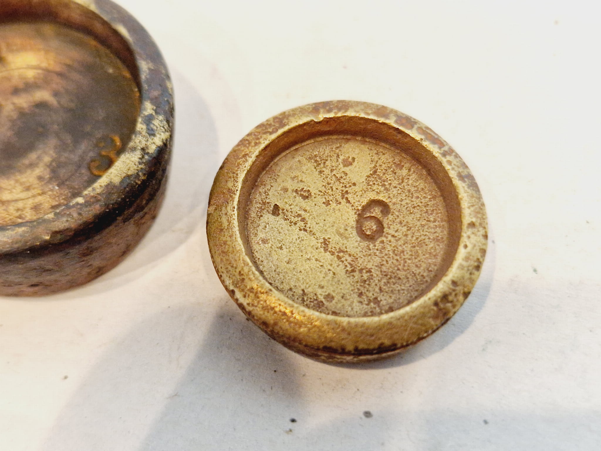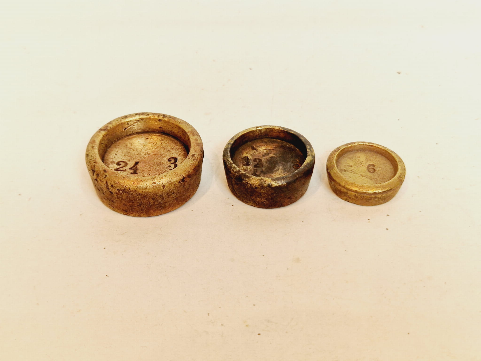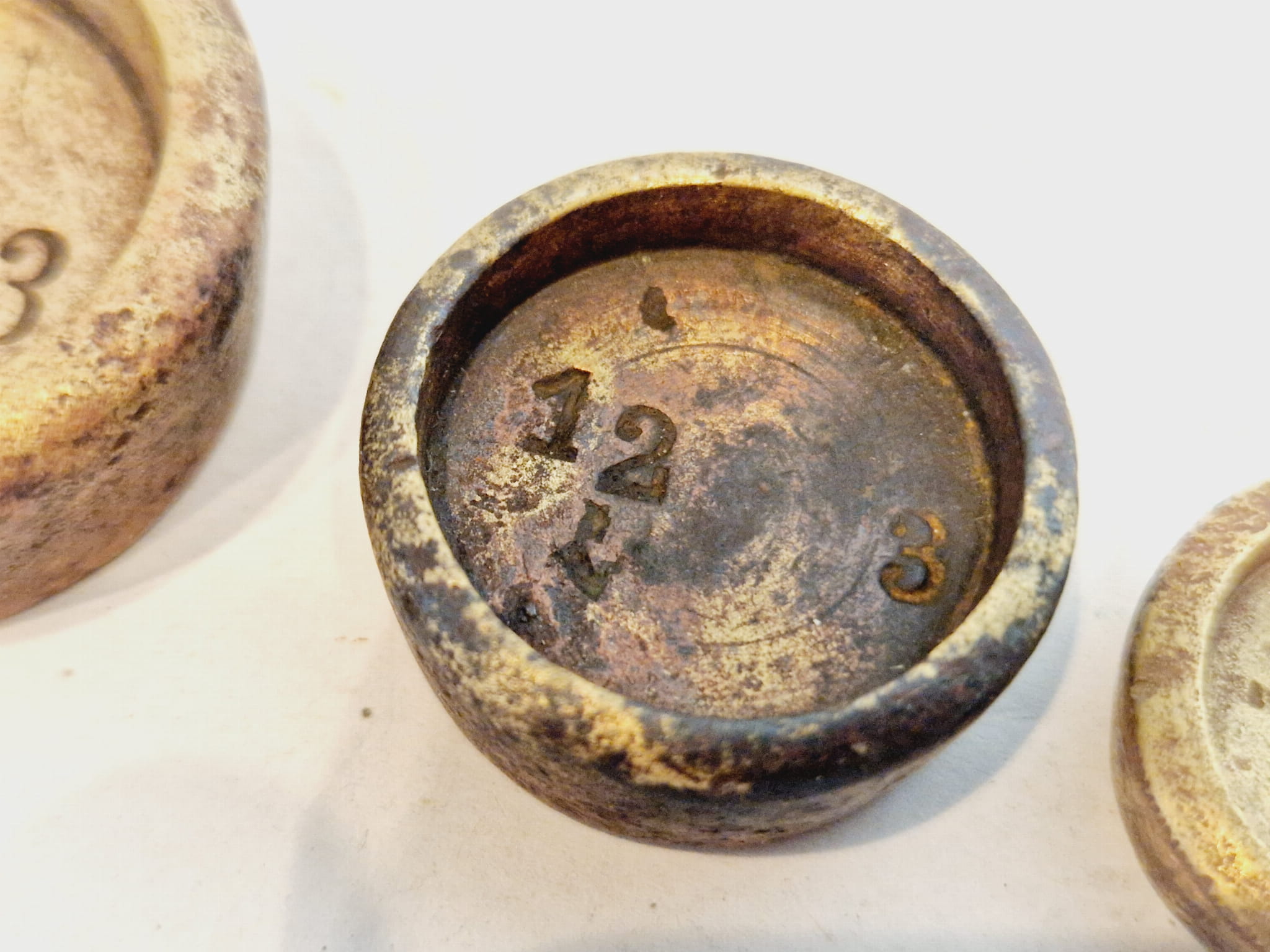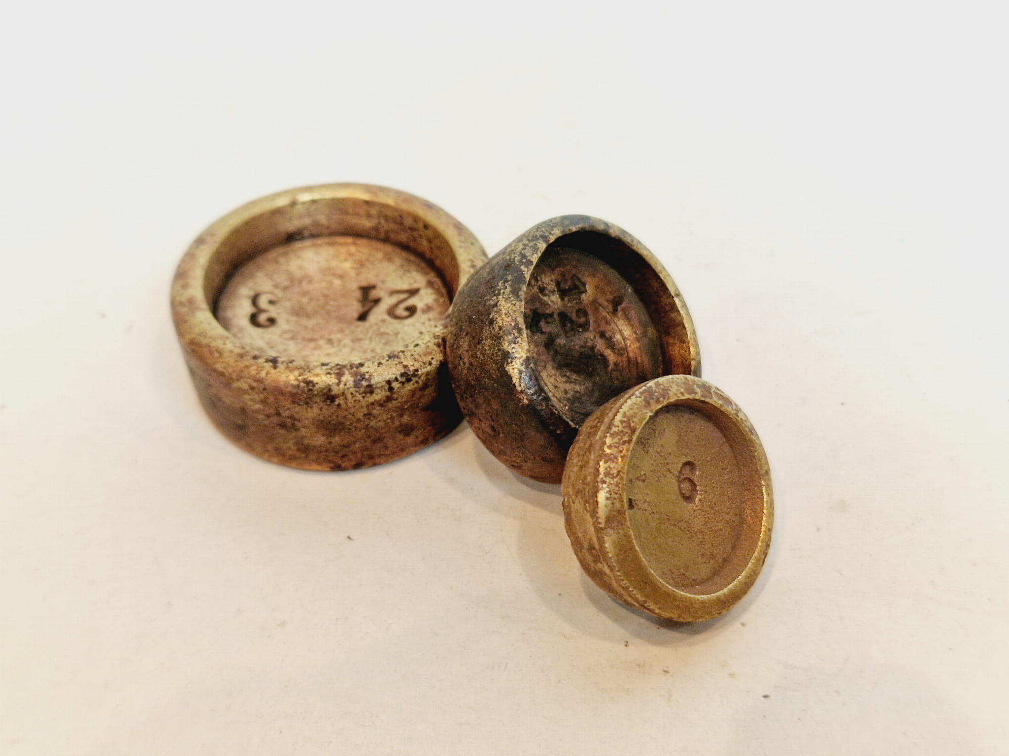 Odważniki nie były czyszczone, pokryte są oryginalną, starą, patyną.