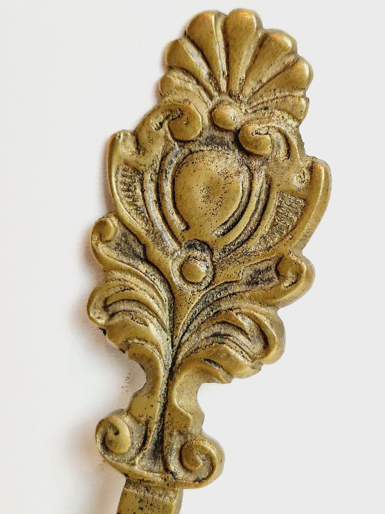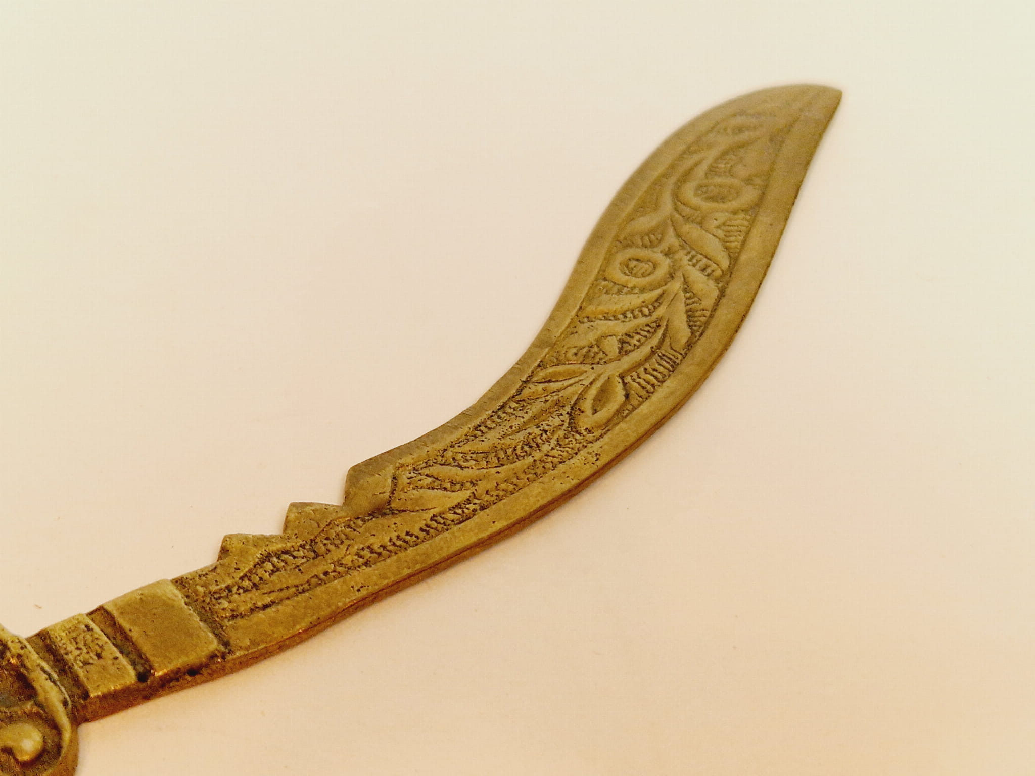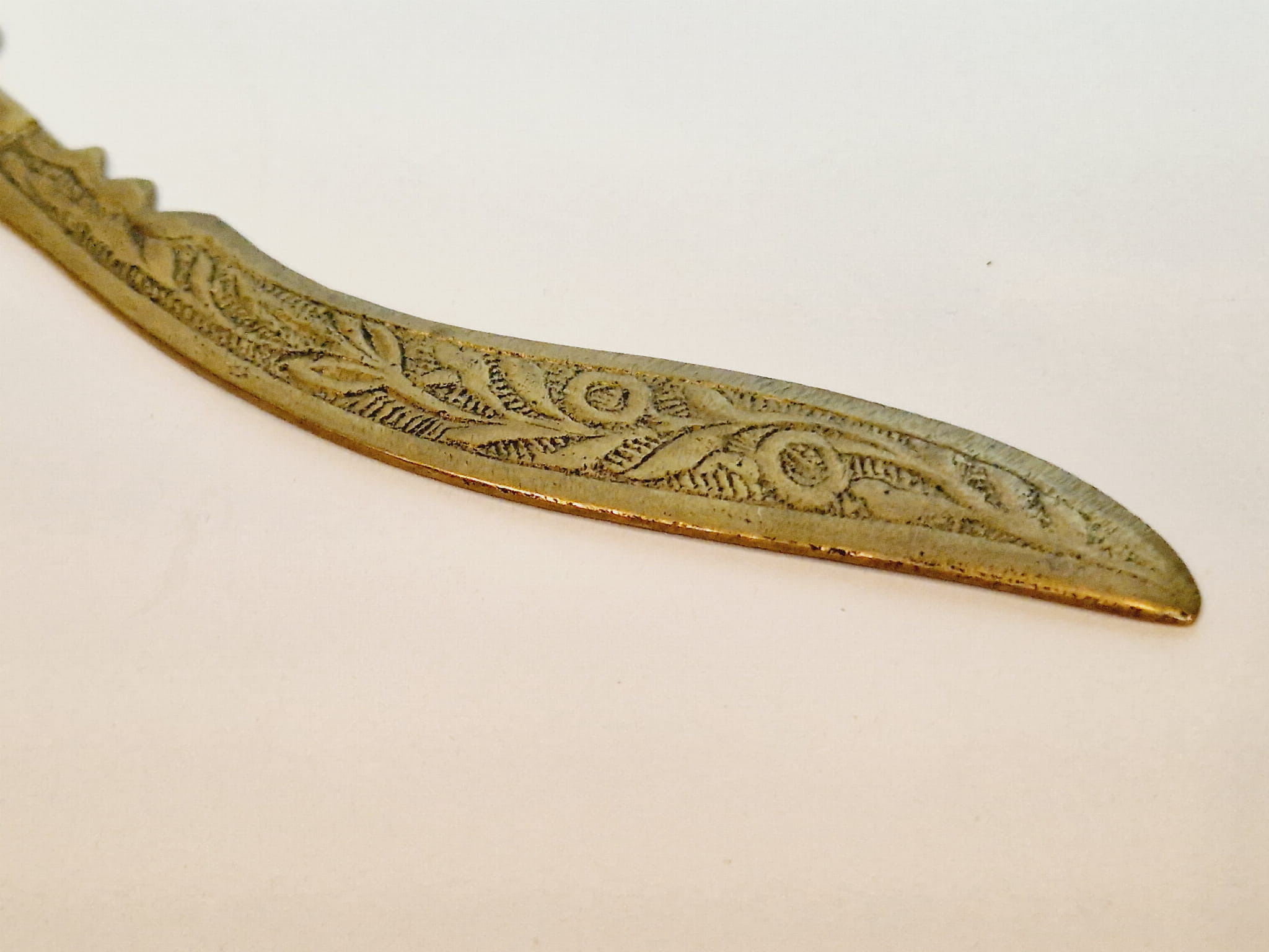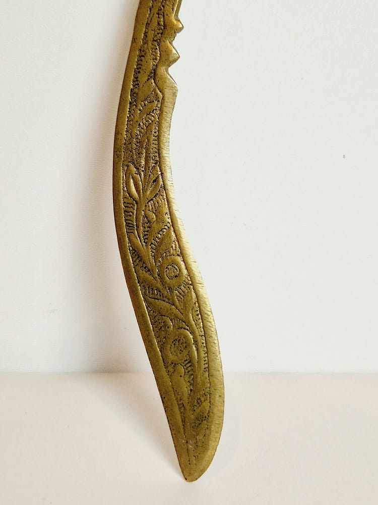 Mosiądz pokryty oryginalną, starą, ciemną patyną - nóż nie był czyszczony.