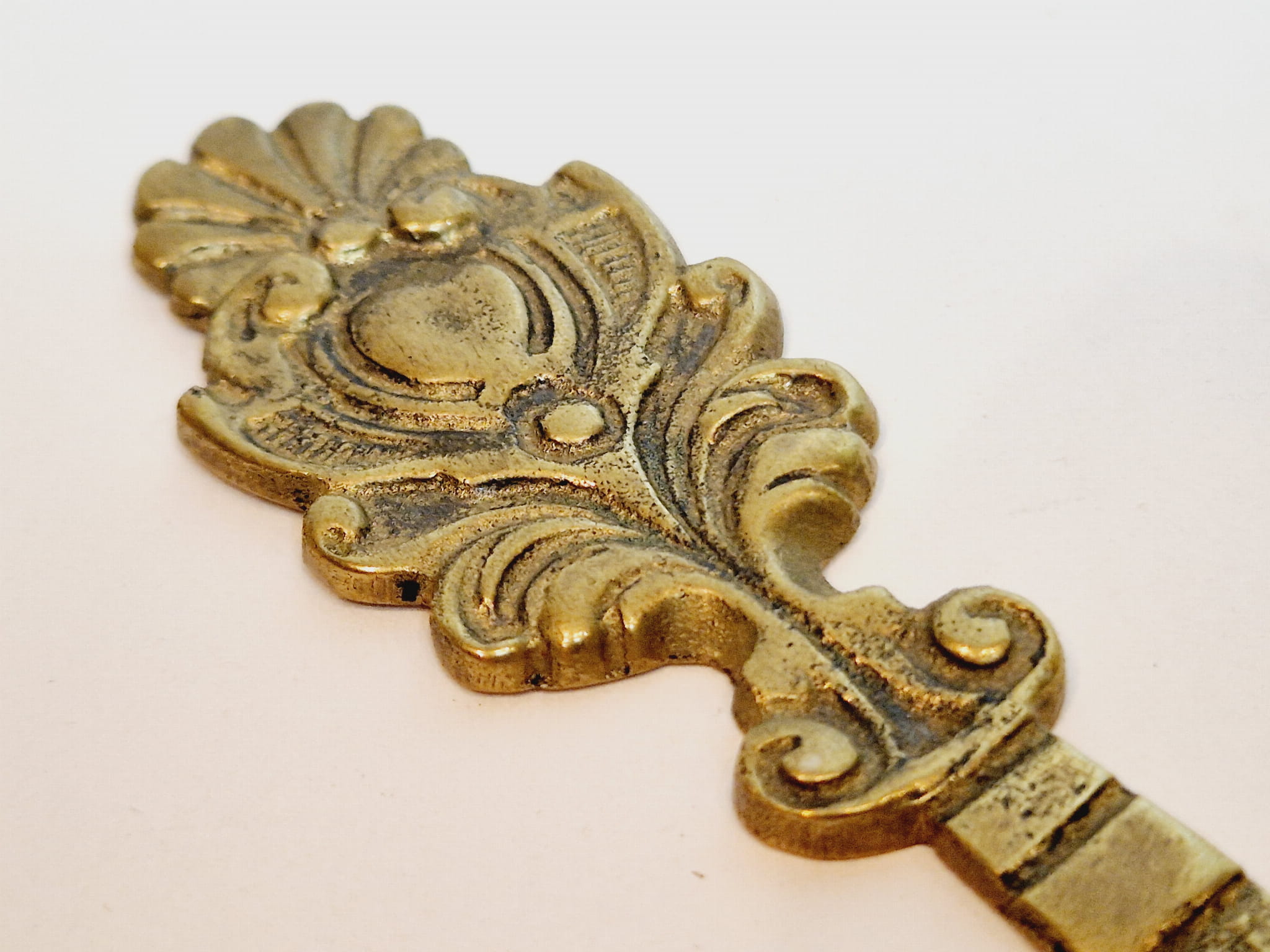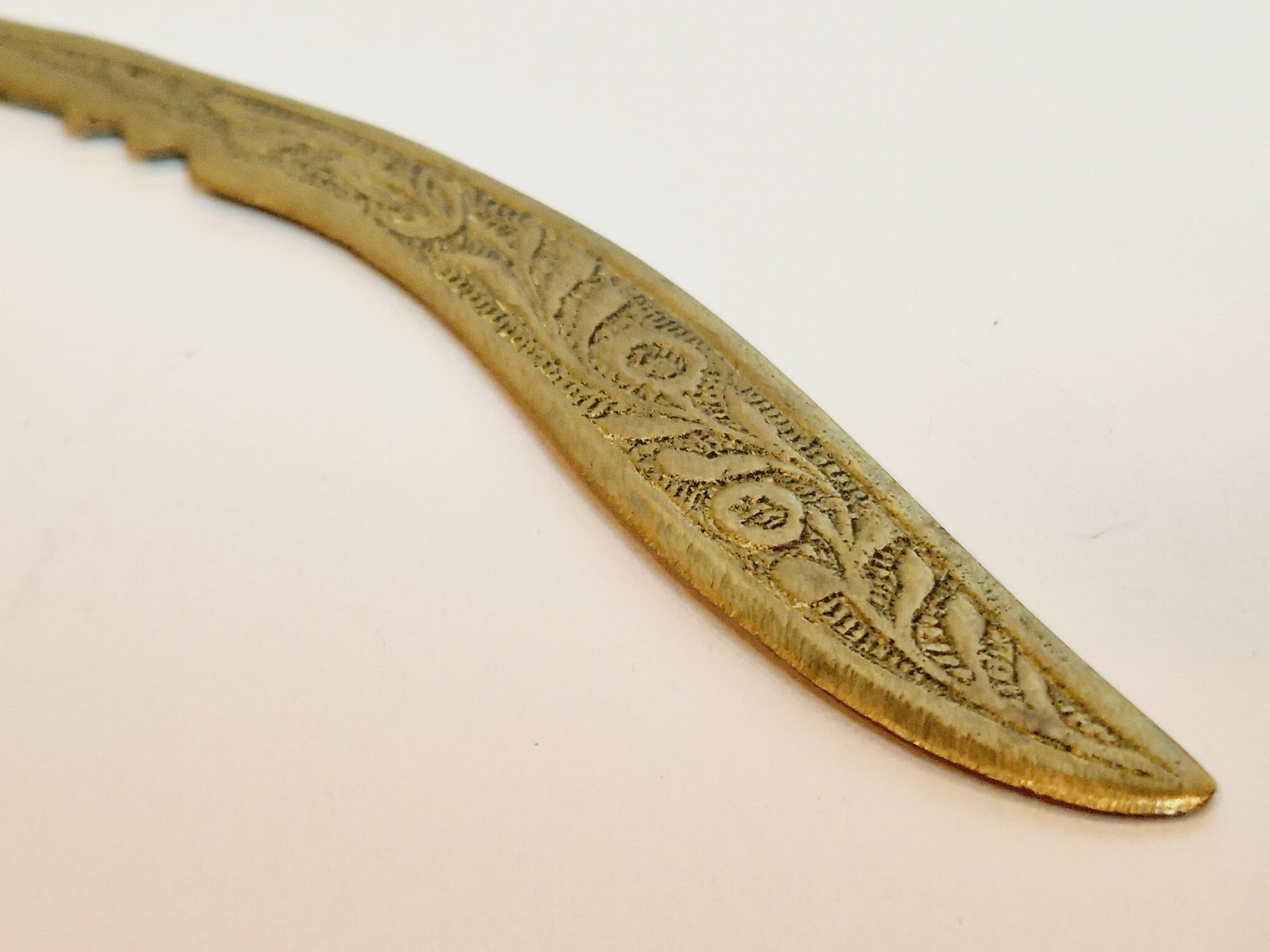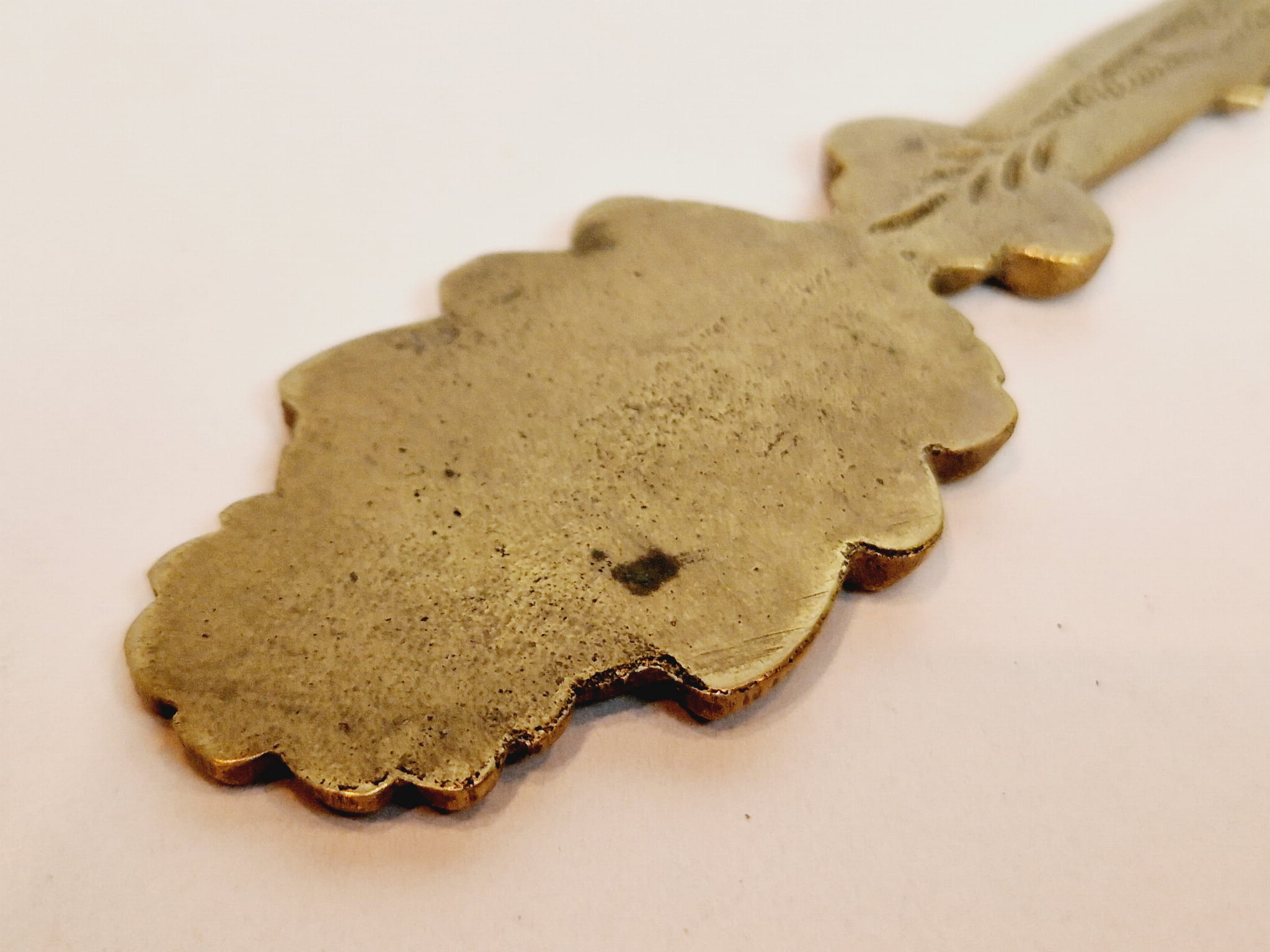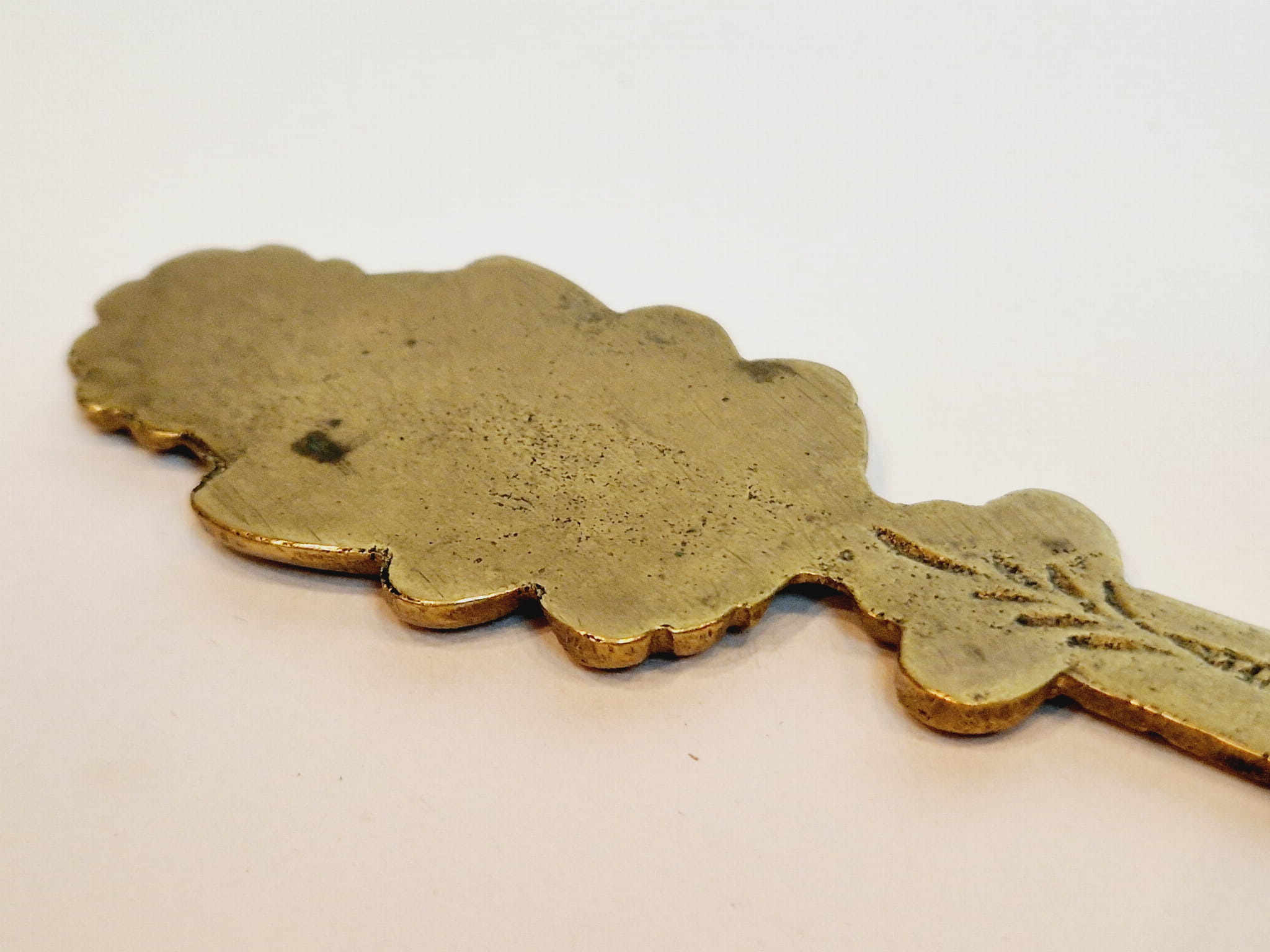 Mosiądz pokryty oryginalną, starą, ciemną patyną - nóż nie był czyszczony.