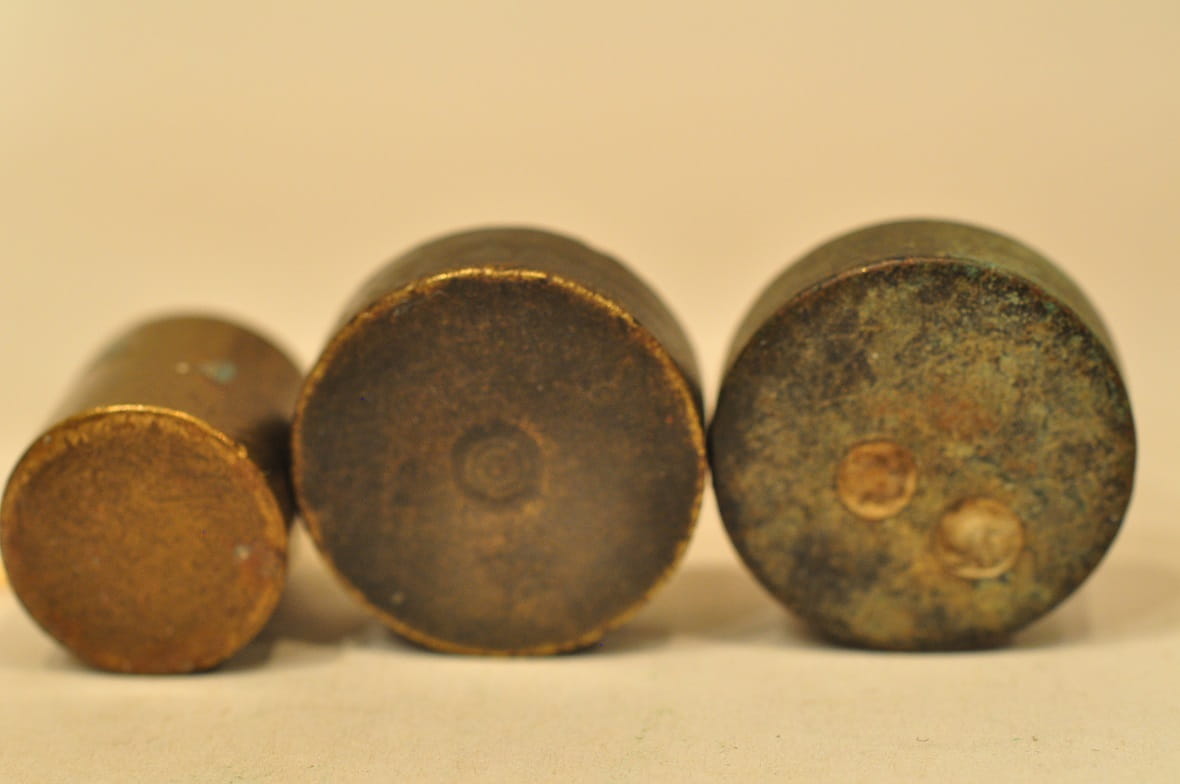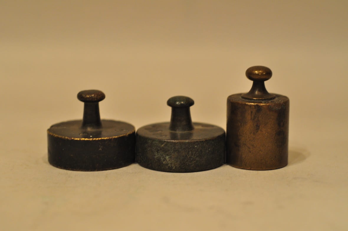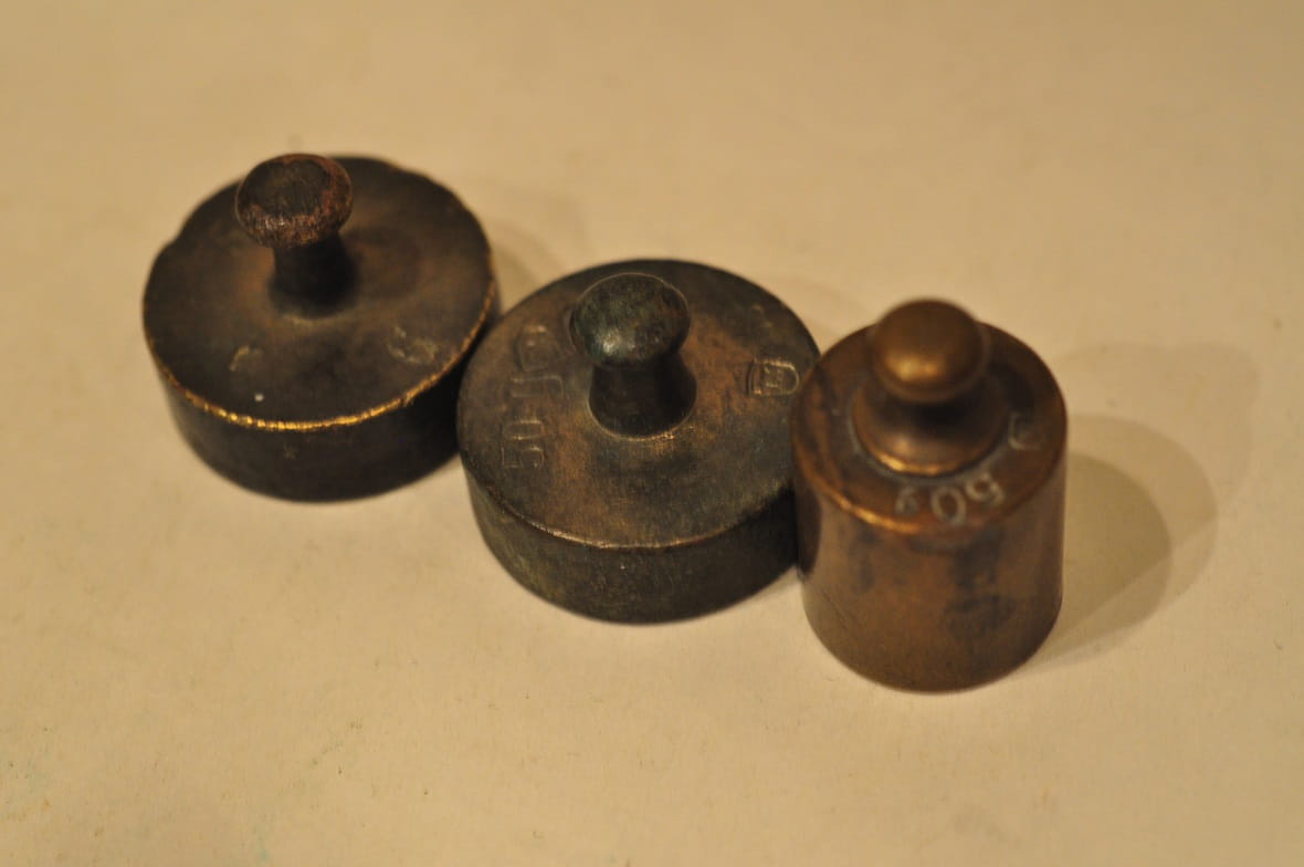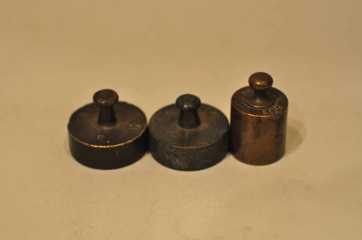 Odważniki nie były czyszczone, pokryte są oryginalną, starą, ciemną patyną.