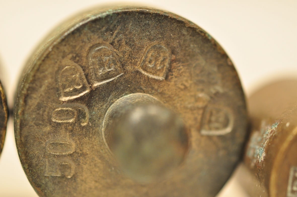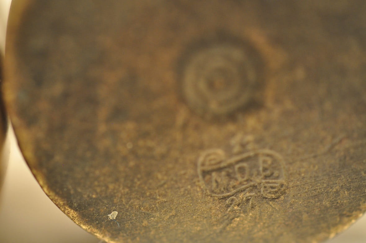 Spody płaskich odważników sygnowane znakami legalizacji - częściowo nieczytelne.