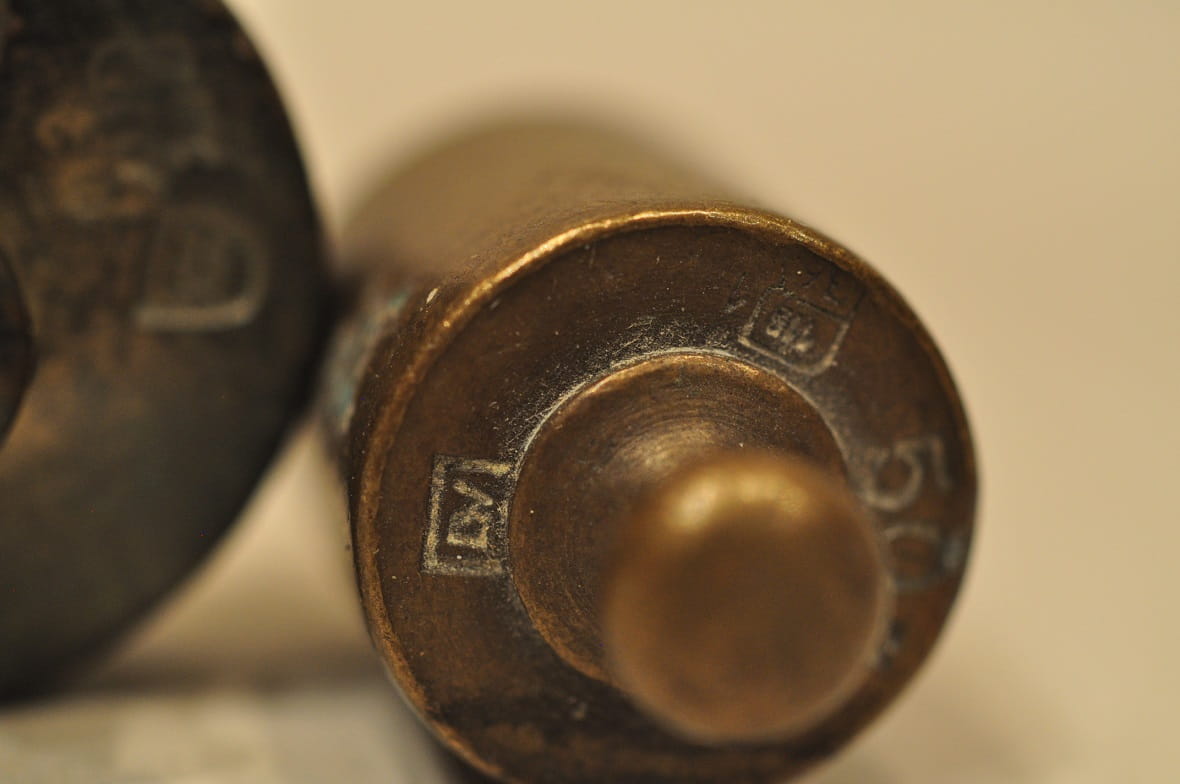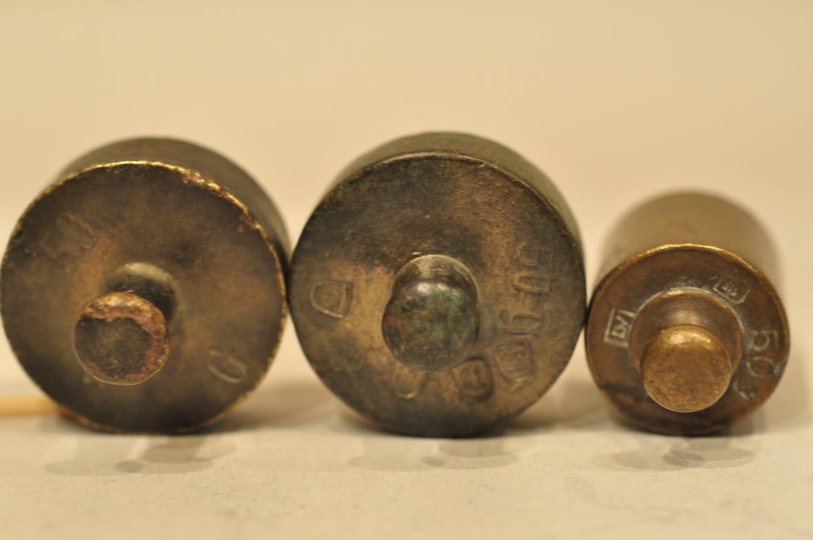 Kołnierze odważników sygnowane nominałami oraz znakami legalizacji.