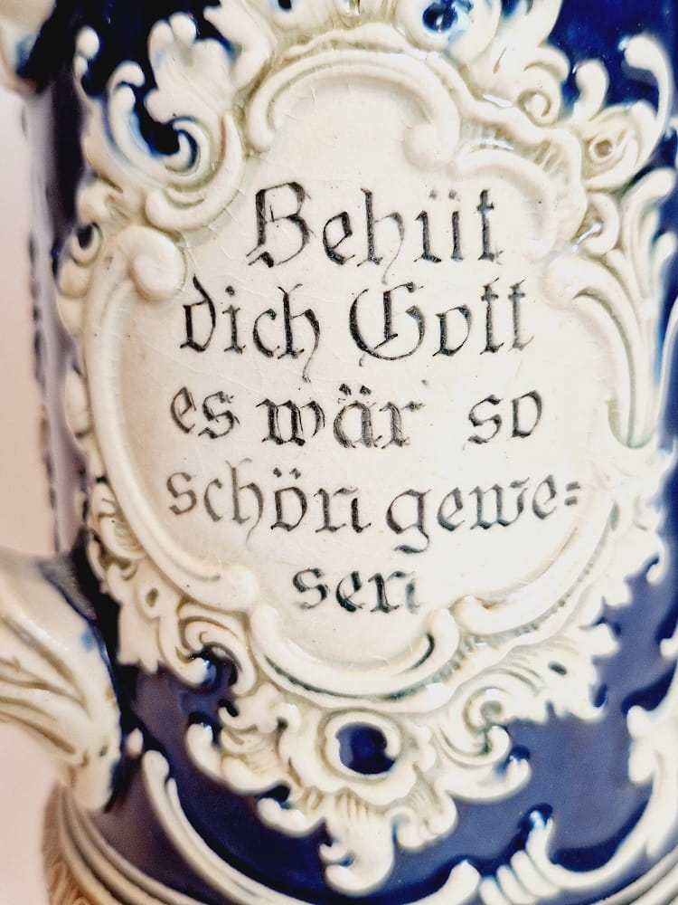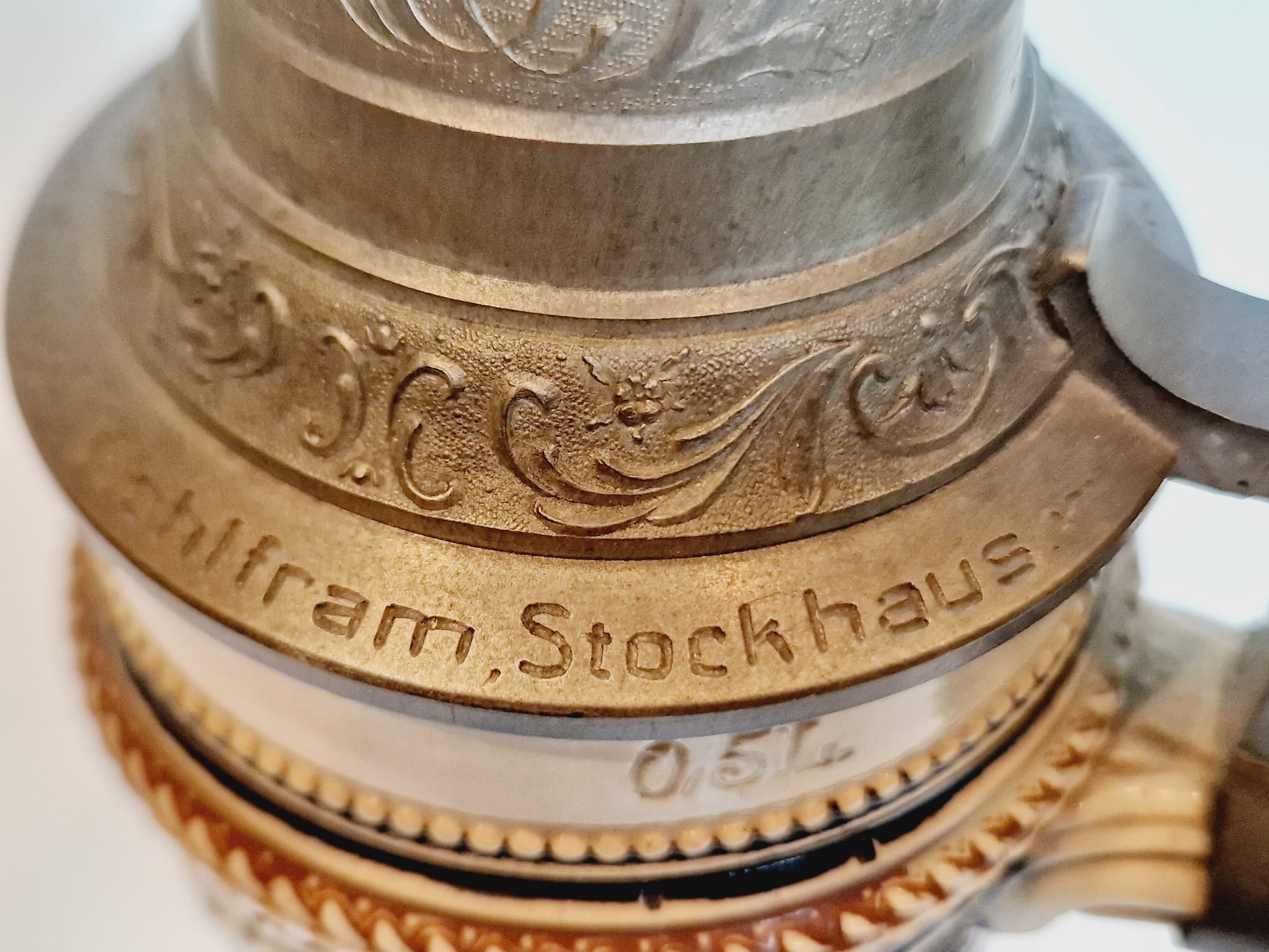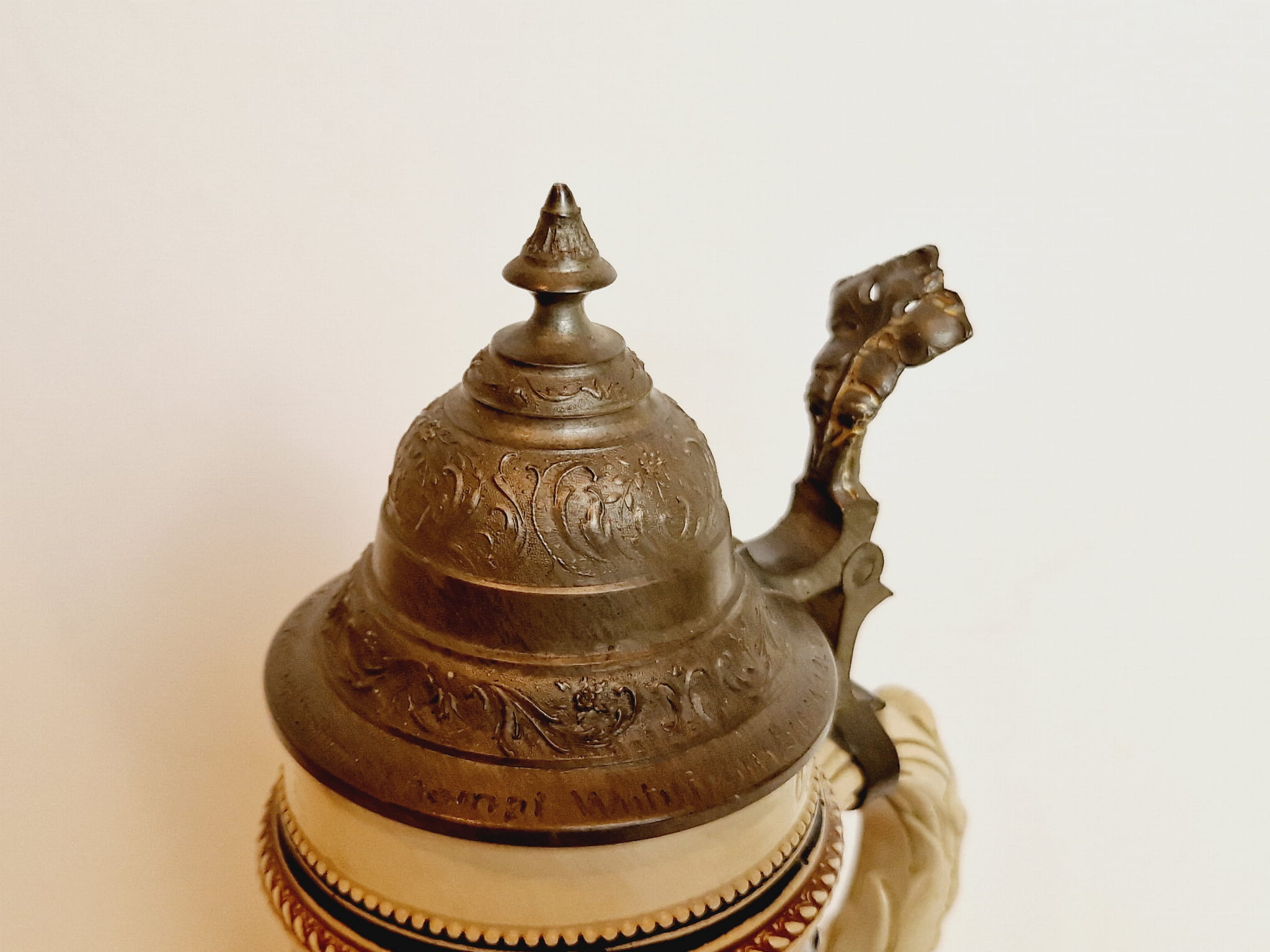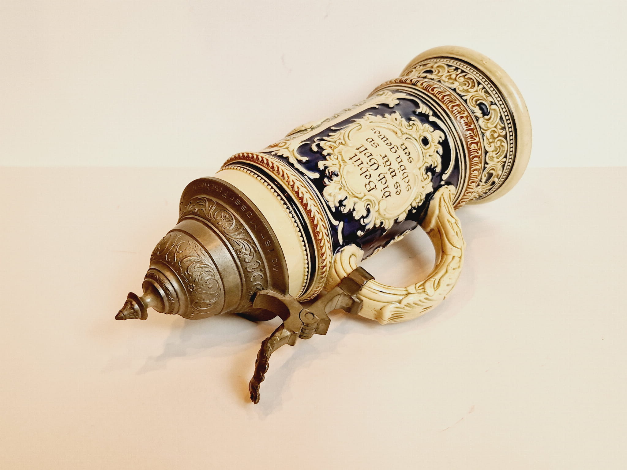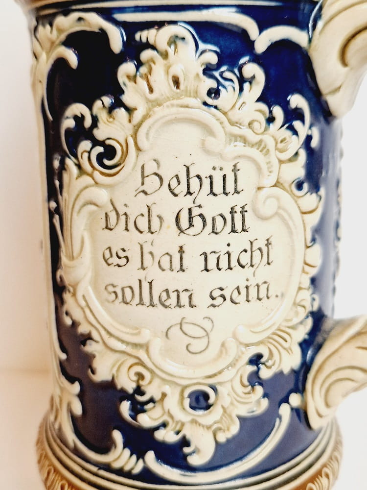 ORYGINALNY ZABYTKOWY (XIX / XX w) SYGNOWANY MASYWNY (27,0 cm / 942 g) BOGATO ZDOBIONY KUFEL KAMIONKOWY Z CYNOWĄ POKRYWKĄ