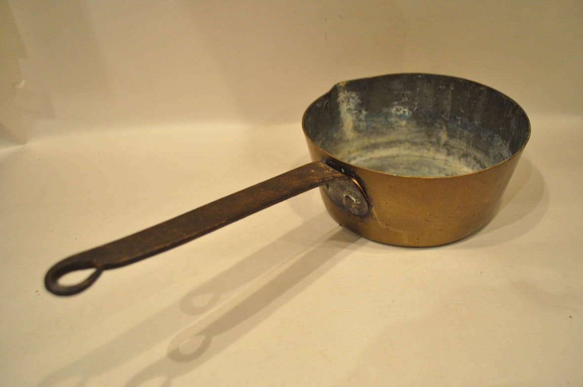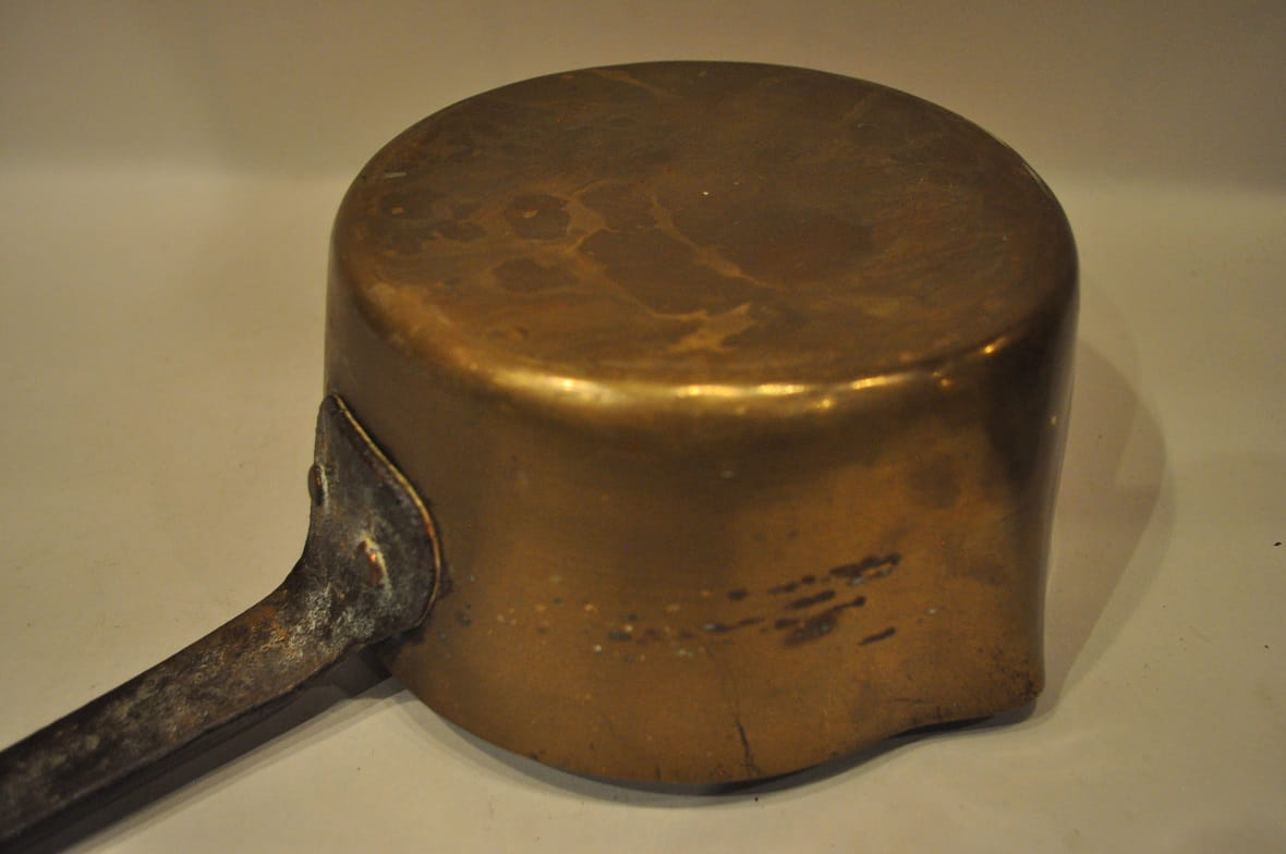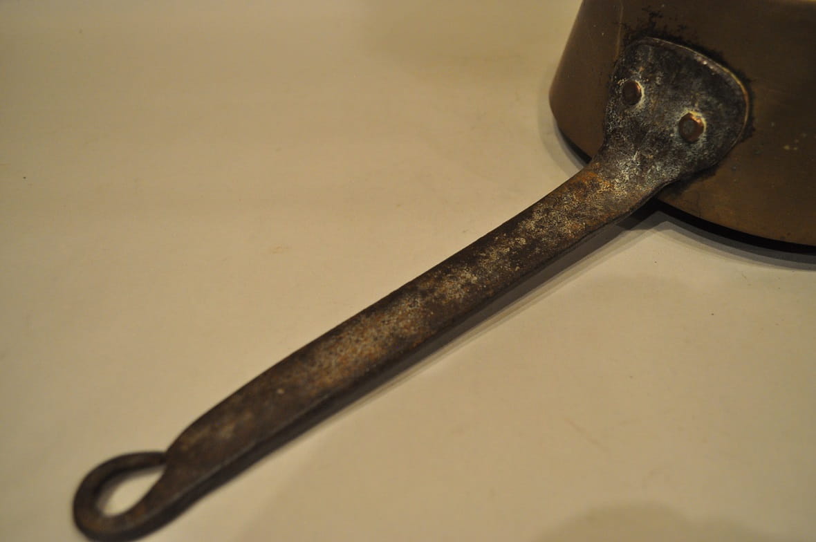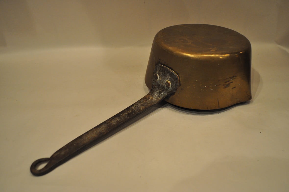 ZABYTKOWY (XIX / XX w) MASYWNY (37,5 cm / 907 g) MOSIĘŻNY RONDEL - GARNEK Z ŻELAZNYM UCHWYTEM