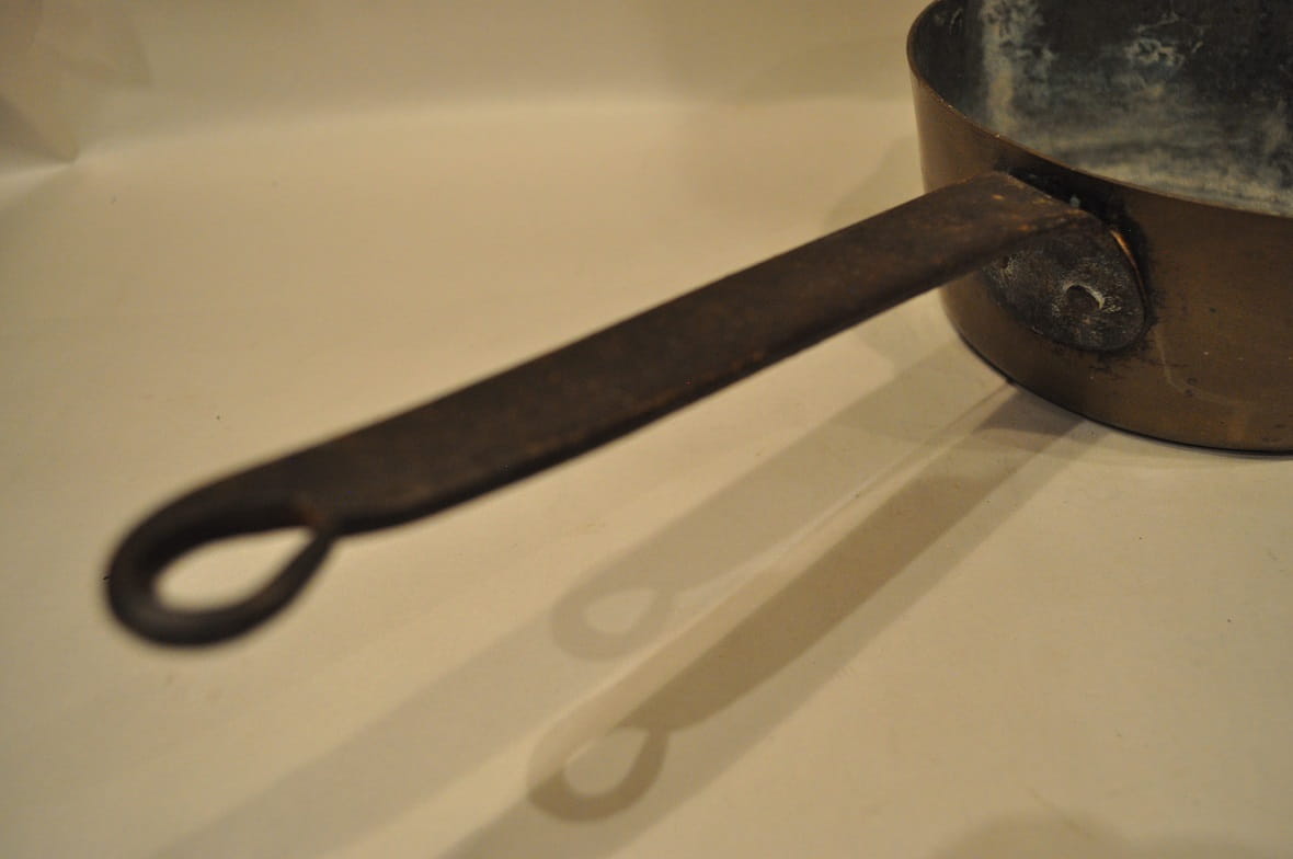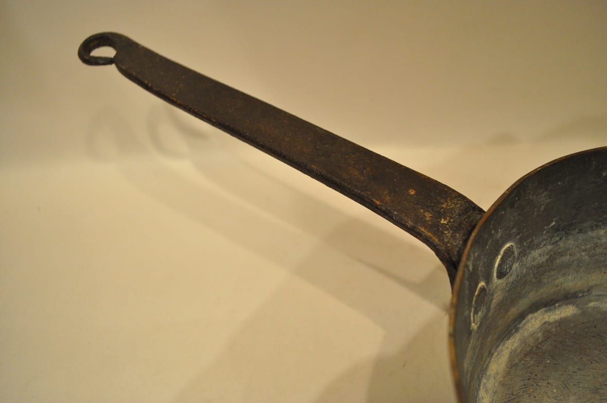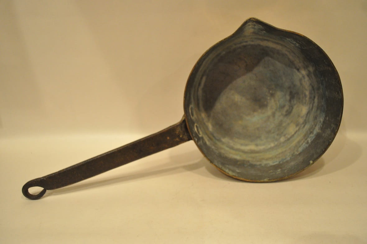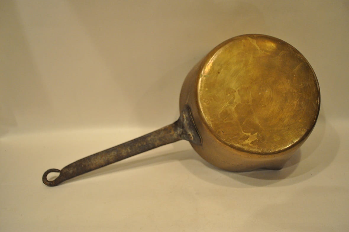 ZABYTKOWY (XIX / XX w) MASYWNY (37,5 cm / 907 g) MOSIĘŻNY RONDEL - GARNEK Z ŻELAZNYM UCHWYTEM