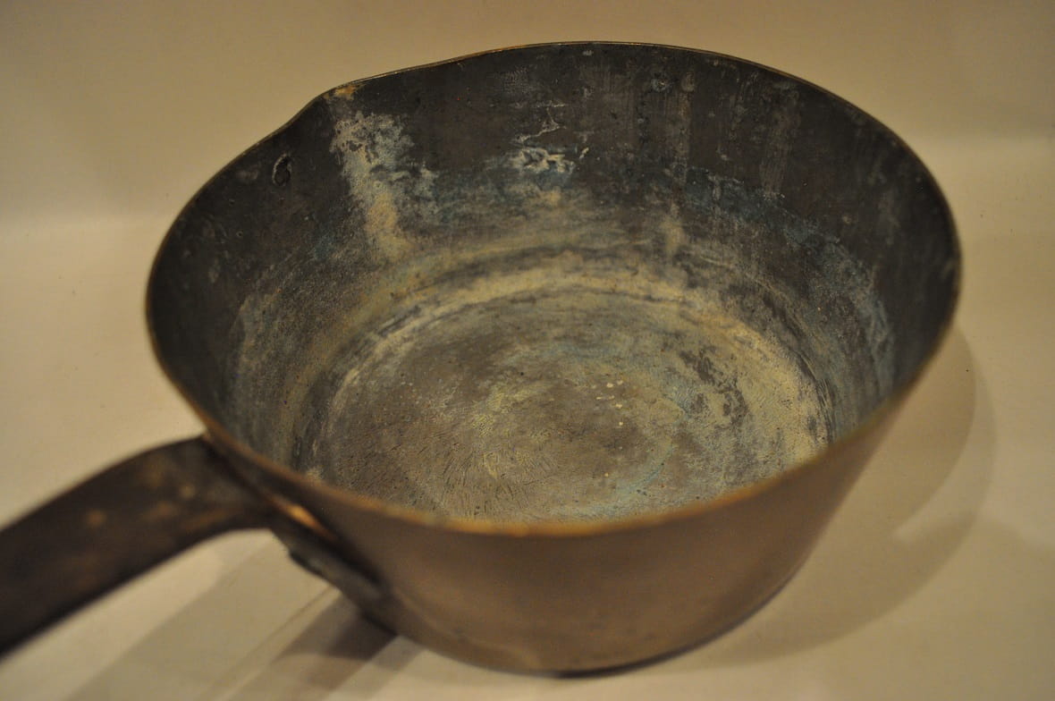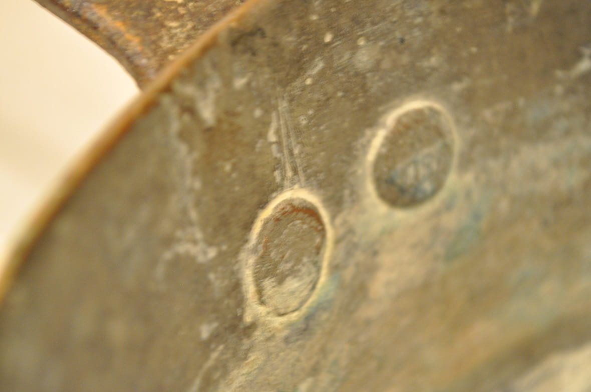 Powierzchnia zewnętrzna naczynia z oryginalną, starą, ciemną patyną.