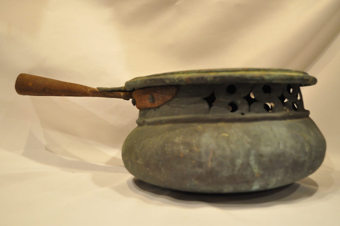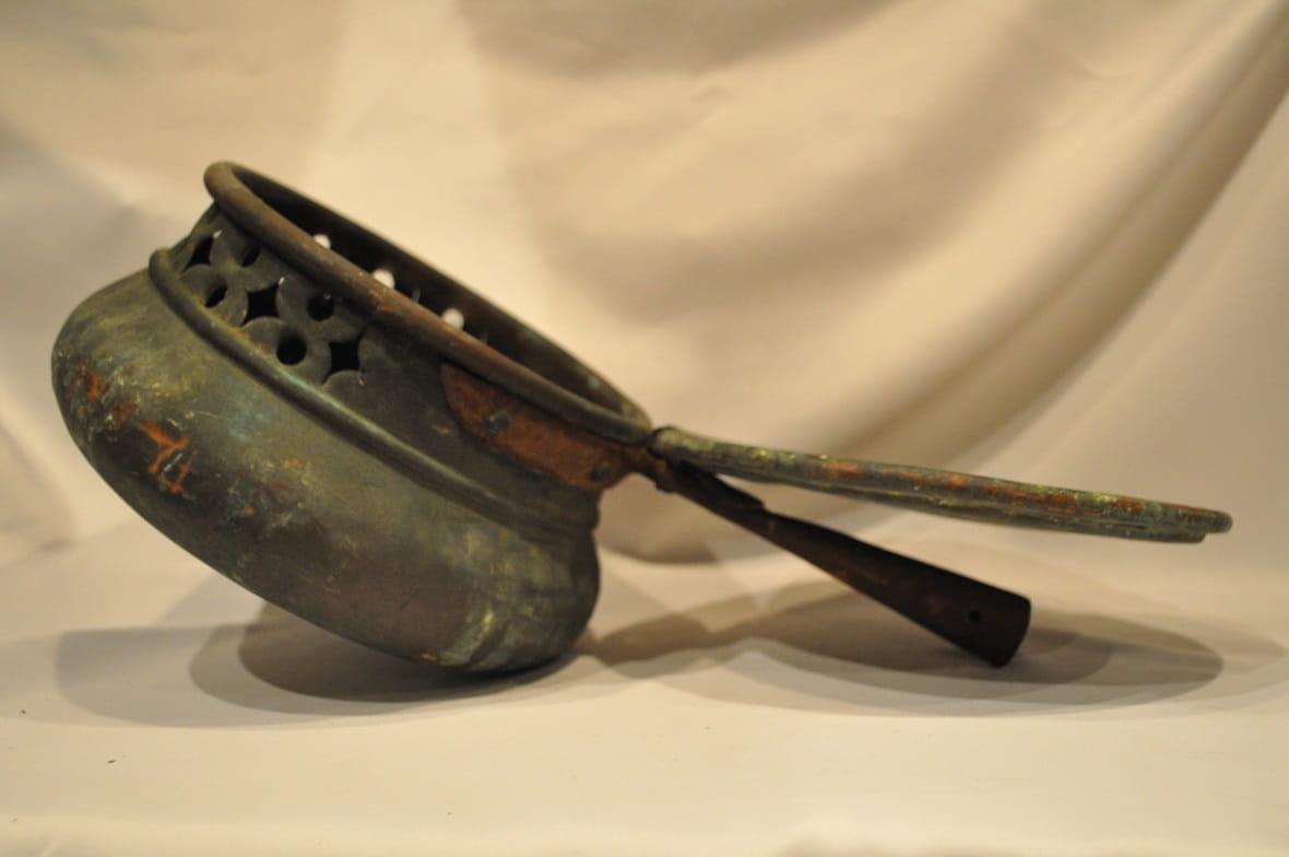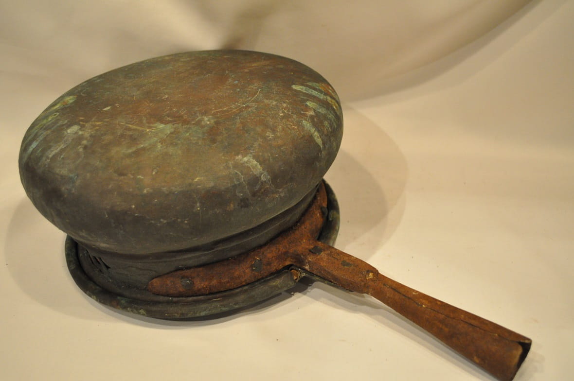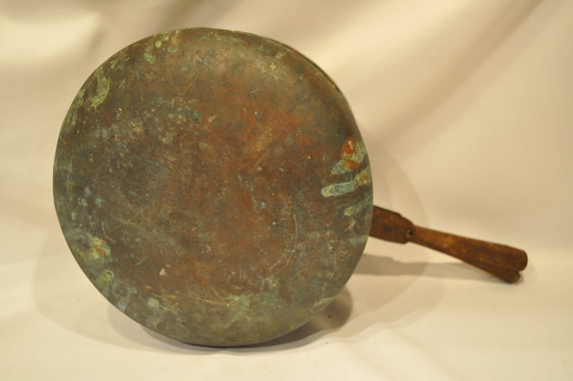 ZABYTKOWA (XVIII / XIX w) MASYWNA (2,13 kg) MIEDZIANA SZKANDELA - OGRZEWACZ Z ŻELAZNYM UCHWYTEM
