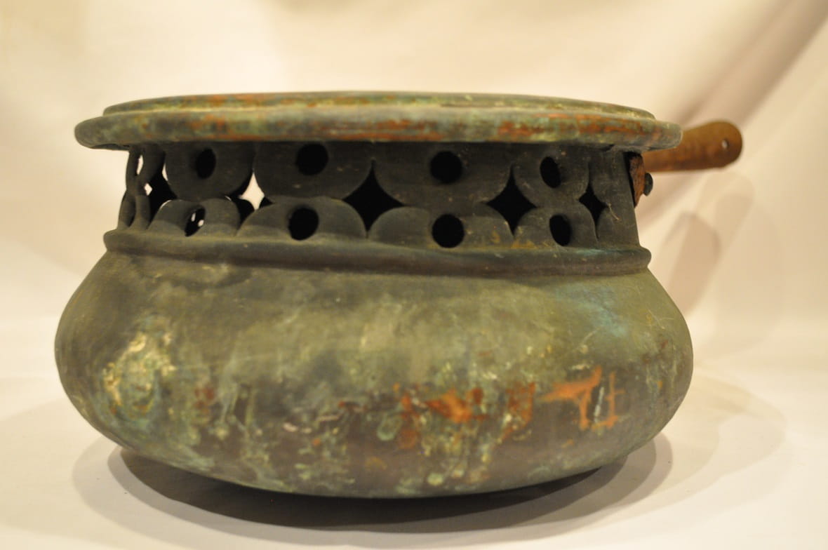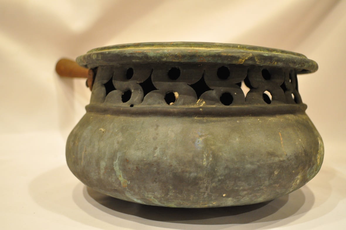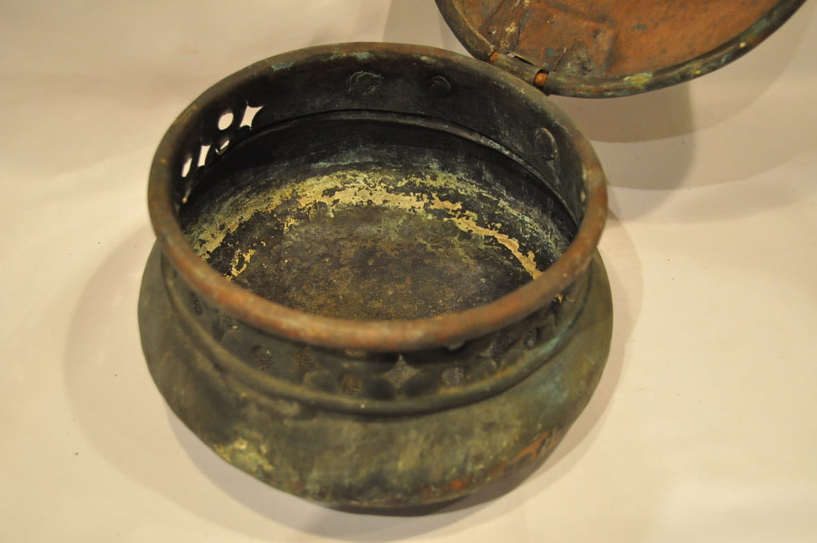 Naczynie nie było czyszczone - pokryte jest oryginalnym, starą, ciemną, zielonkawą patyną.