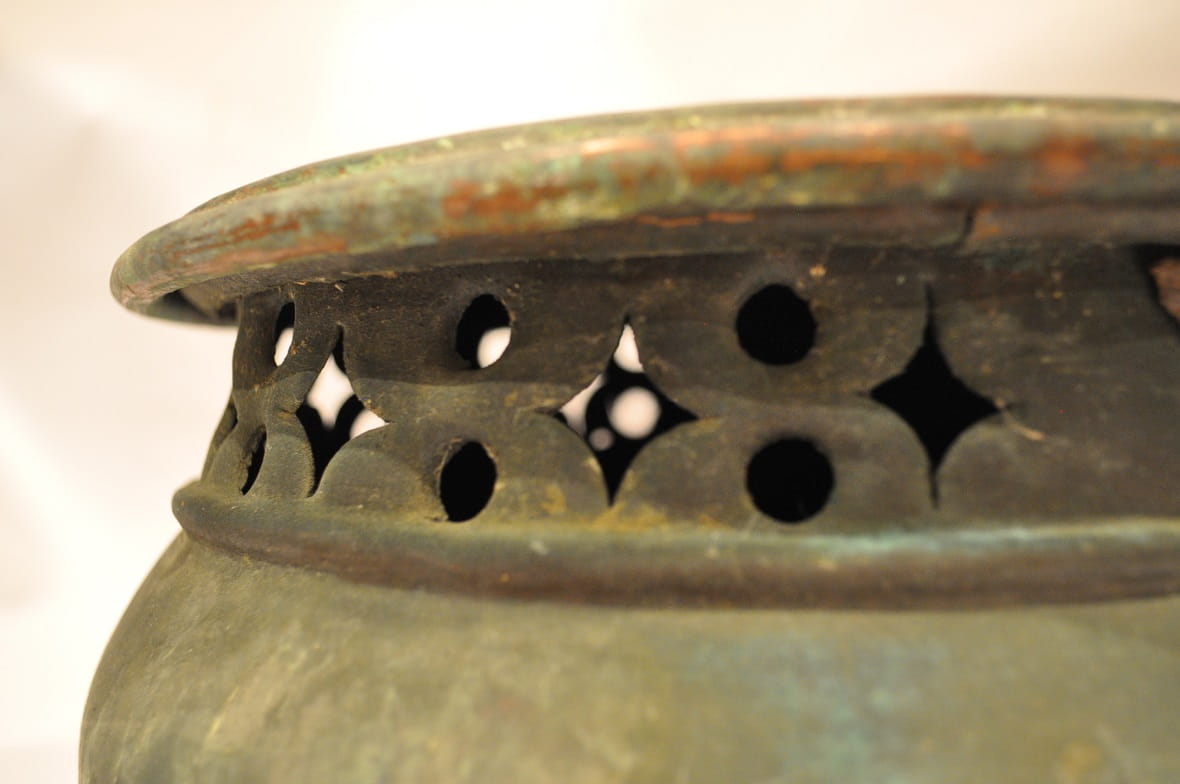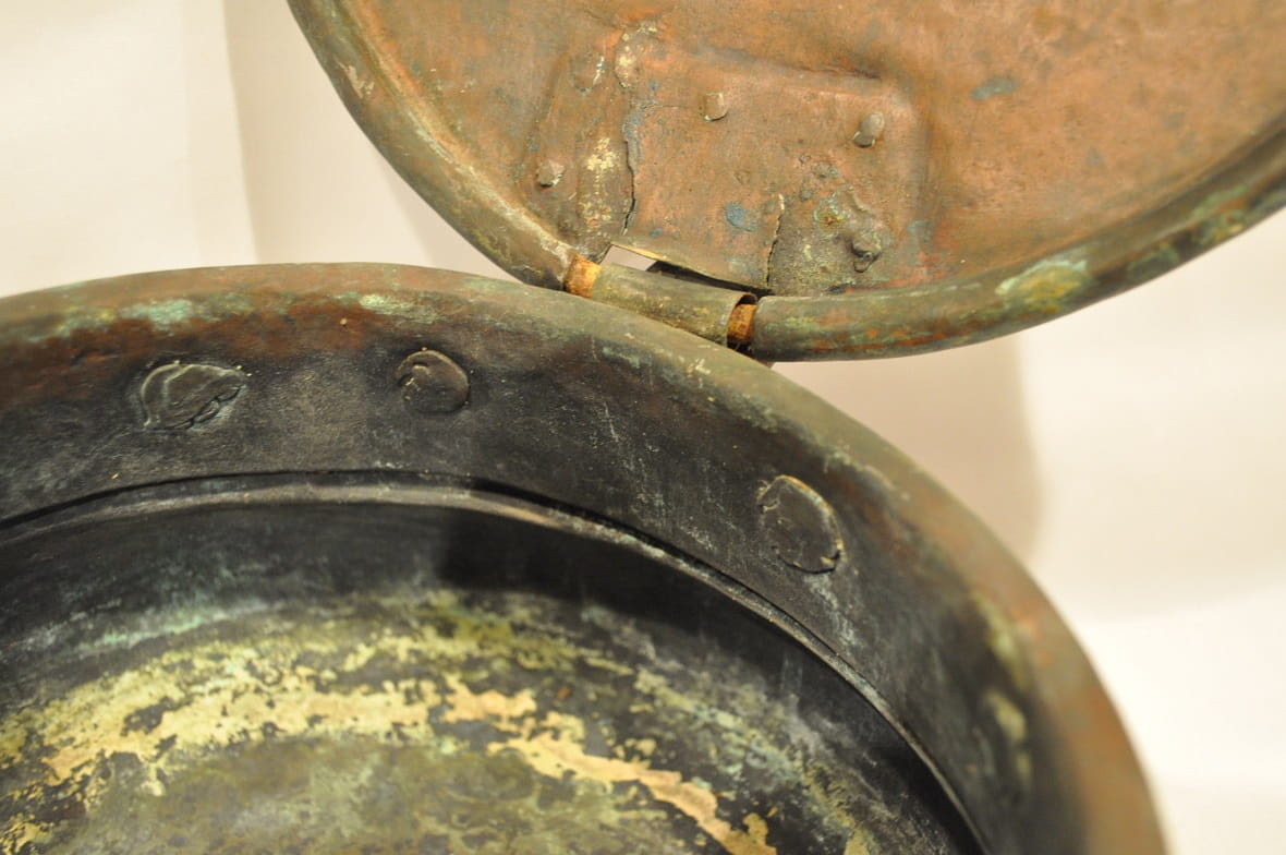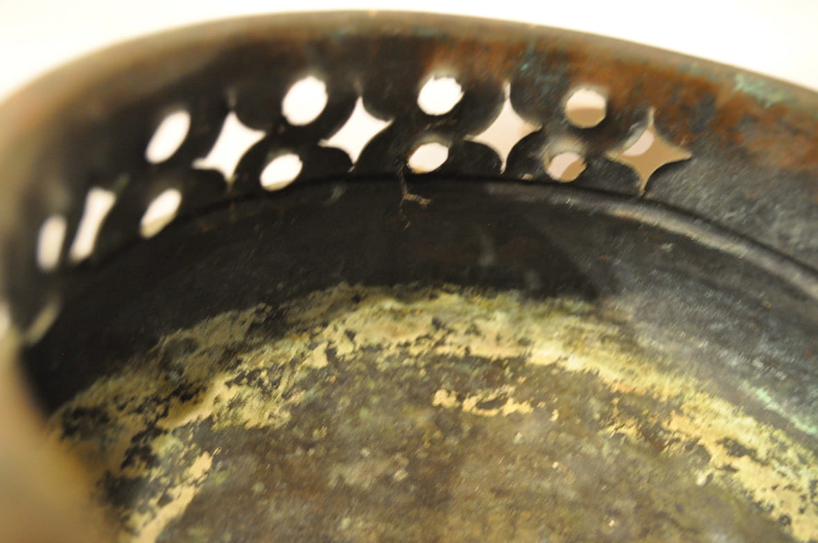 Powierzchnia zewnętrzna naczynia z oryginalną starą, ciemną, zielonkawą patyną.