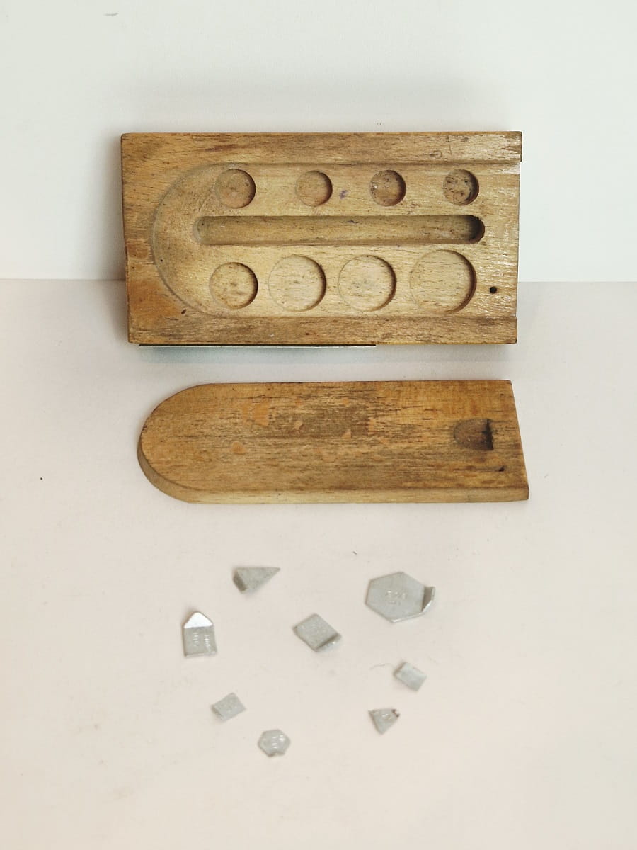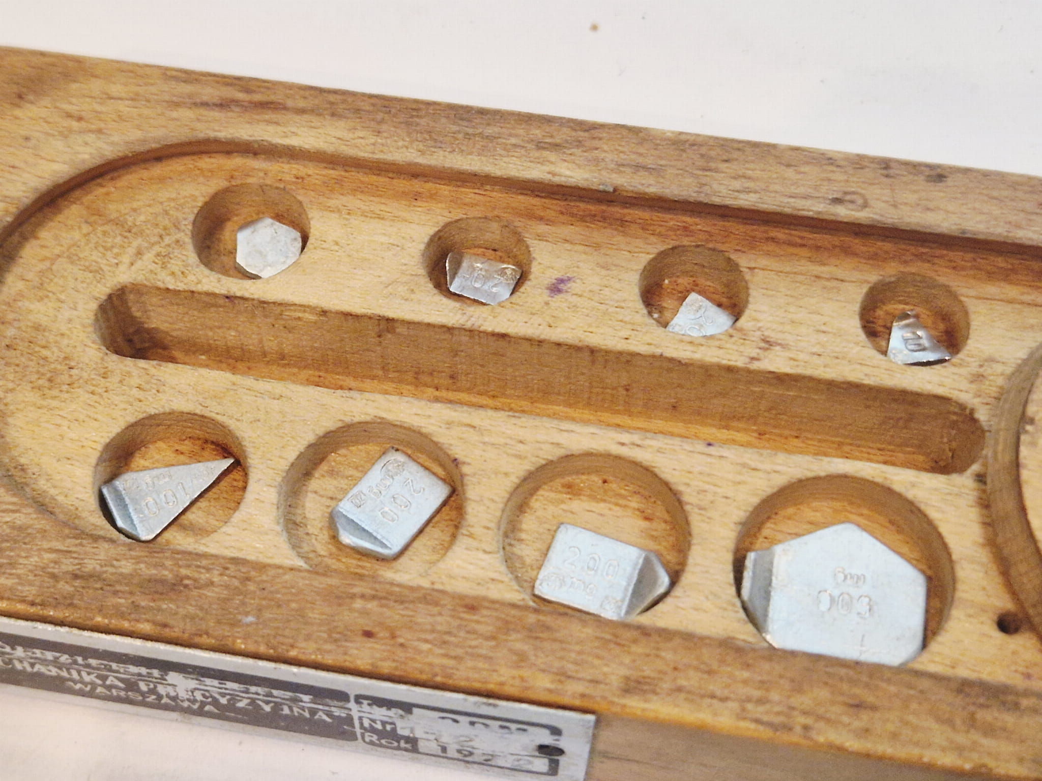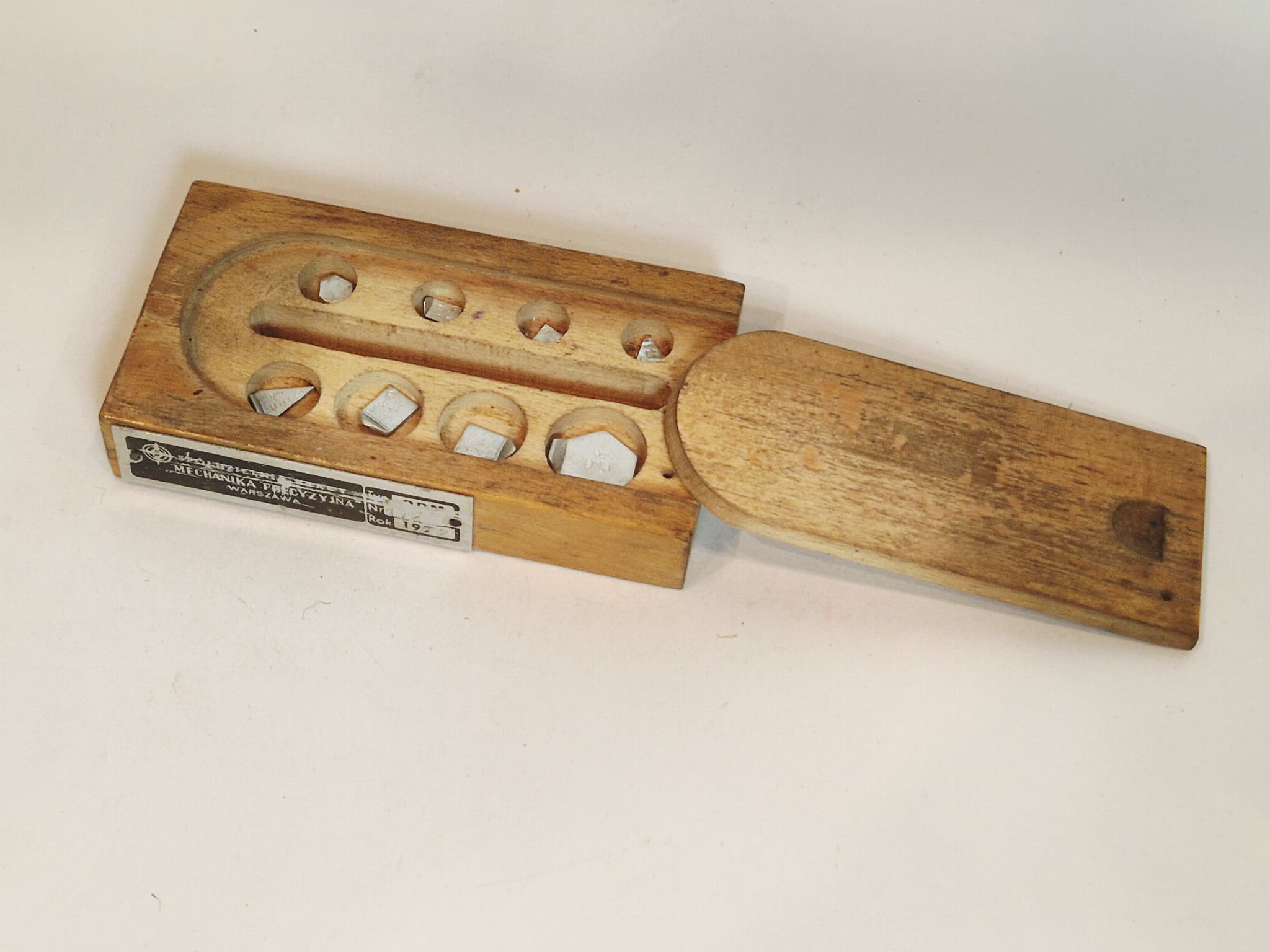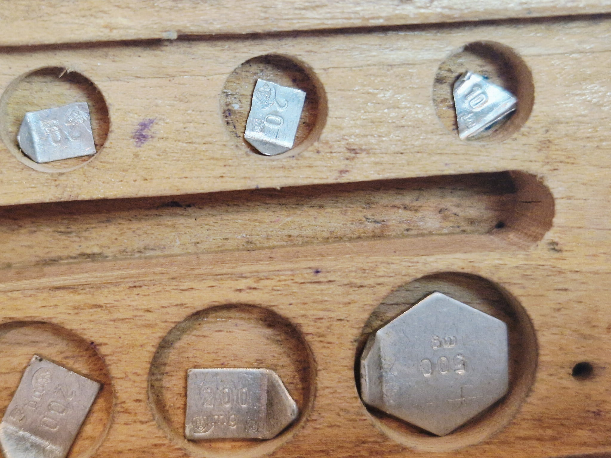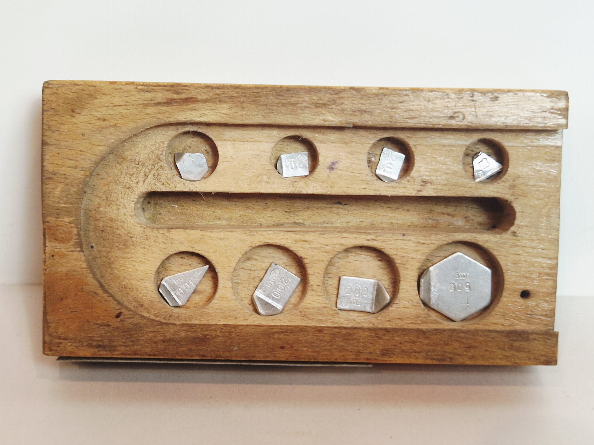 ZESTAW (mix) (8 szt. / 100 mg - 500 mg) STARYCH (l. 50 / 70-te XX w) PRECYZYJNYCH MILIGRAMOWYCH ODWAŻNIKÓW LABORATORYJNYCH W DREWNIANYM ETUI