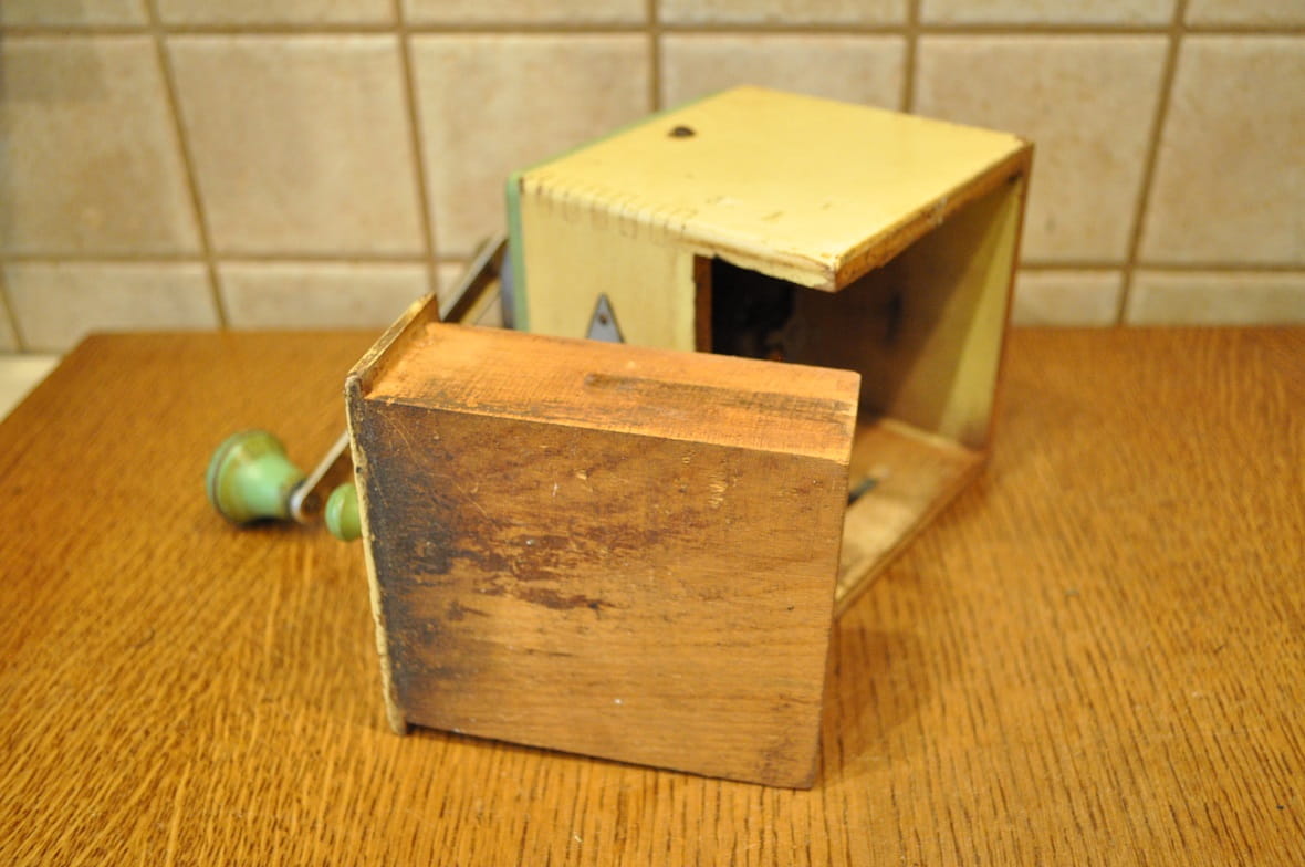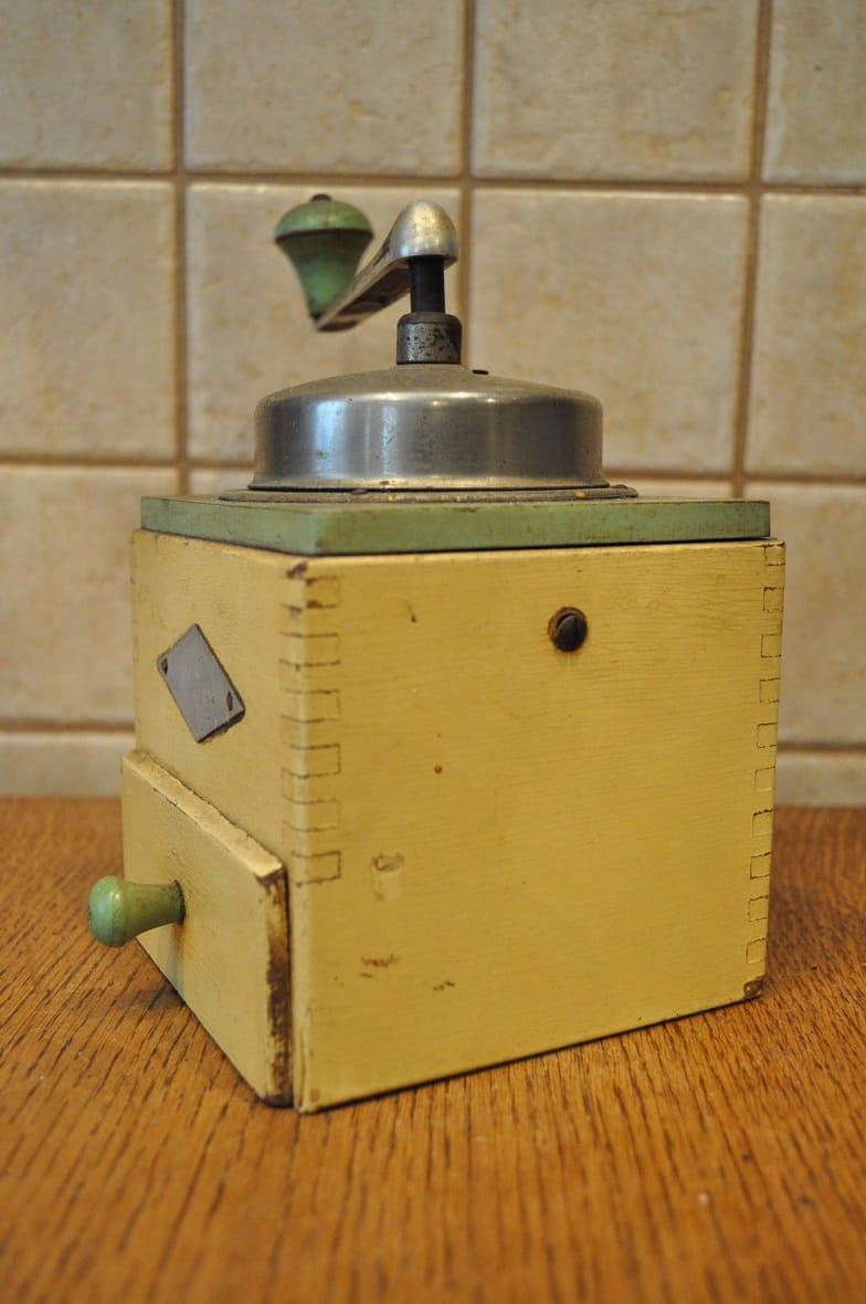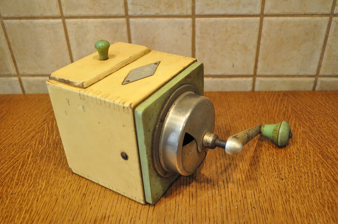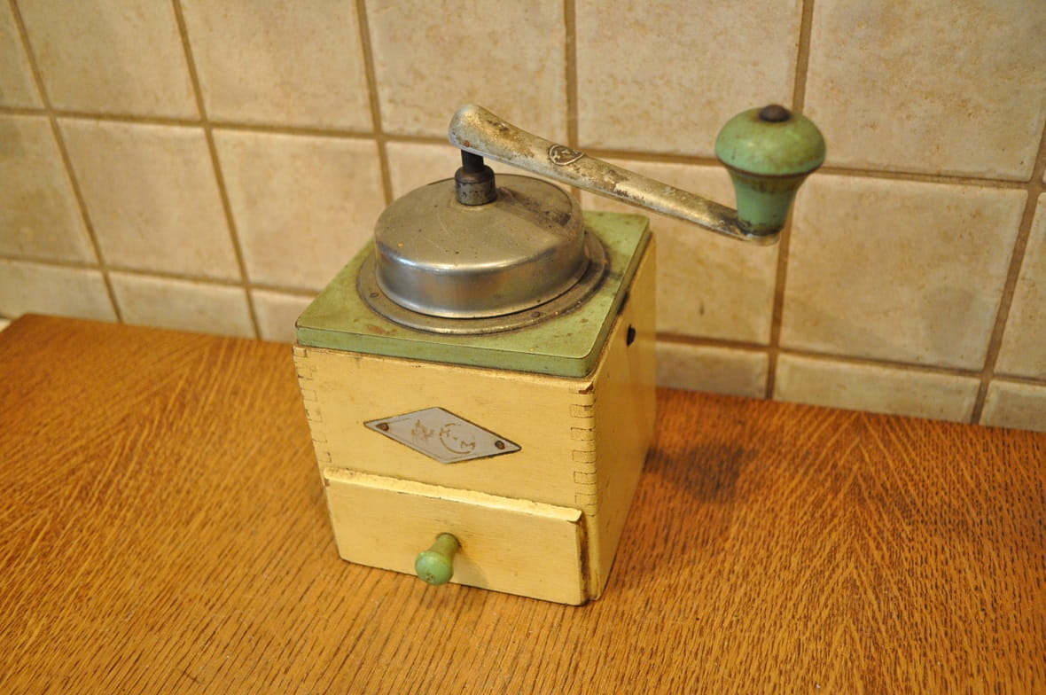 ZABYTKOWY (l. 20 / 30-te XX w) SYGNOWANY DREWNIANY MŁYNEK DO KAWY
