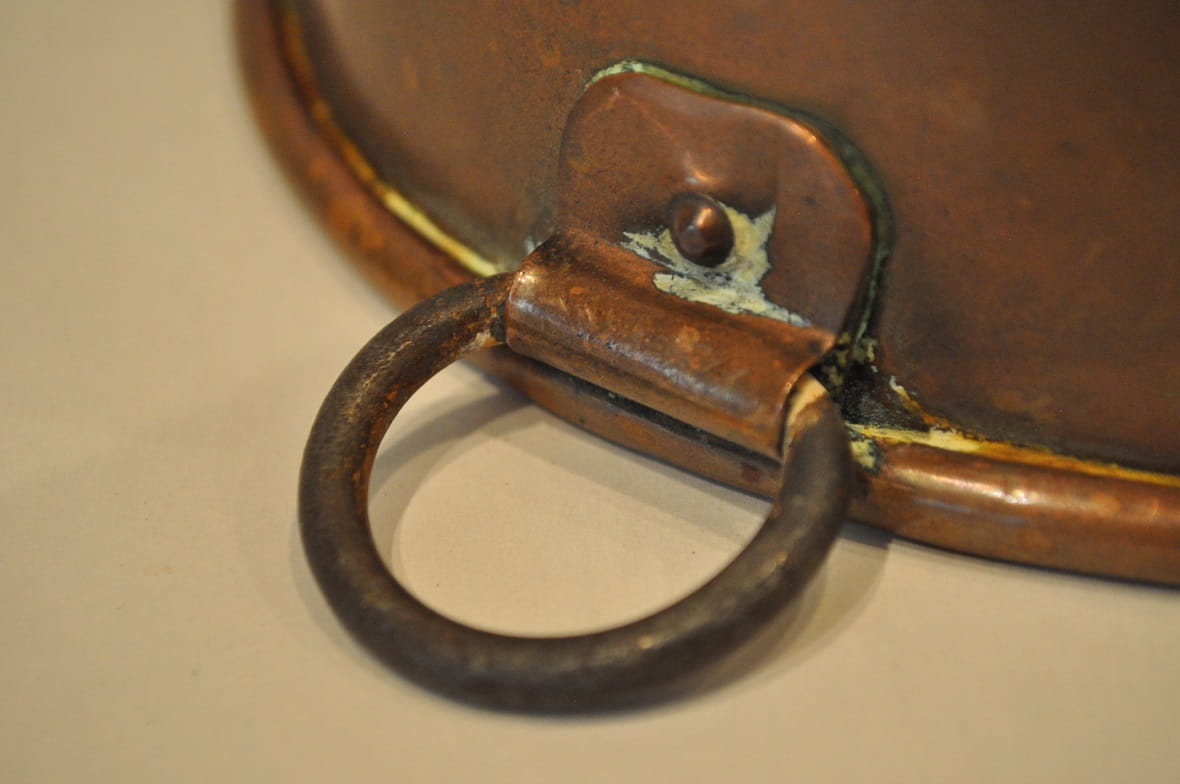 Żelazne kółko zawieszki w miedzianym, nitowanym okuciu - bez jakichkolwiek uszkodzeń oraz śladów napraw...