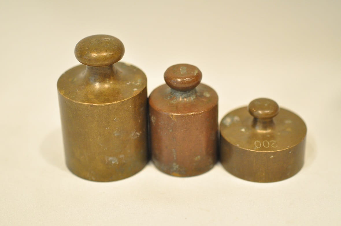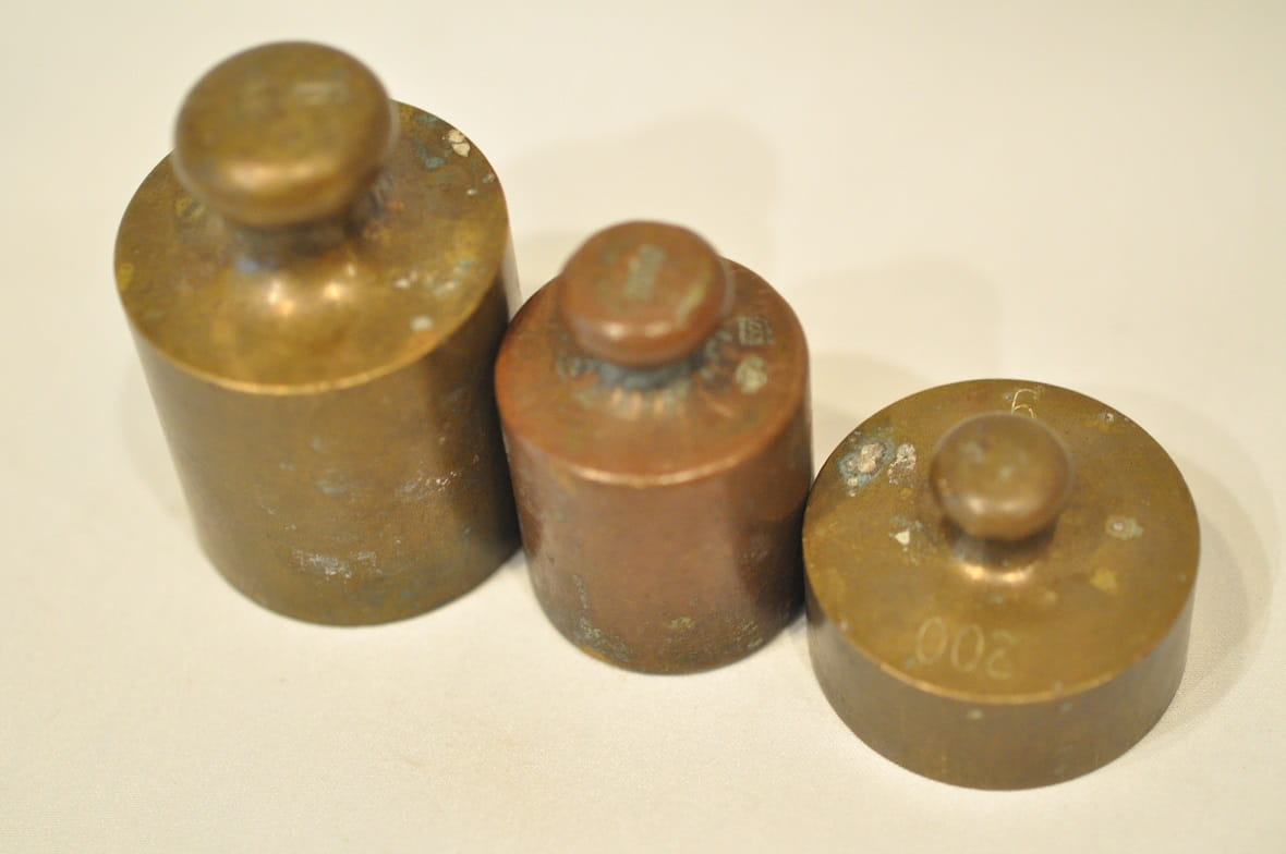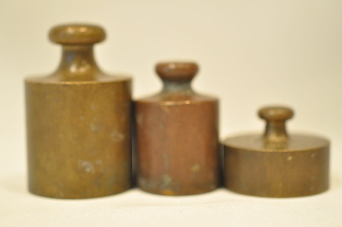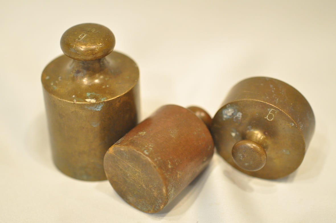 Odważniki nie były czyszczone - pokryte są oryginalną starą patyną.