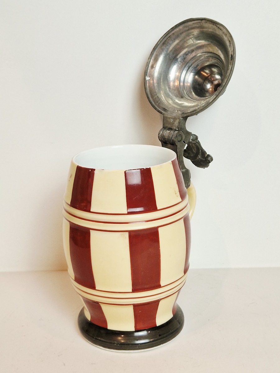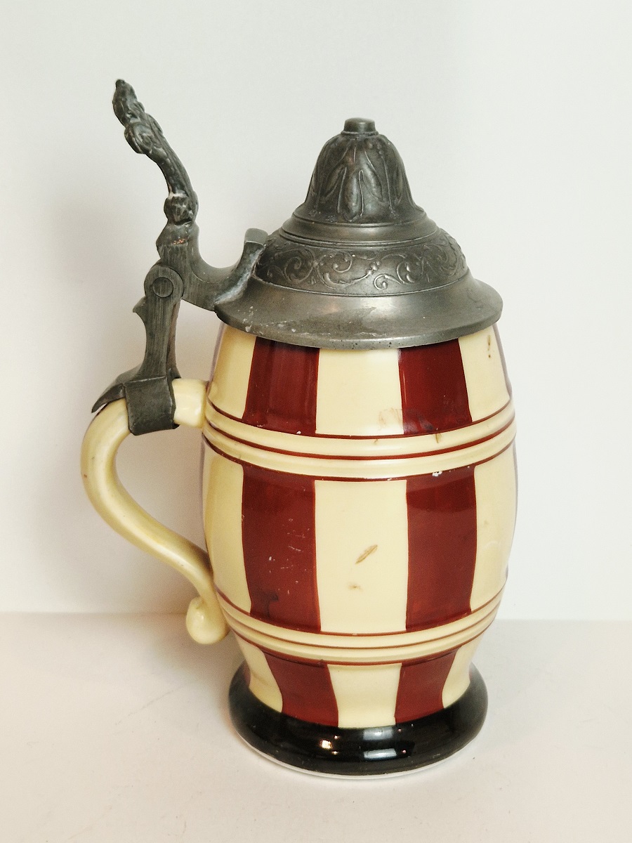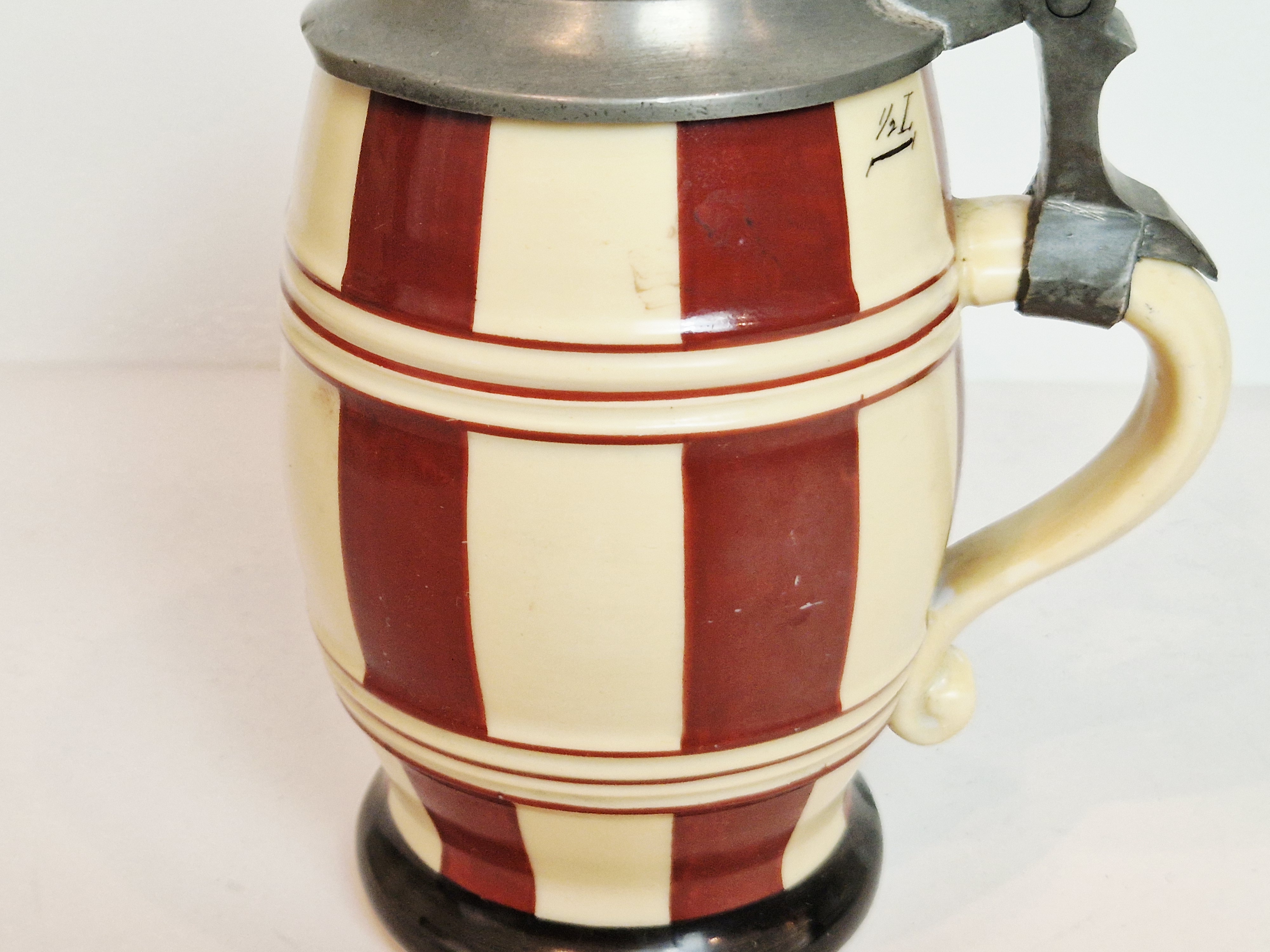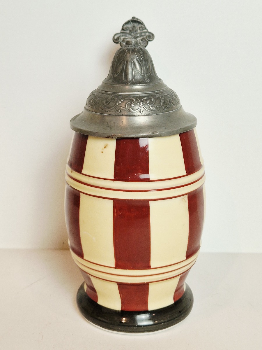 ZABYTKOWY (l. 20 / 30-te XX w) KUFEL CERAMICZNY Z DEKORACJĄ "PRZEŚWIYTUJĄCĄ" W DNIE KUFEL Z CYNOWĄ POKRYWKĄ