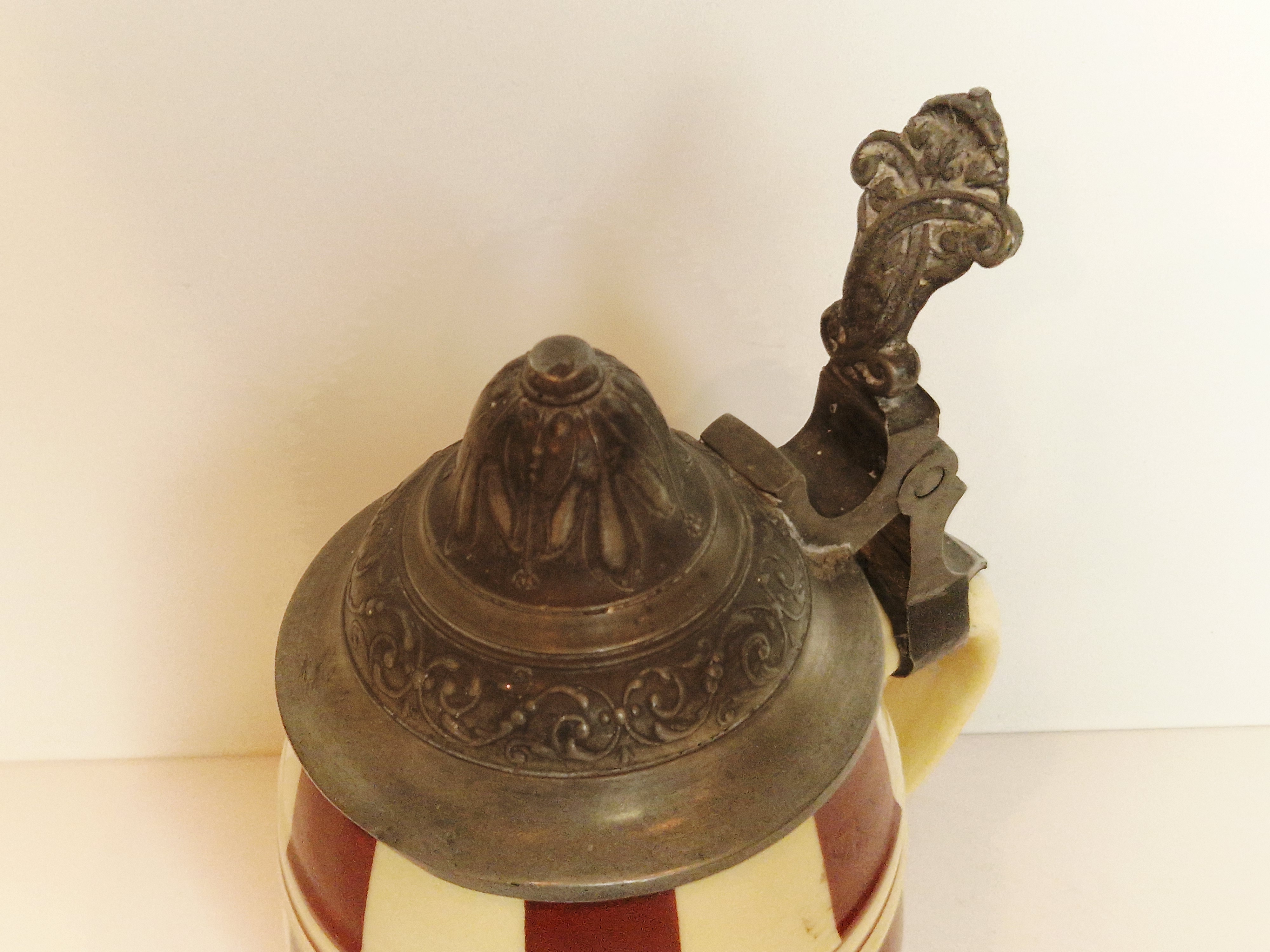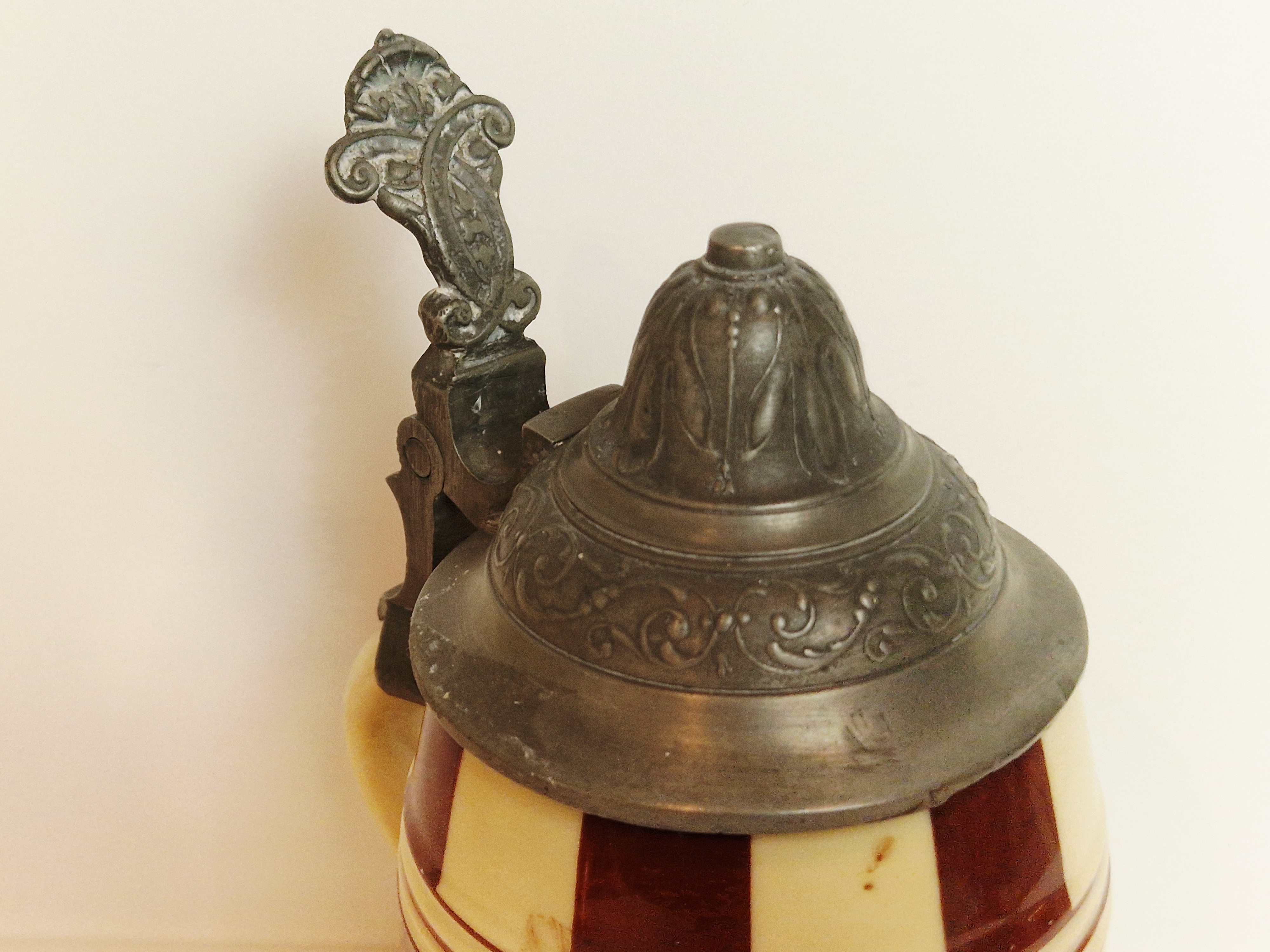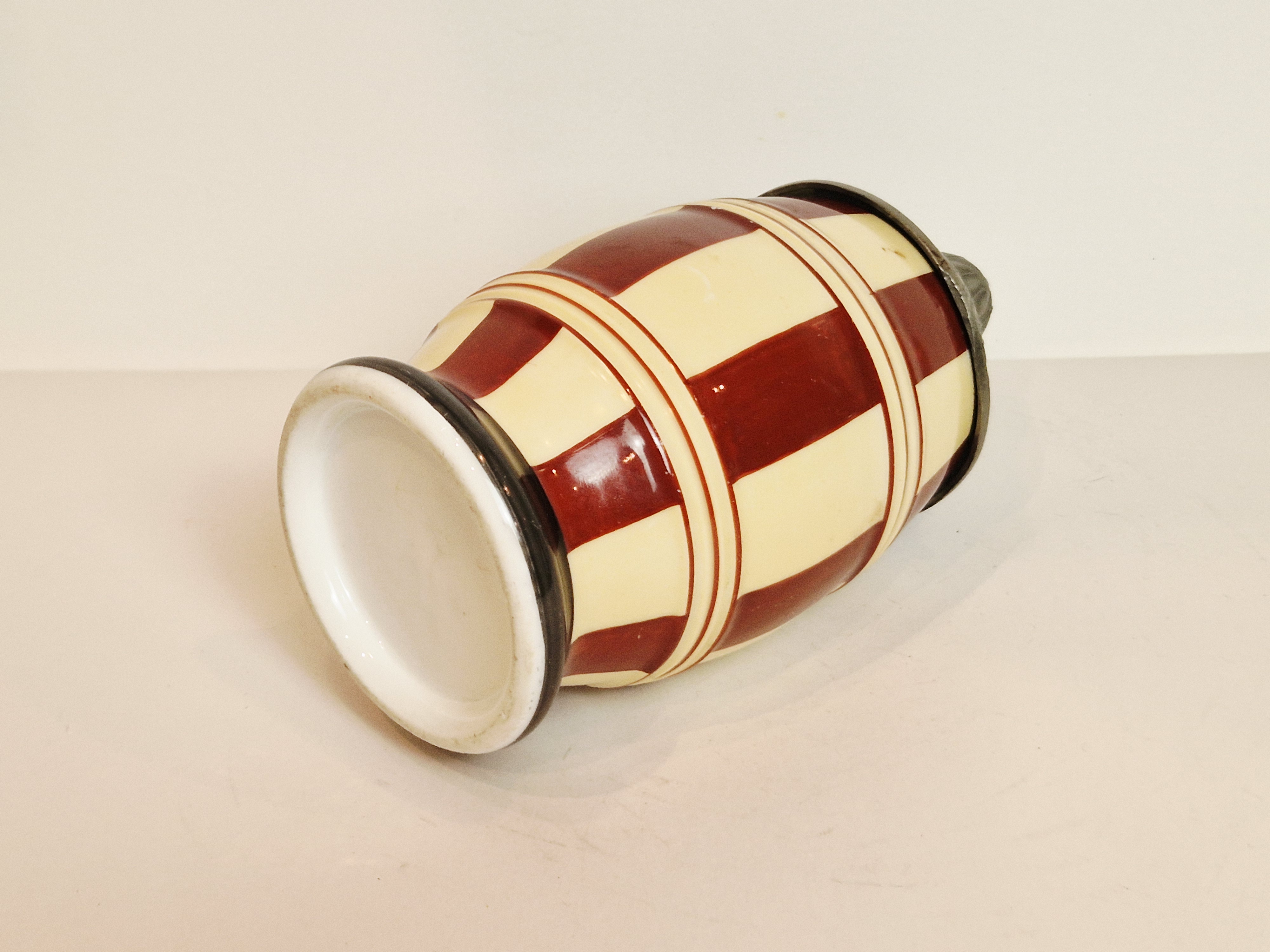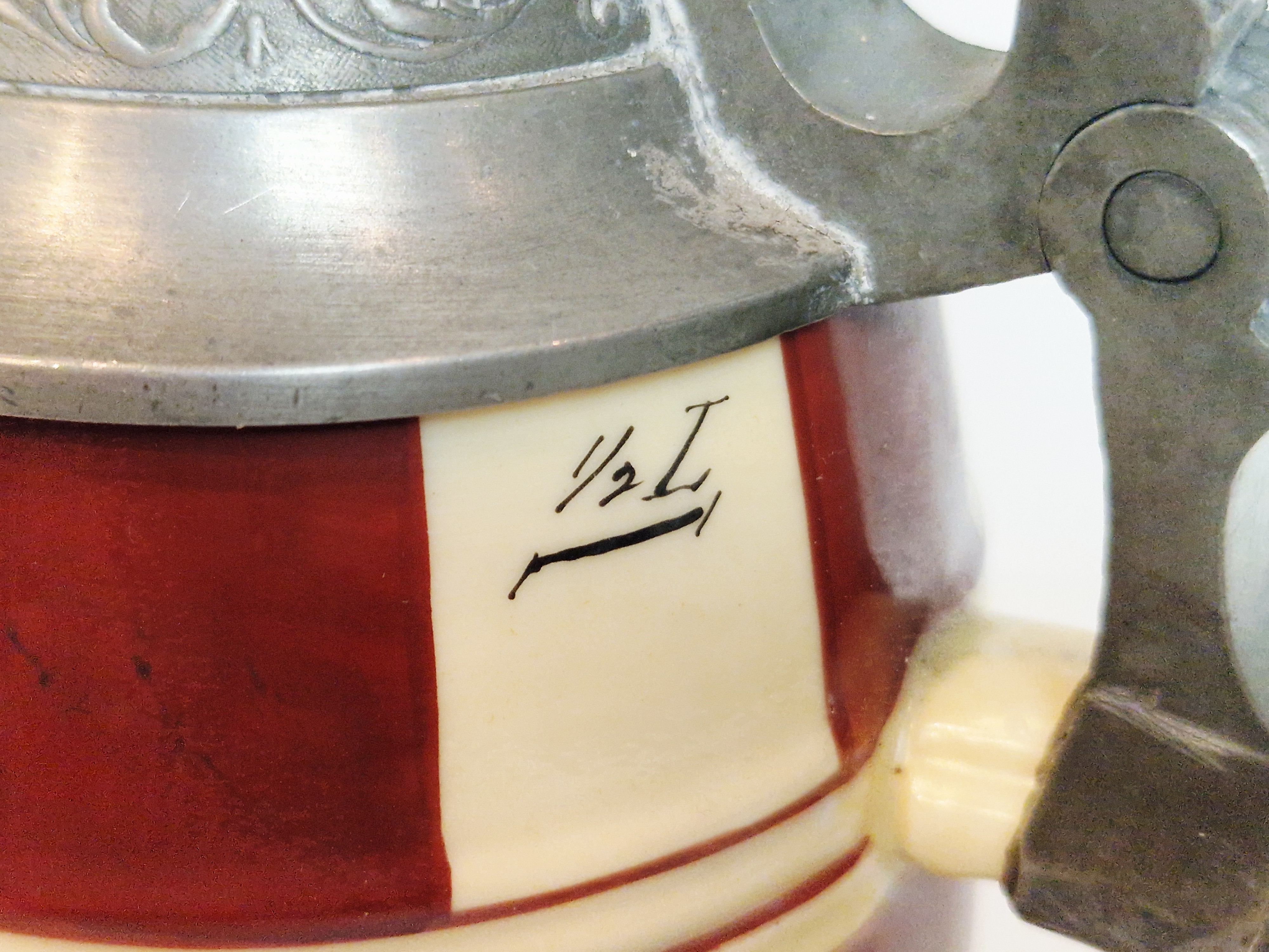 ZABYTKOWY (l. 20 / 30-te XX w) KUFEL CERAMICZNY Z DEKORACJĄ "PRZEŚWIYTUJĄCĄ" W DNIE KUFEL Z CYNOWĄ POKRYWKĄ
