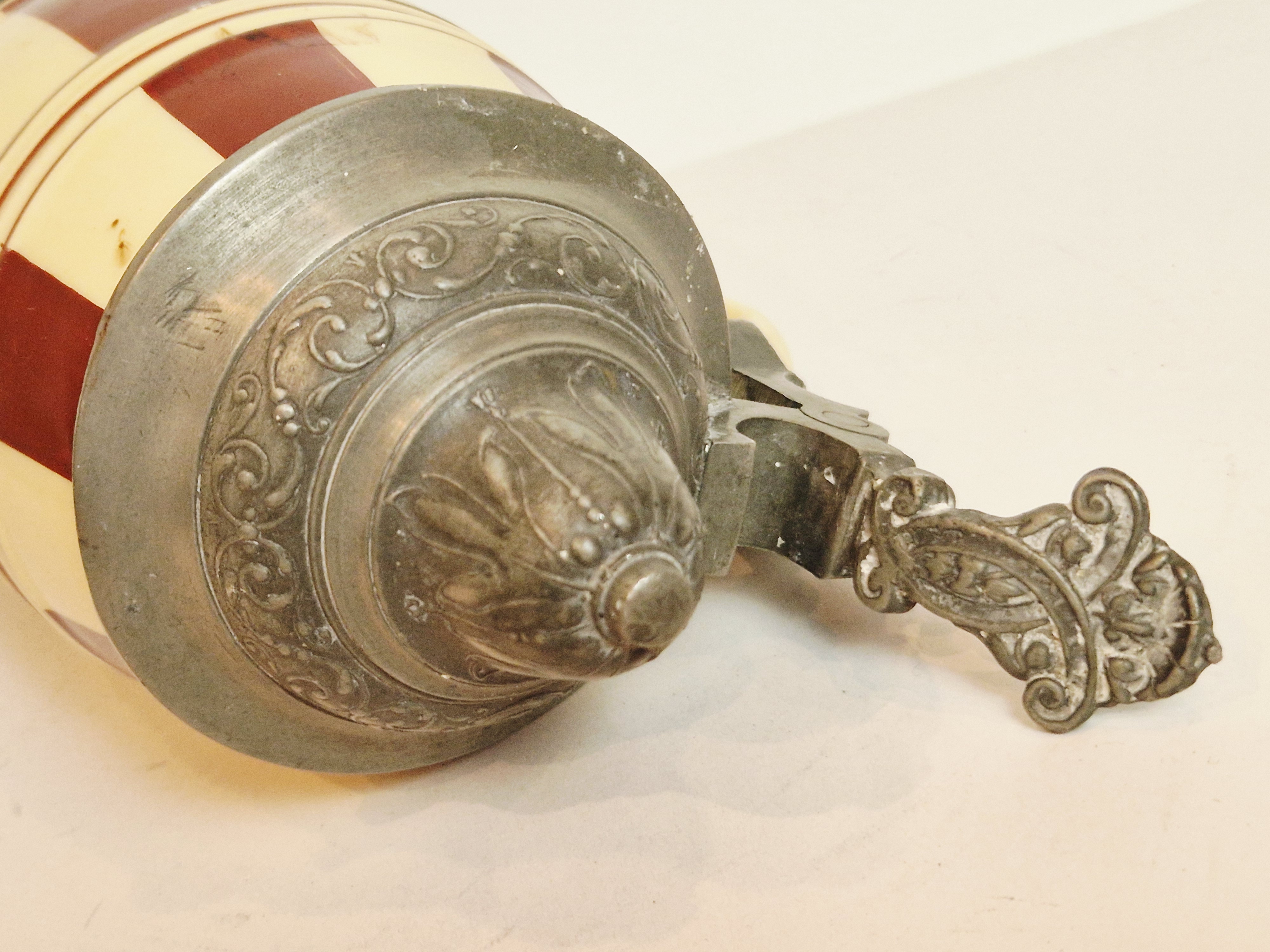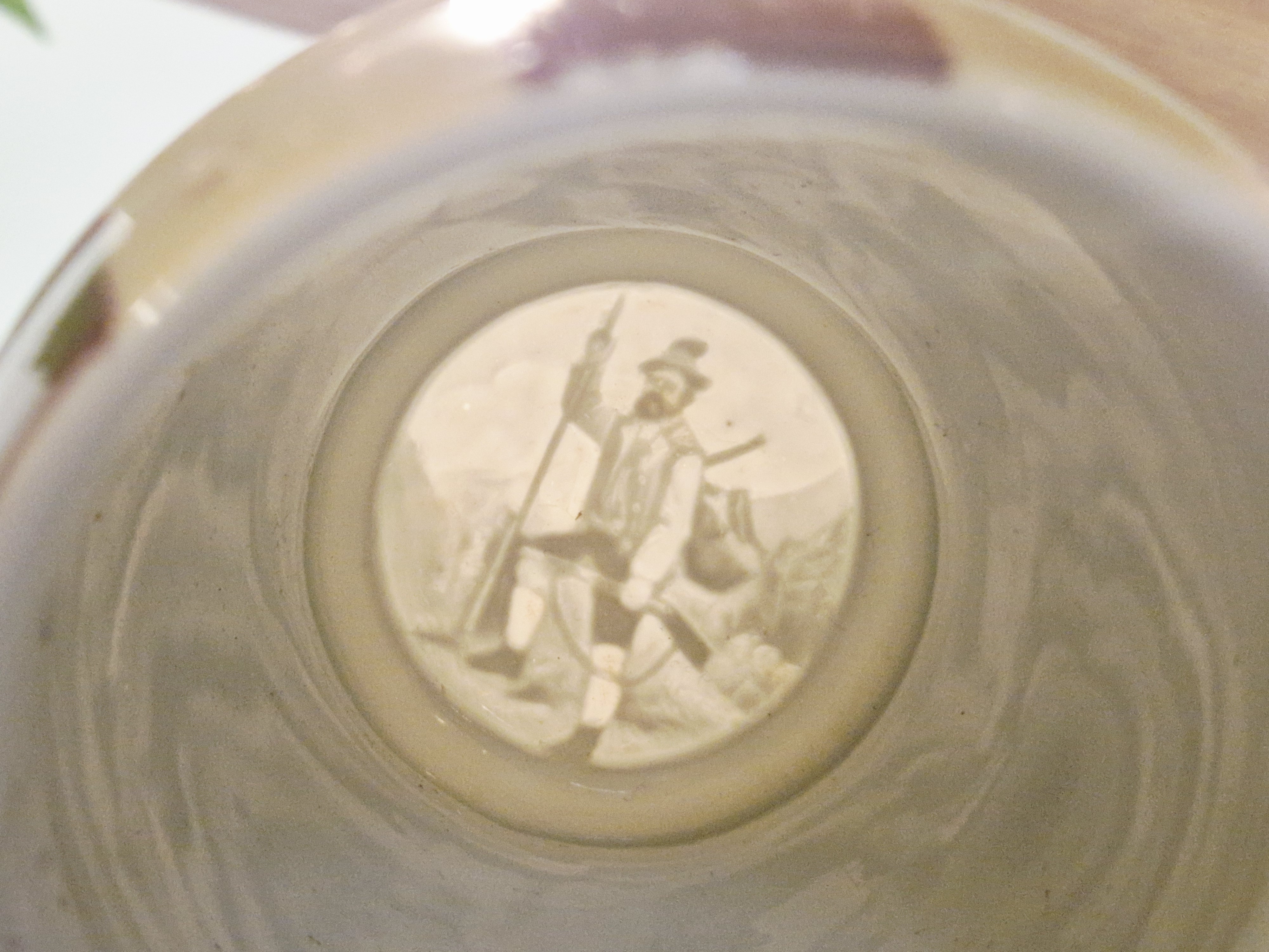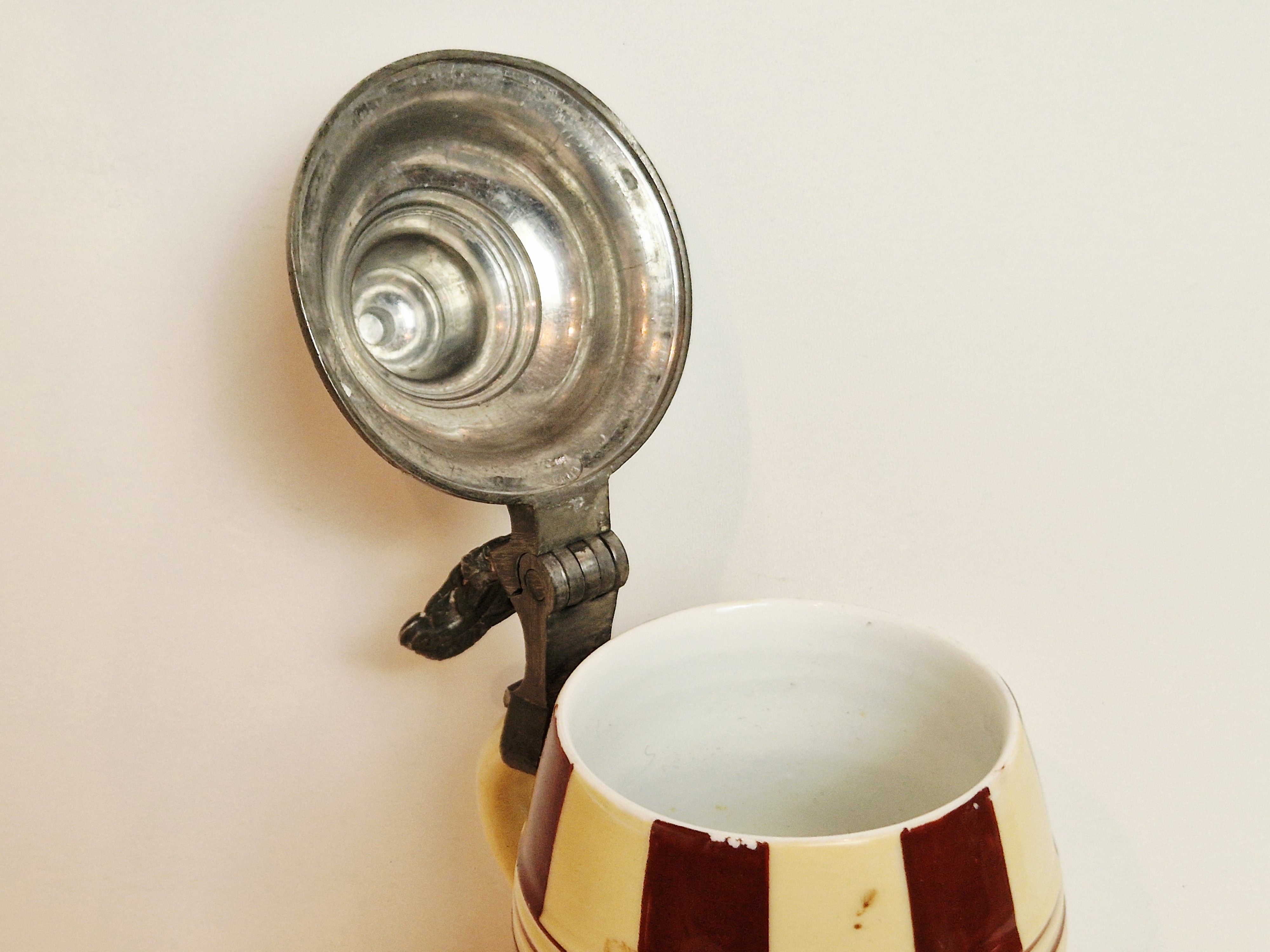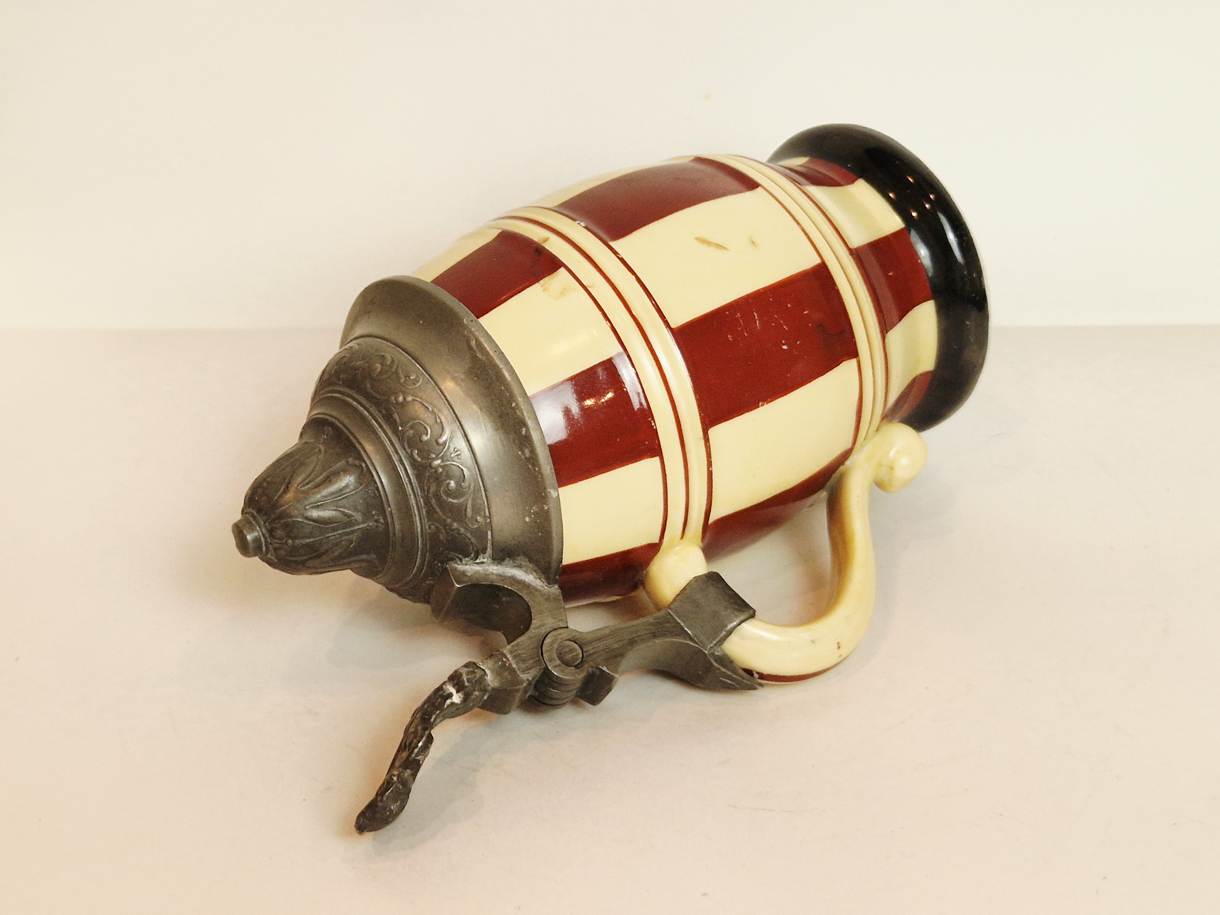 ZABYTKOWY (l. 20 / 30-te XX w) KUFEL CERAMICZNY Z DEKORACJĄ "PRZEŚWIYTUJĄCĄ" W DNIE KUFEL Z CYNOWĄ POKRYWKĄ