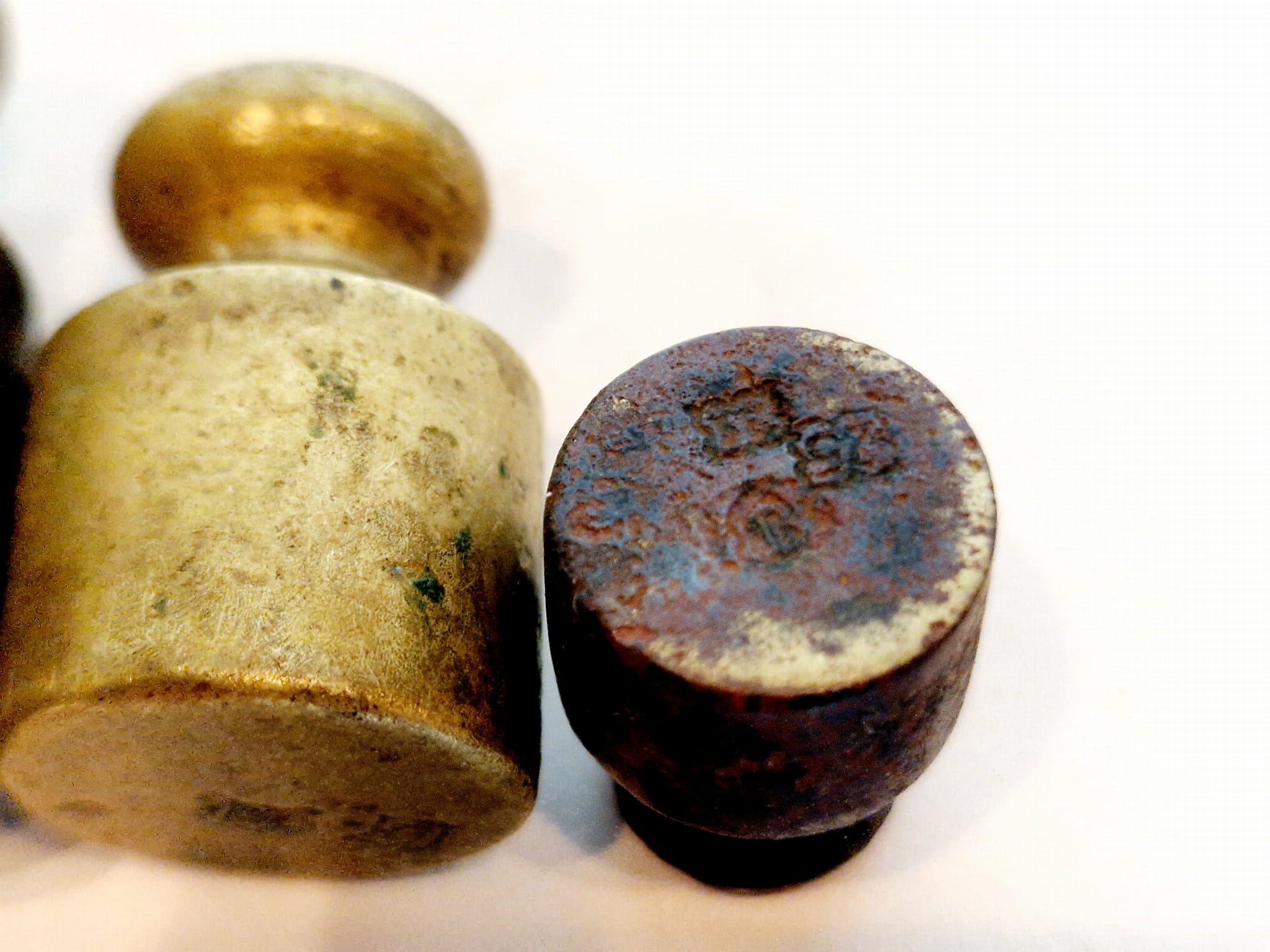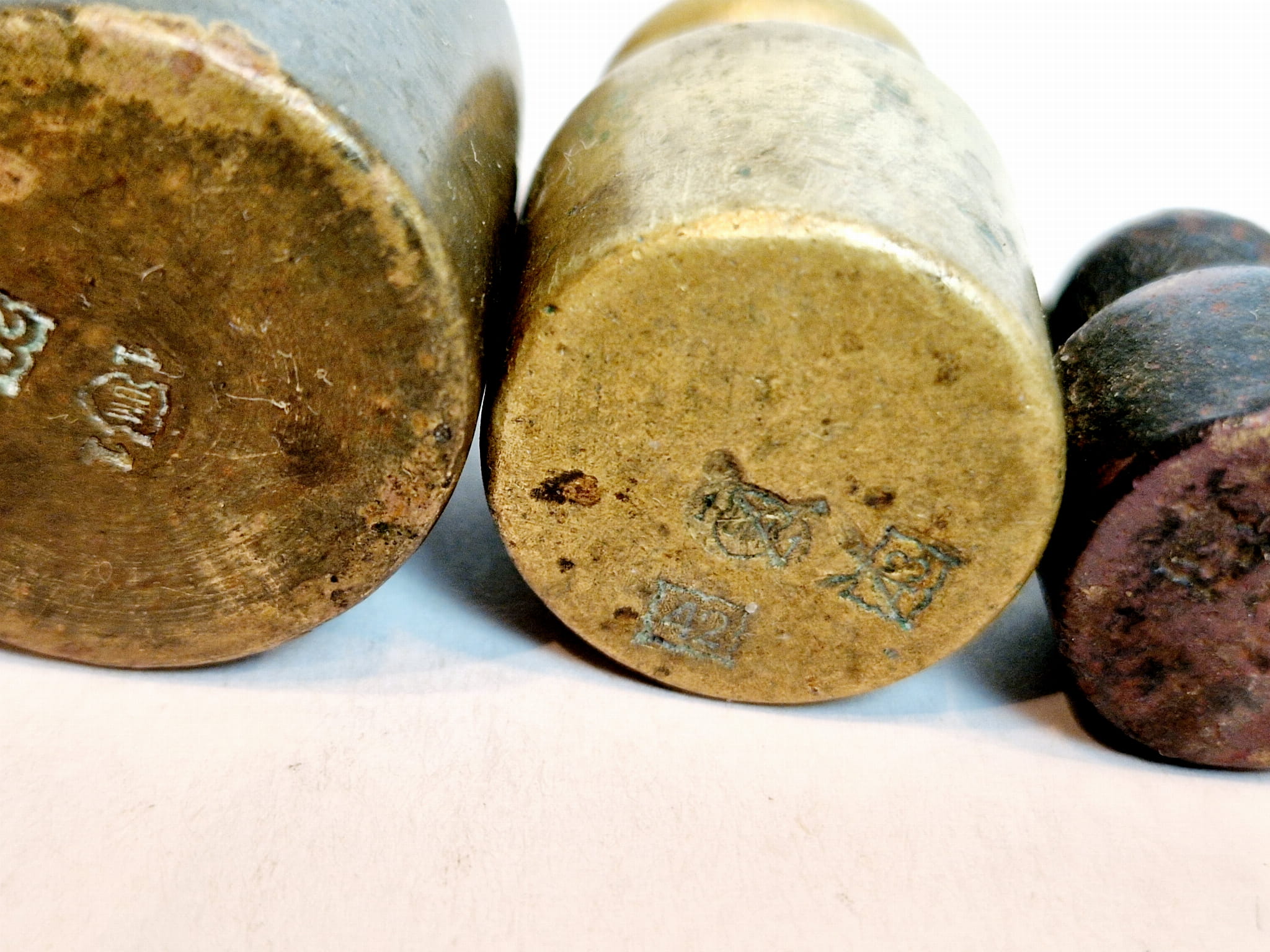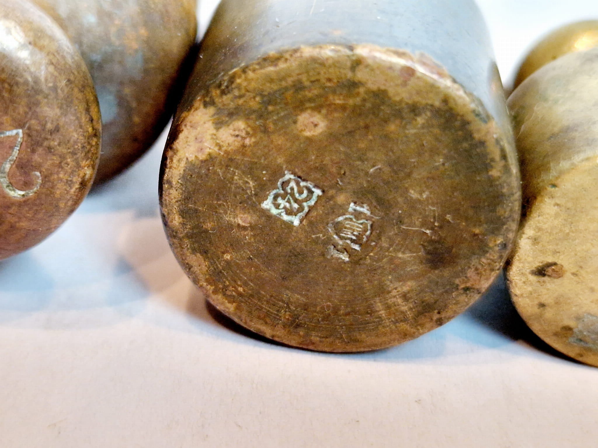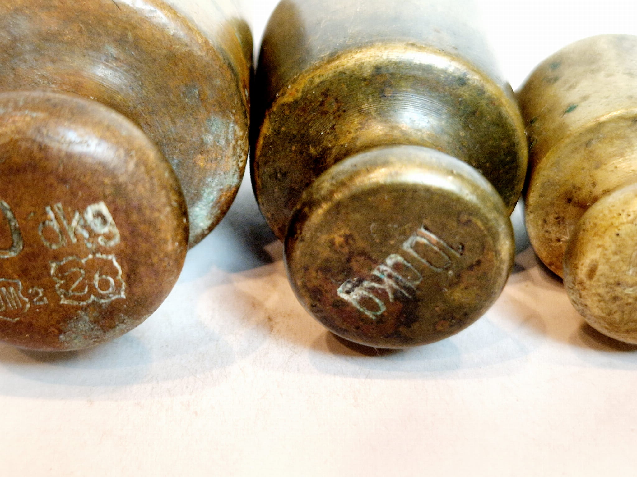 Odważniki nie były czyszczone - pokryte są oryginalną, starą, ciemną patyną.