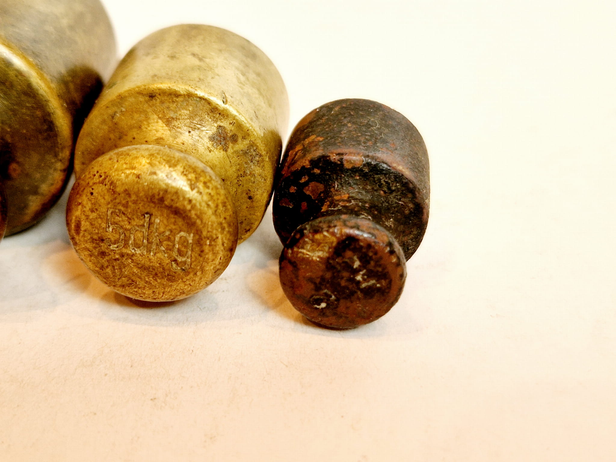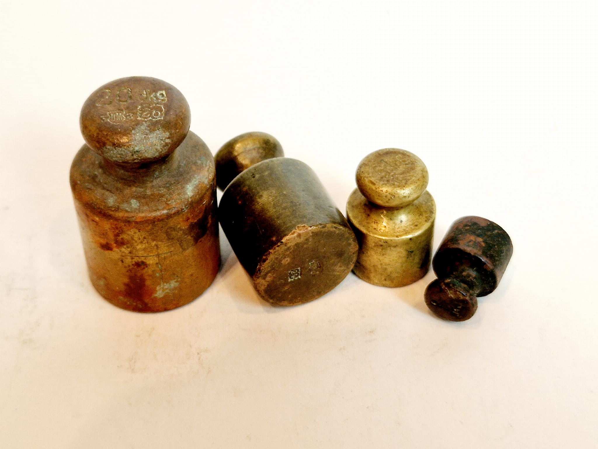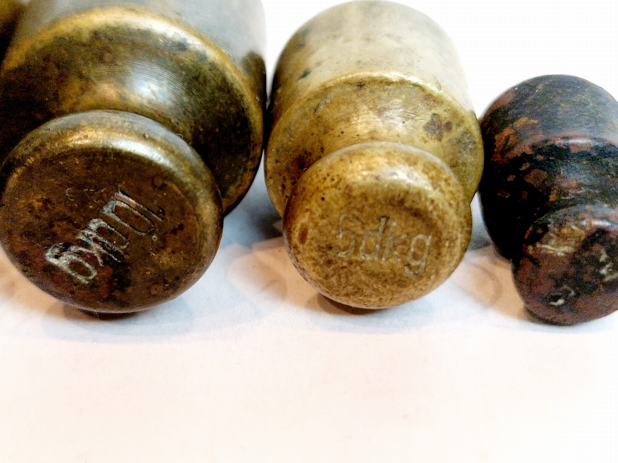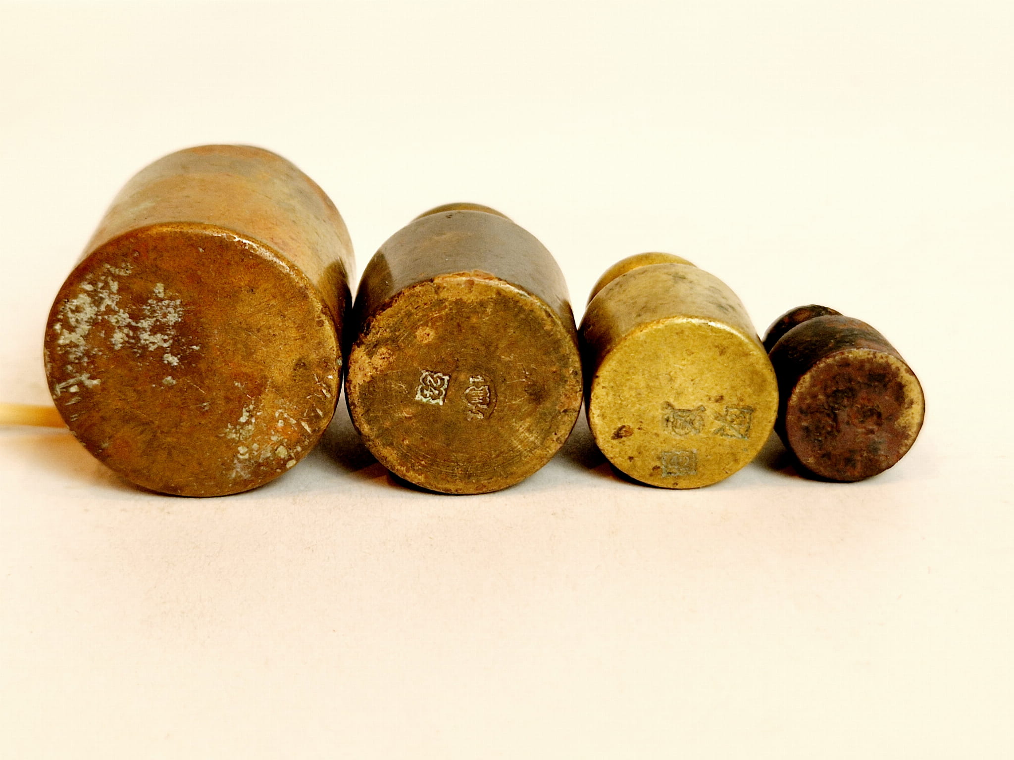 Odważniki nie były czyszczone - pokryte są oryginalną, starą, ciemną patyną.