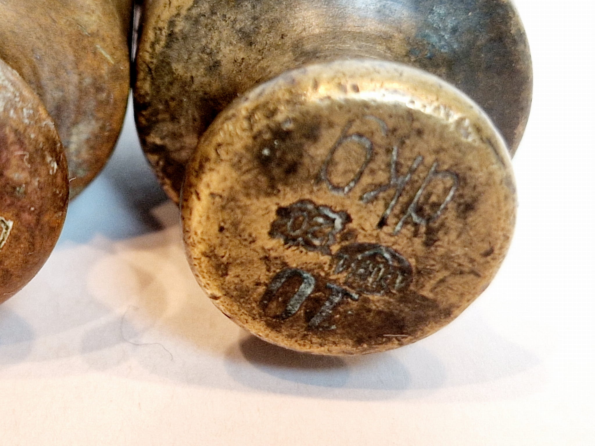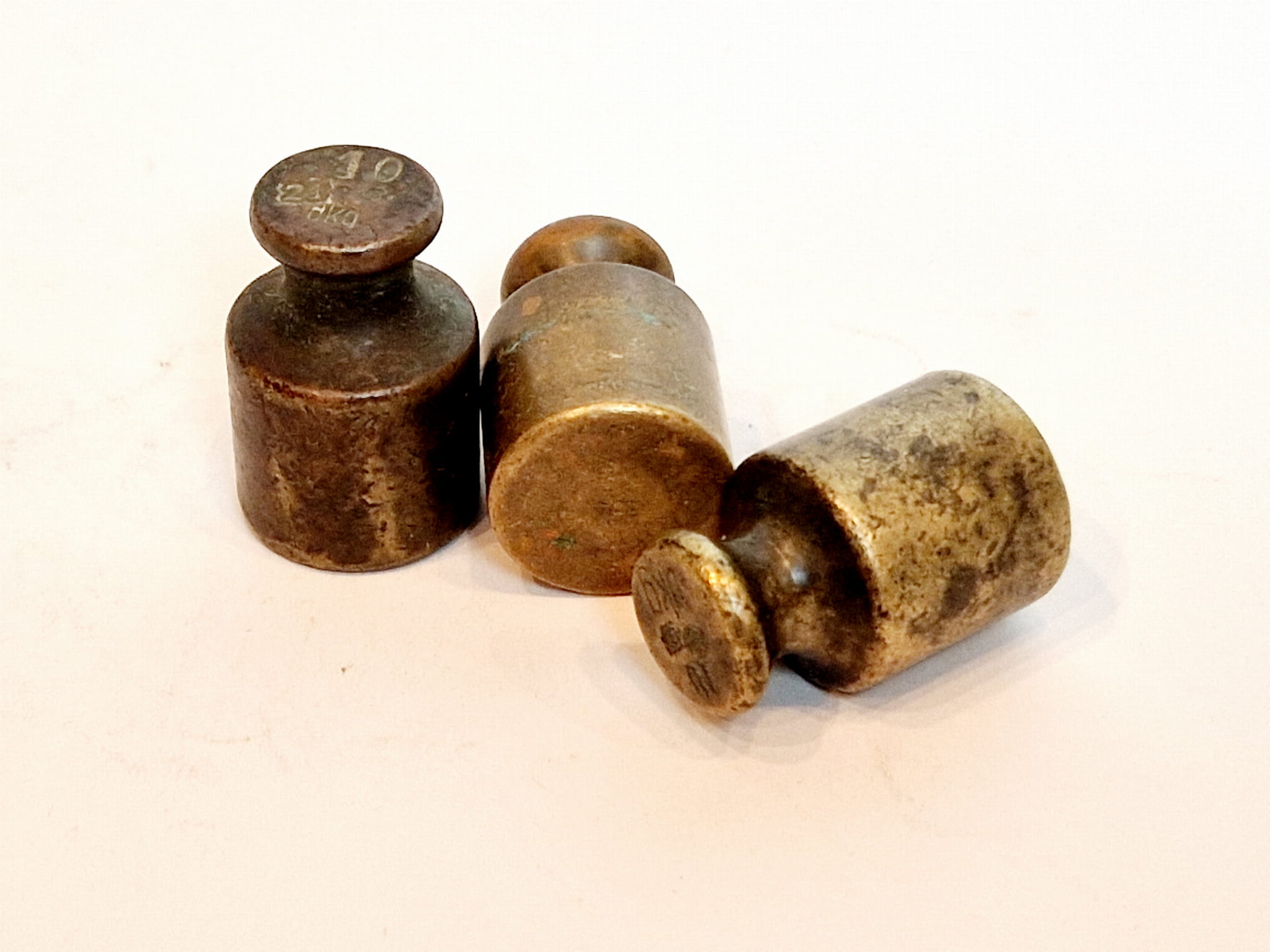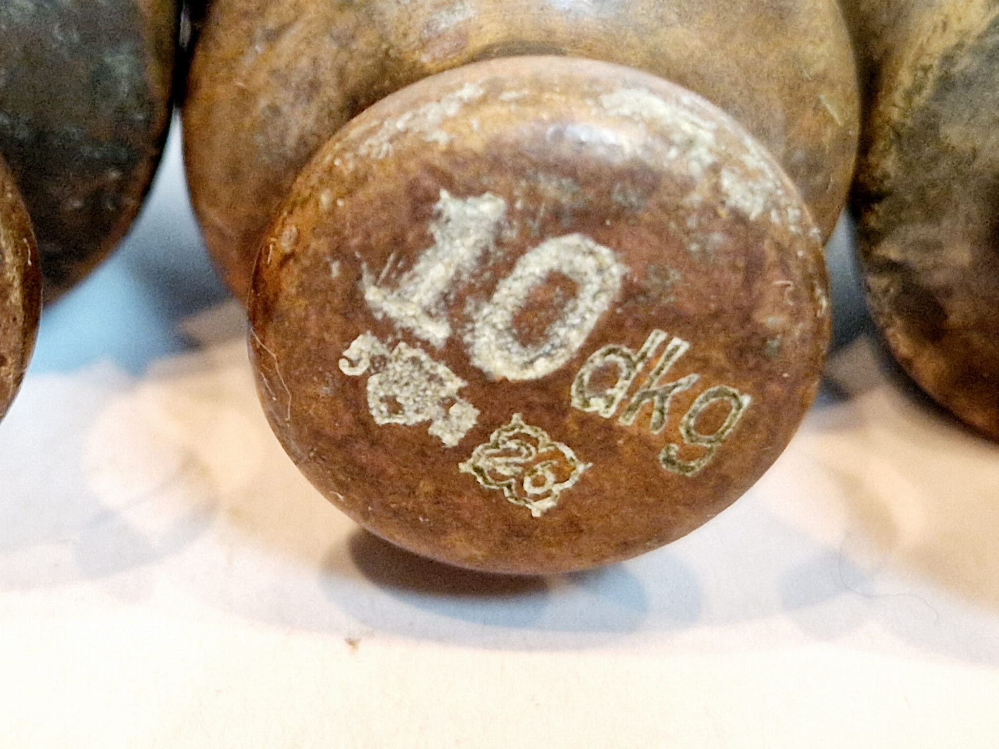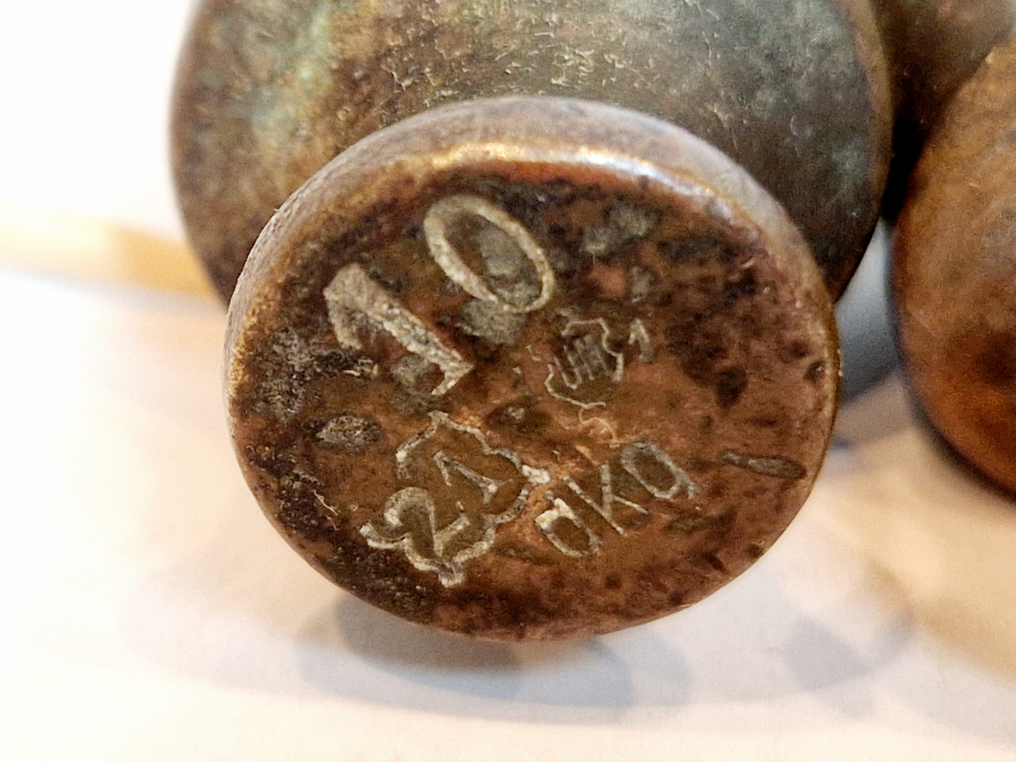 Odważniki nie były czyszczone - pokryte są oryginalną, starą, ciemną patyną.