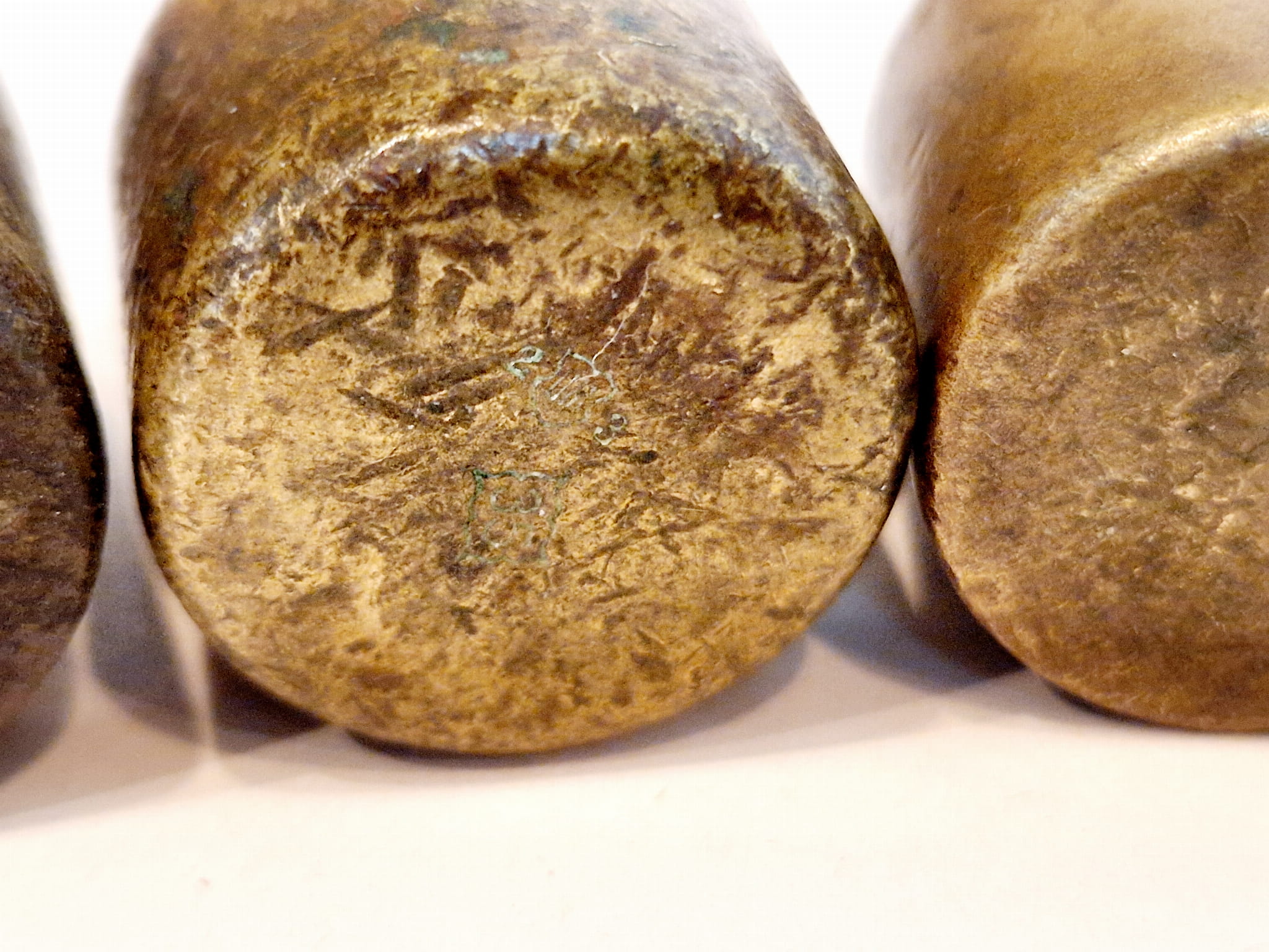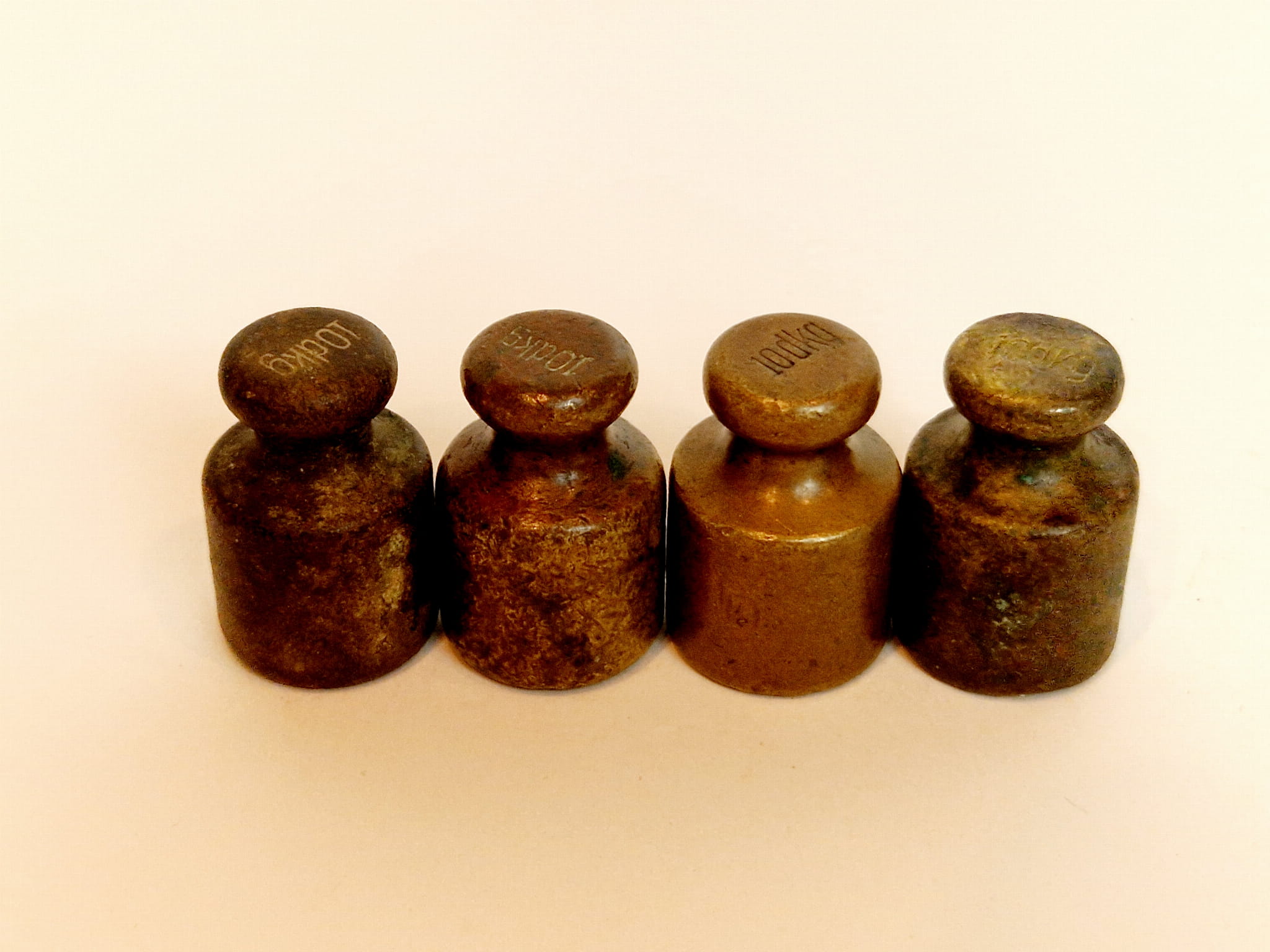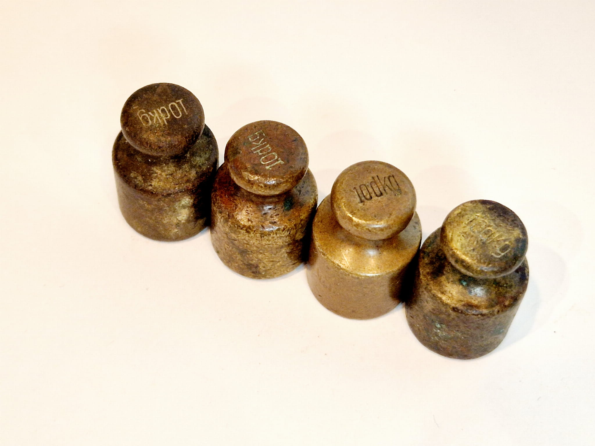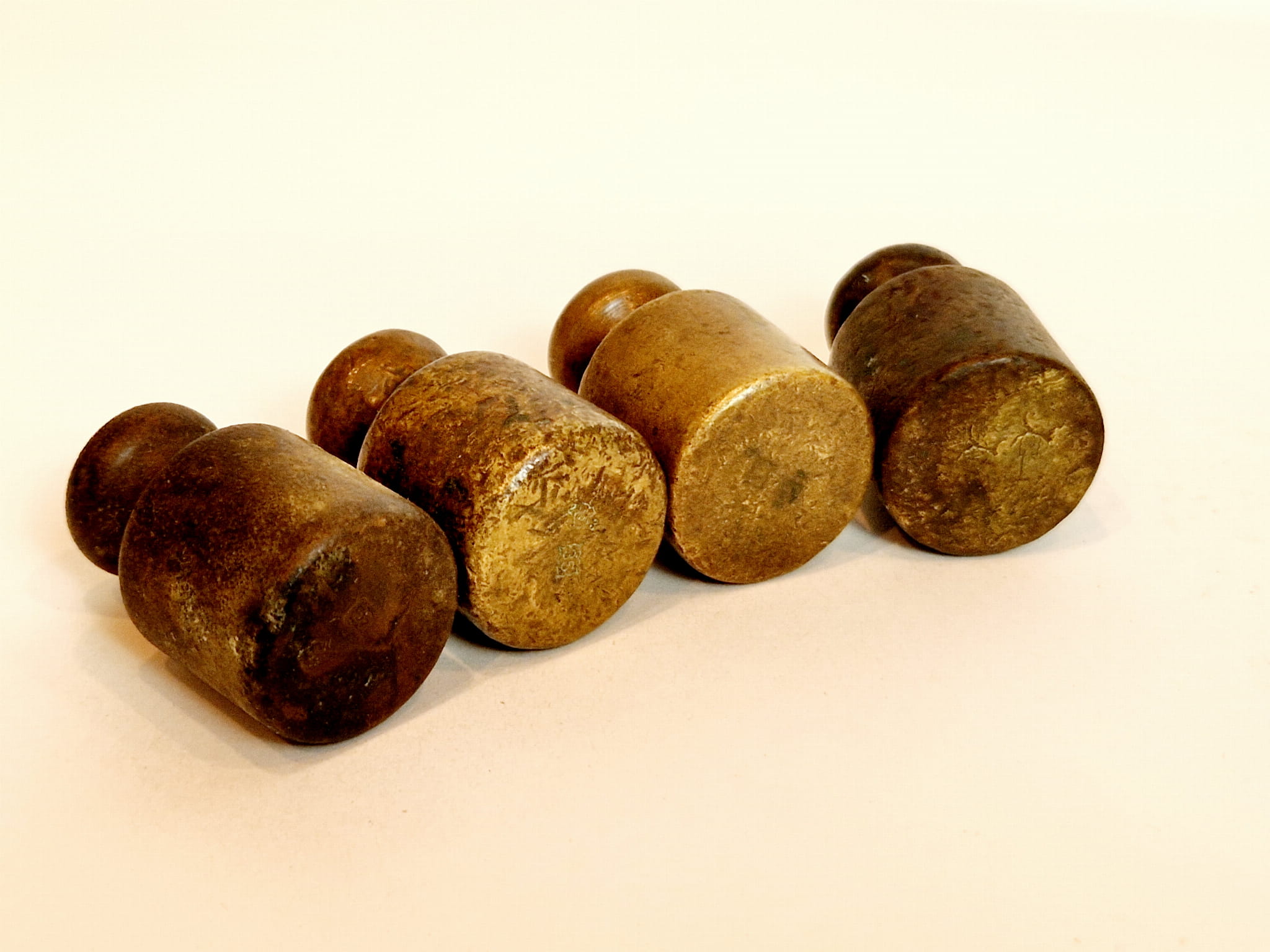 Odważniki nie były czyszczone - pokryte są oryginalną, starą, ciemną patyną.