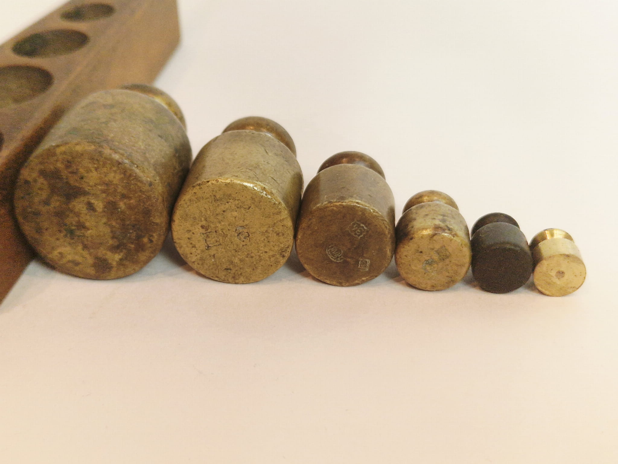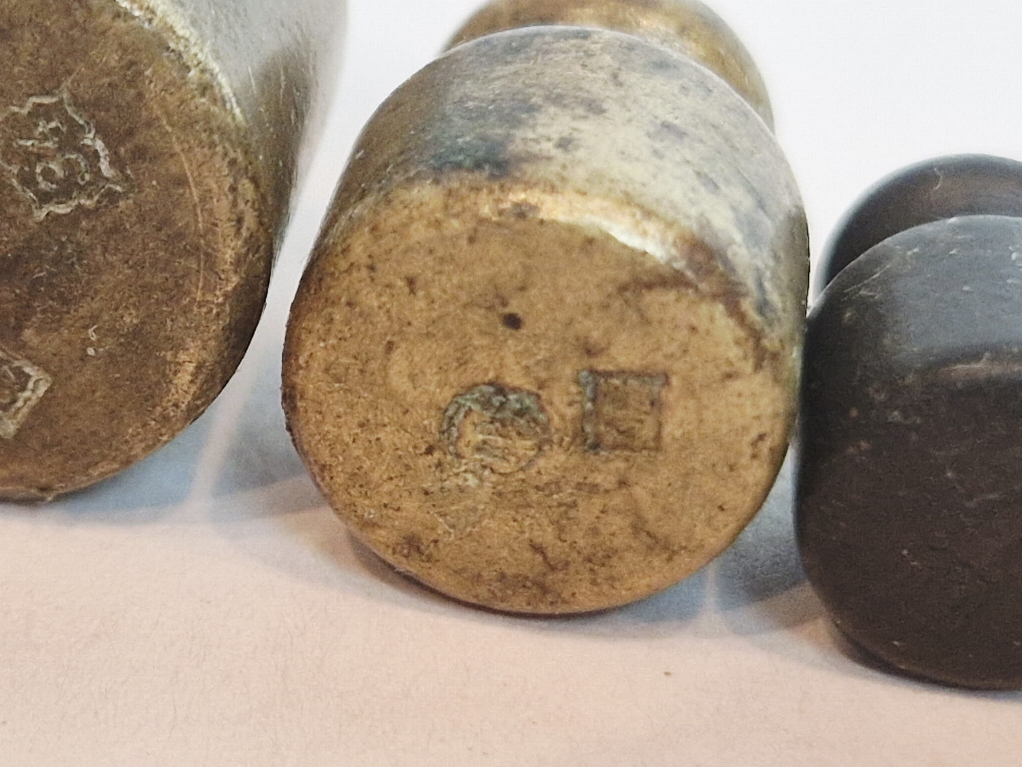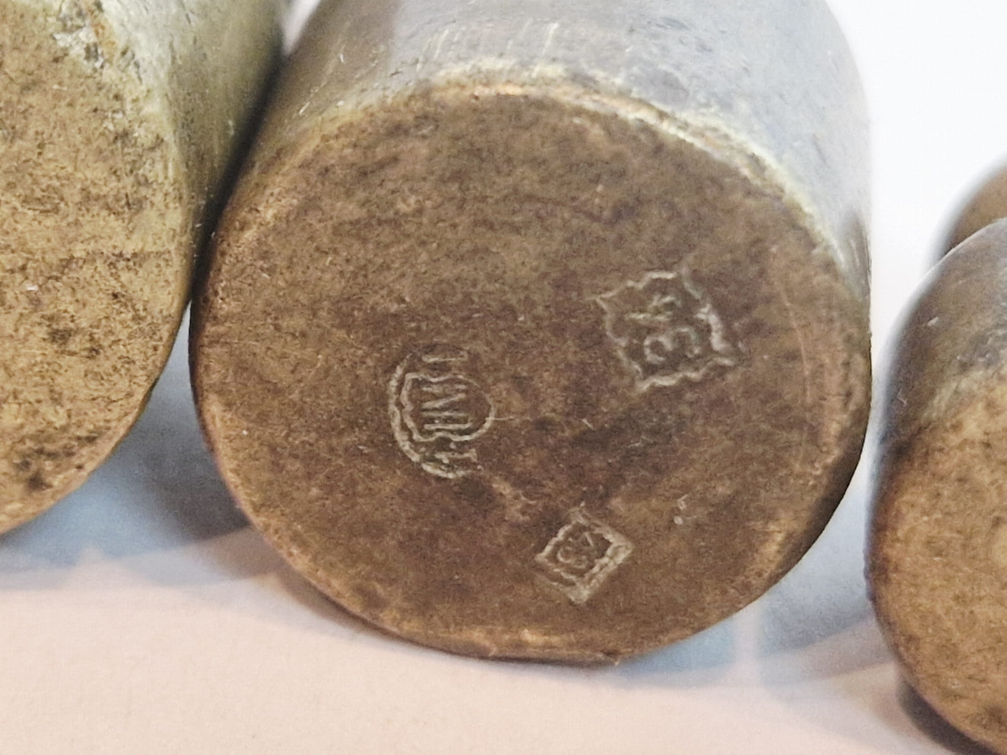 Odważniki nie były czyszczone - pokryte są oryginalną, starą, ciemną patyną.