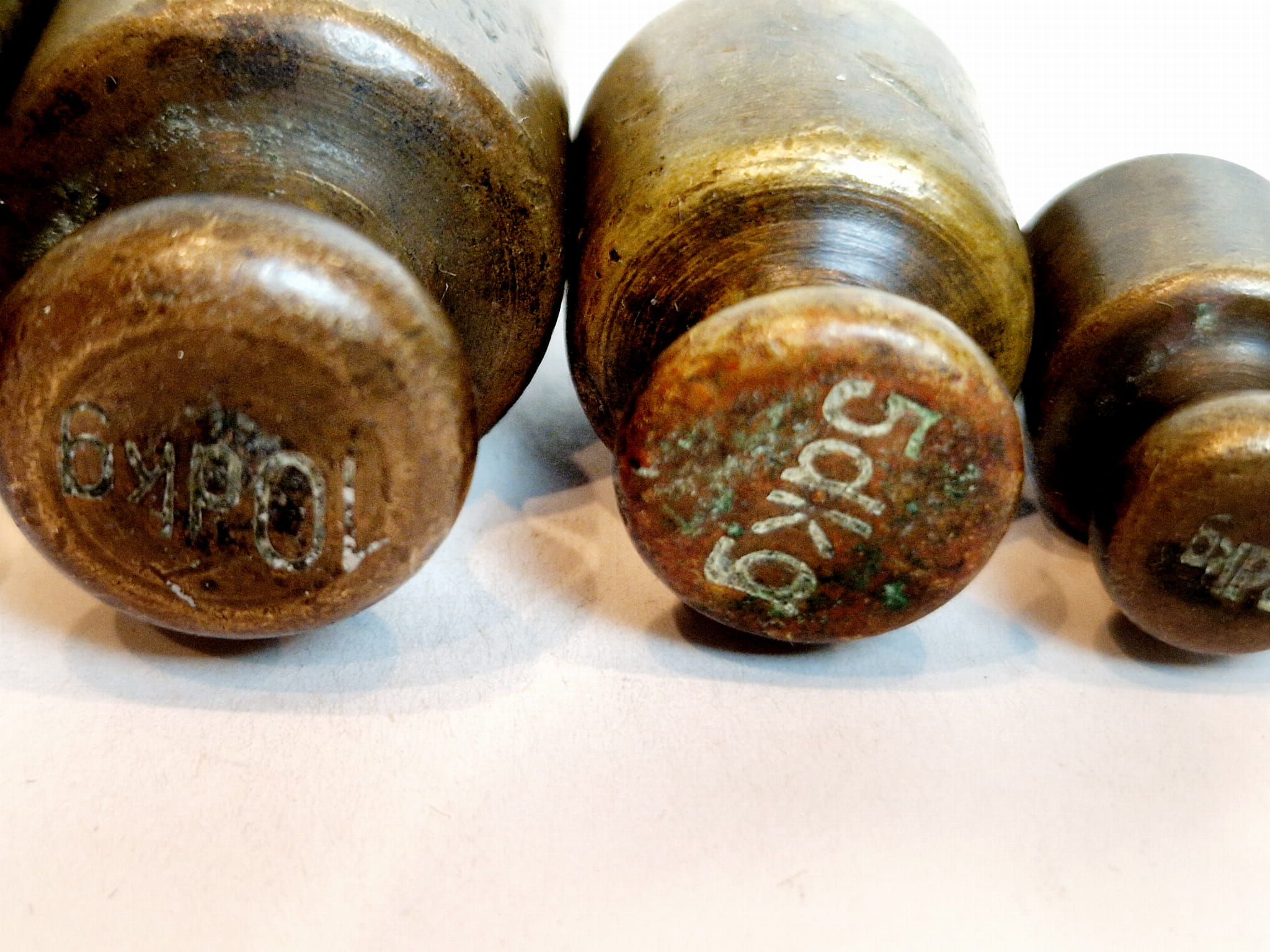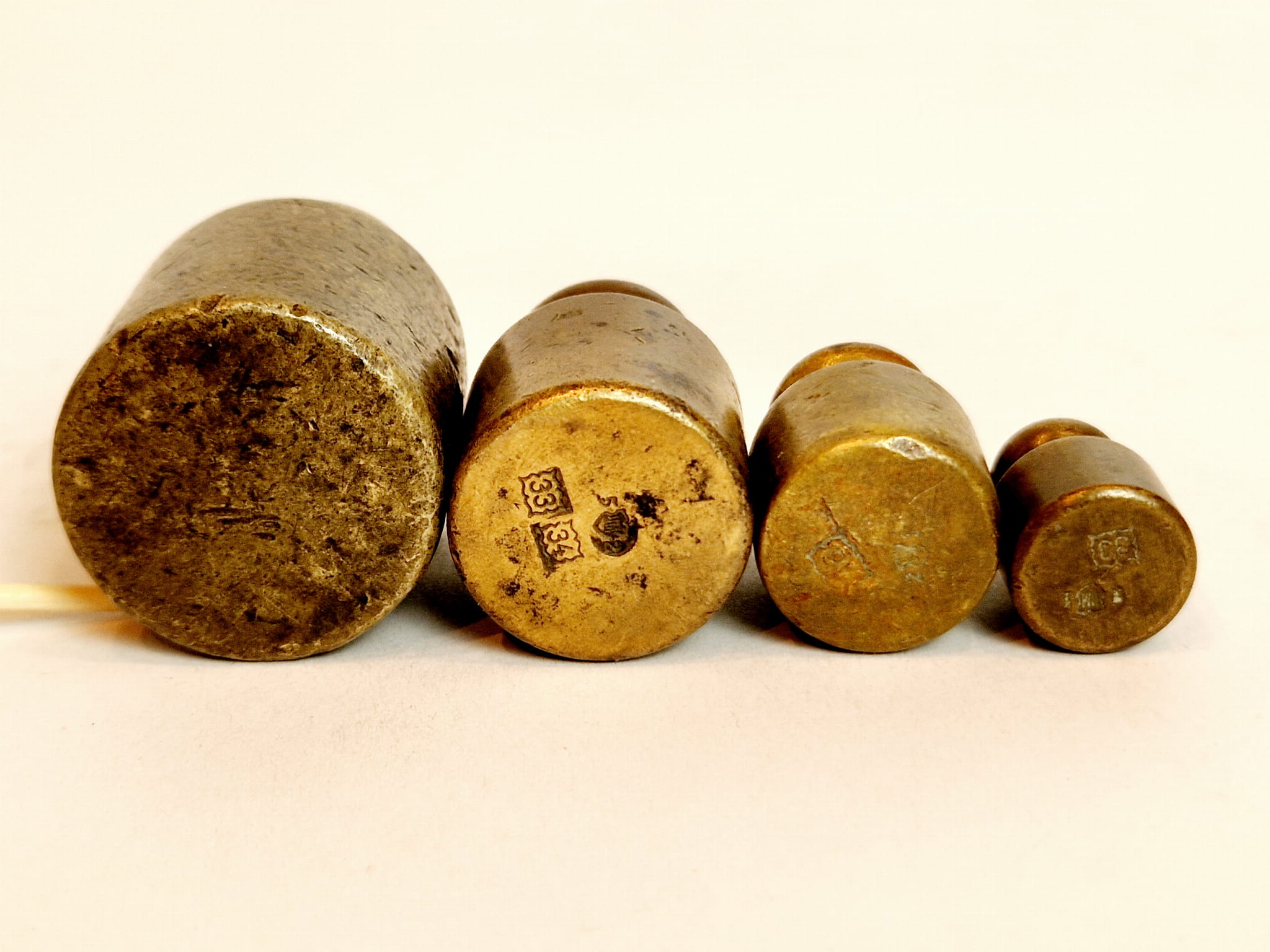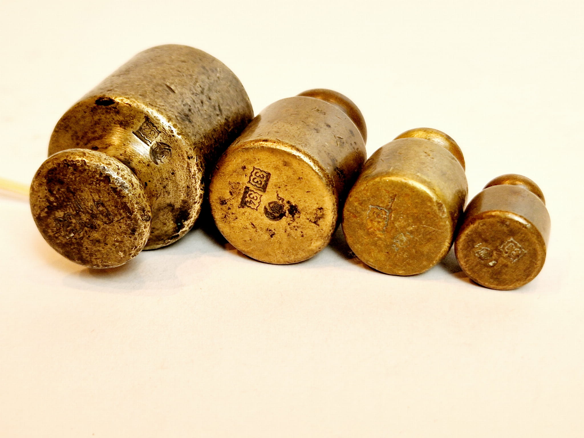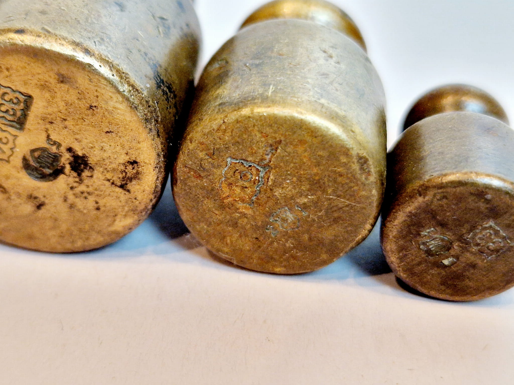 Odważniki nie były czyszczone - pokryte są oryginalną, starą, ciemną patyną.